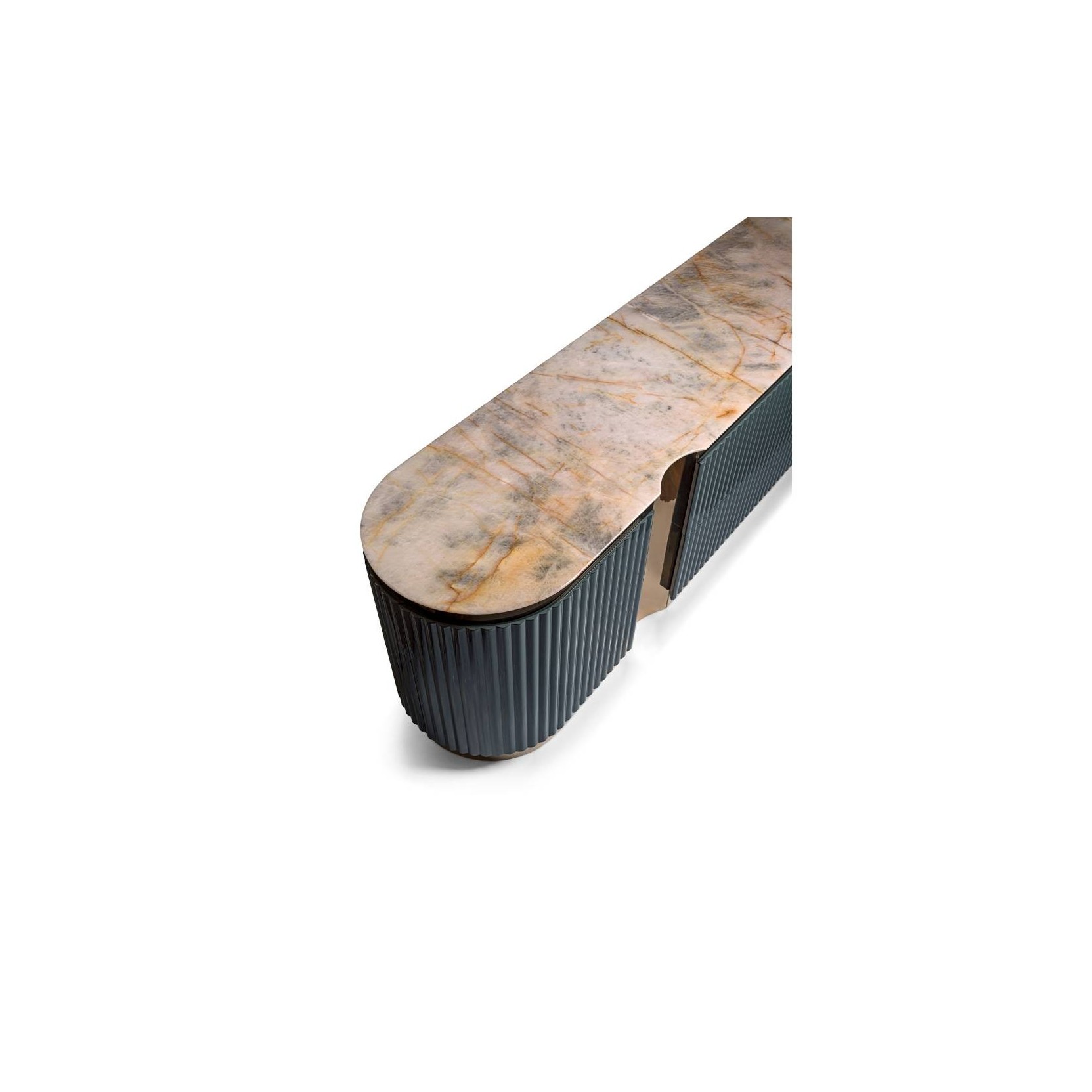 Chest of drawers with two drawers and two doors opening on the curved sides. Structure in wood composed by plinth, undertop profile and sustaining frame in curved polished staineless steel, alternating concave and convex shapes. Doors and sides decorated with hand-carved cannetté motif in low relief. They can be lacquered with polish finish in RAL/NCS colours. Internally lacquered in mat RAL/NCS colours. Decorative profiles in curved stainless steel available with any finish included in the metal finish selection. Top in polished marble with bevelled lower edge. Available with internal LED lighting in the side compartments.