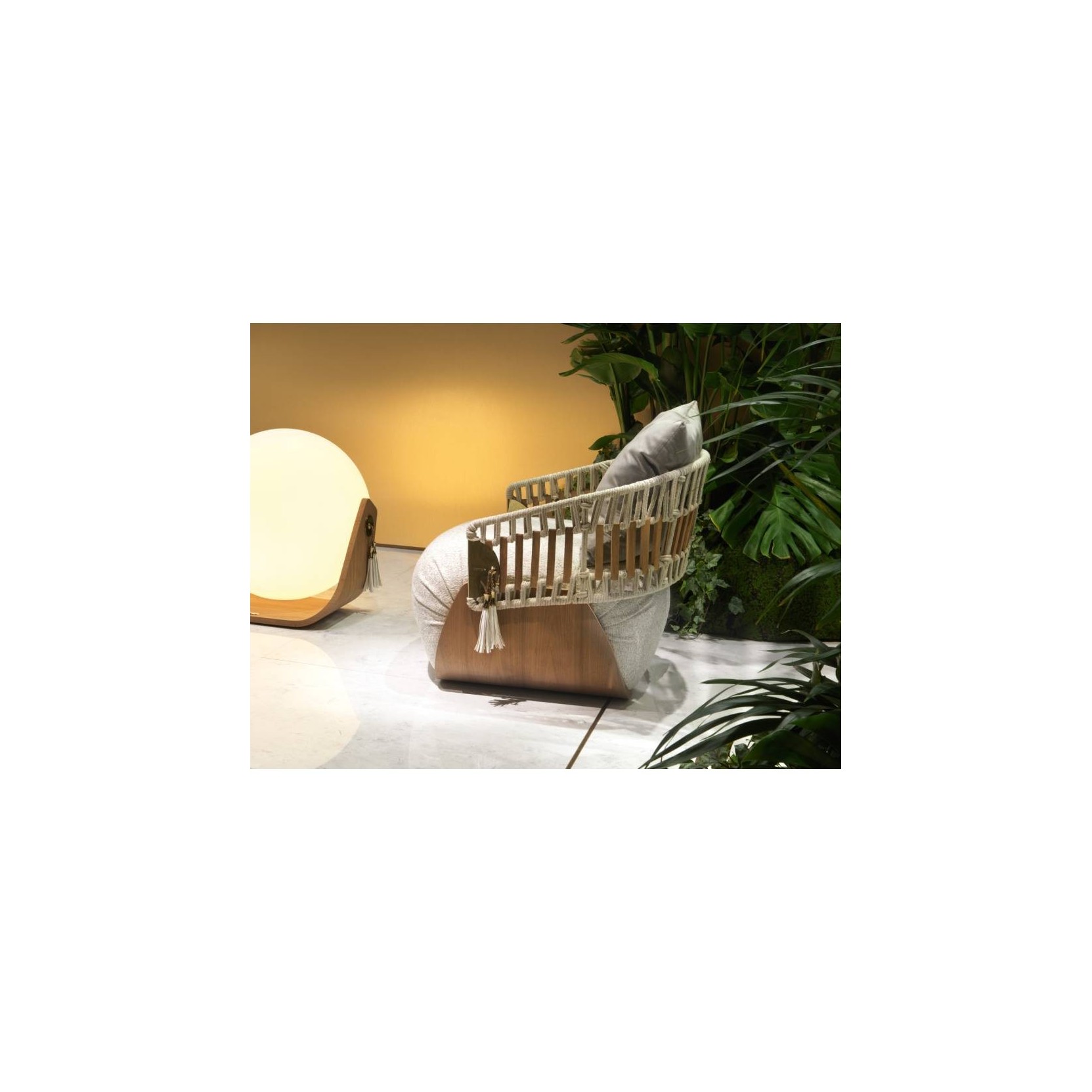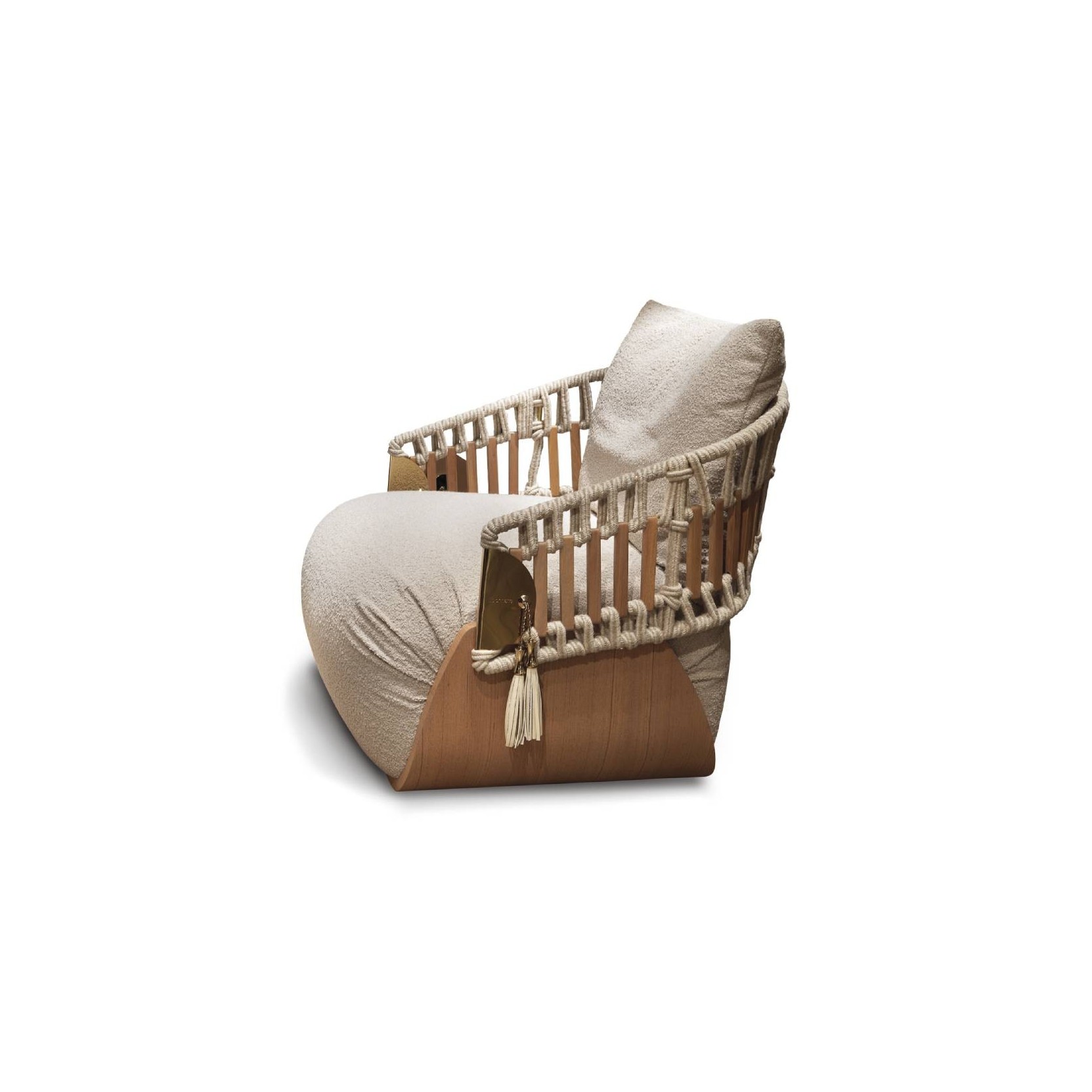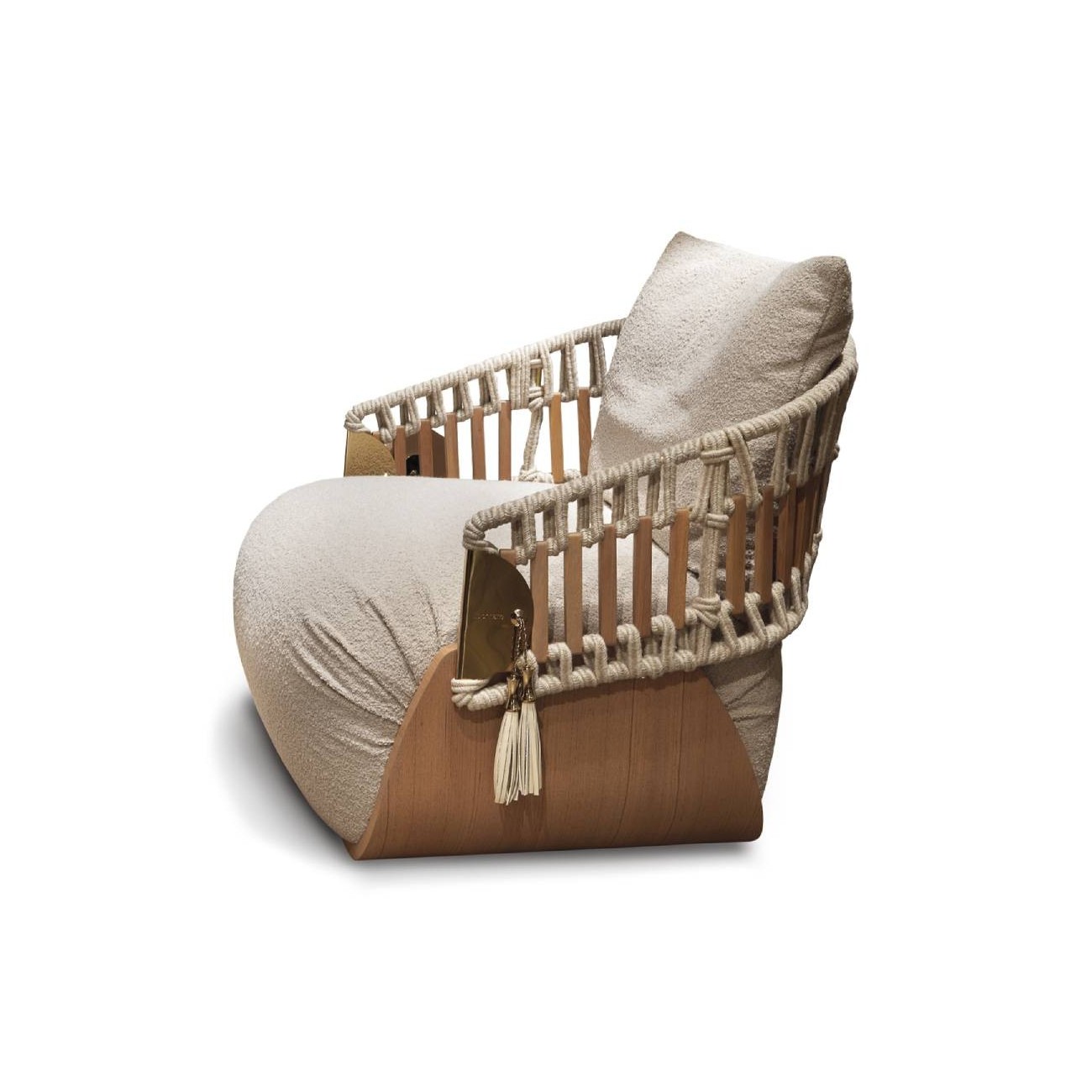 Outdoor sofa and armchair, base structure in curved marine plywood covered with teak containing a seat cushion in polyurethane foam in different densities, upholstered in fabric or leather for outdoor use. Curved backrest made of brass and stainless steel structure, woven with natural linen rope and solid teak rods. Decorative coat of arms on the armrests with leather and brass tassels. Loose cushions for the back in acrylic flakes, in leather or outdoor fabric.