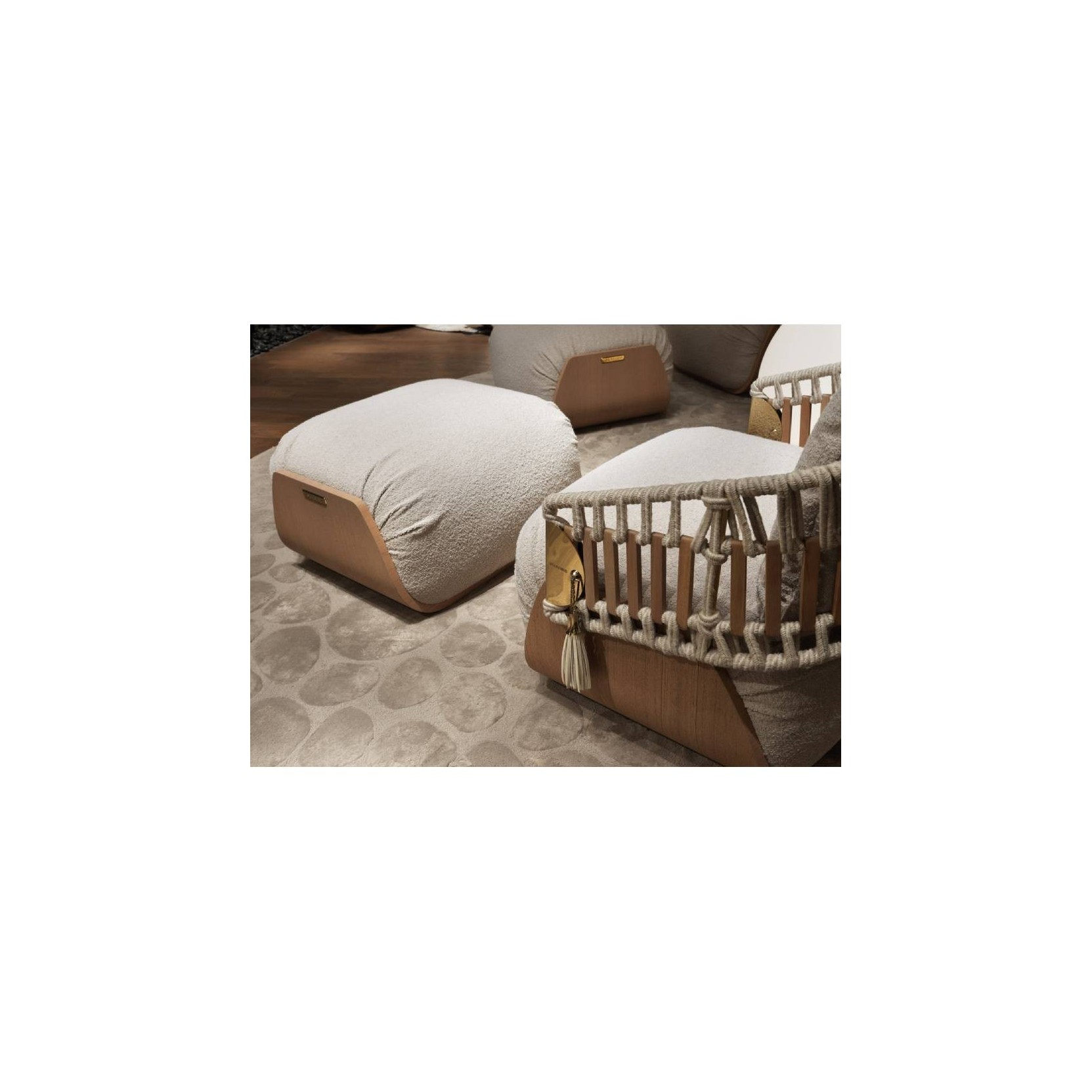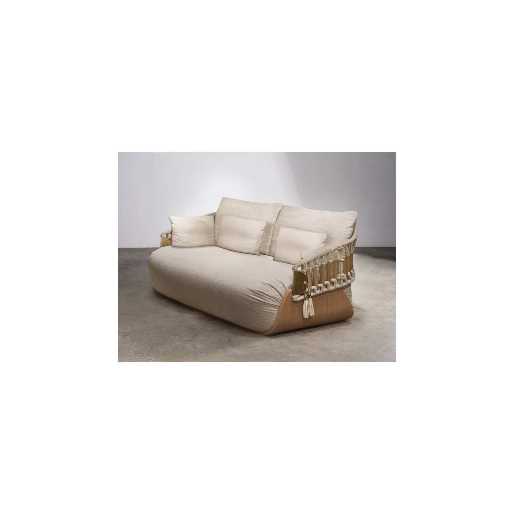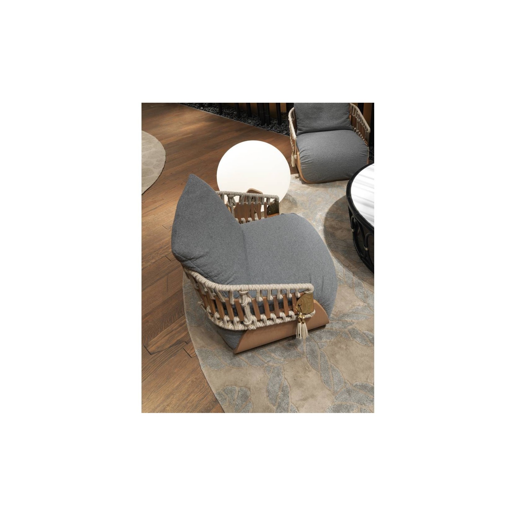 Outdoor sofa and armchair, base structure in curved marine plywood covered with teak containing a seat cushion in polyurethane foam in different densities, upholstered in fabric or leather for outdoor use. Curved backrest made of brass and stainless steel structure, woven with natural linen rope and solid teak rods. Decorative coat of arms on the armrests with leather and brass tassels. Loose cushions for the back in acrylic flakes, in leather or outdoor fabric.