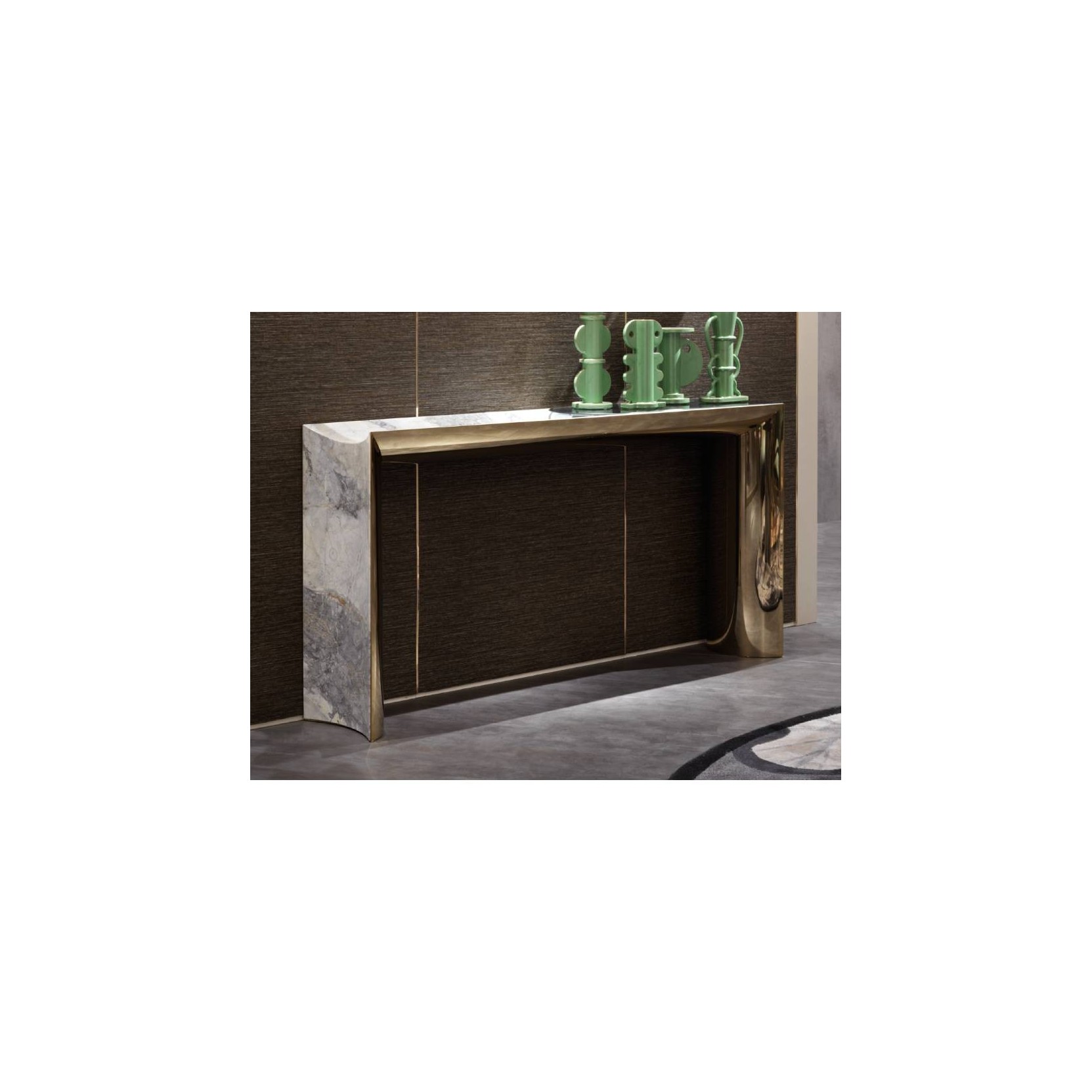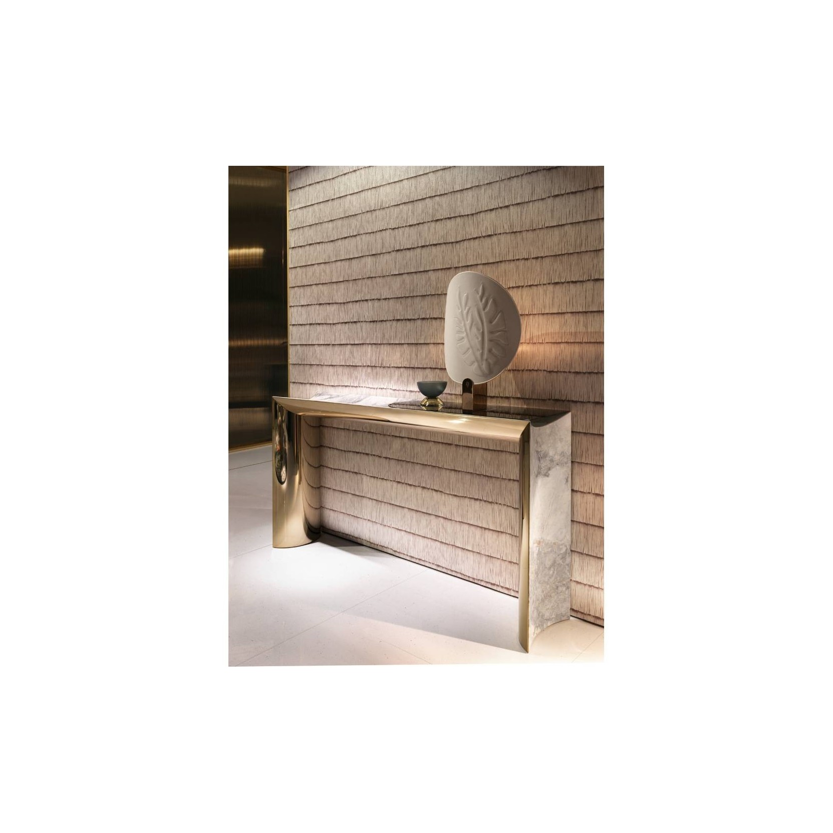 Console in wood with polished veneered concave legs and top, the inside part is covered in curved polished stainless steel. Upper top in smoked crystal. Metal parts available in the metal finishing selection, wooden parts available in the veneer selection finishings.