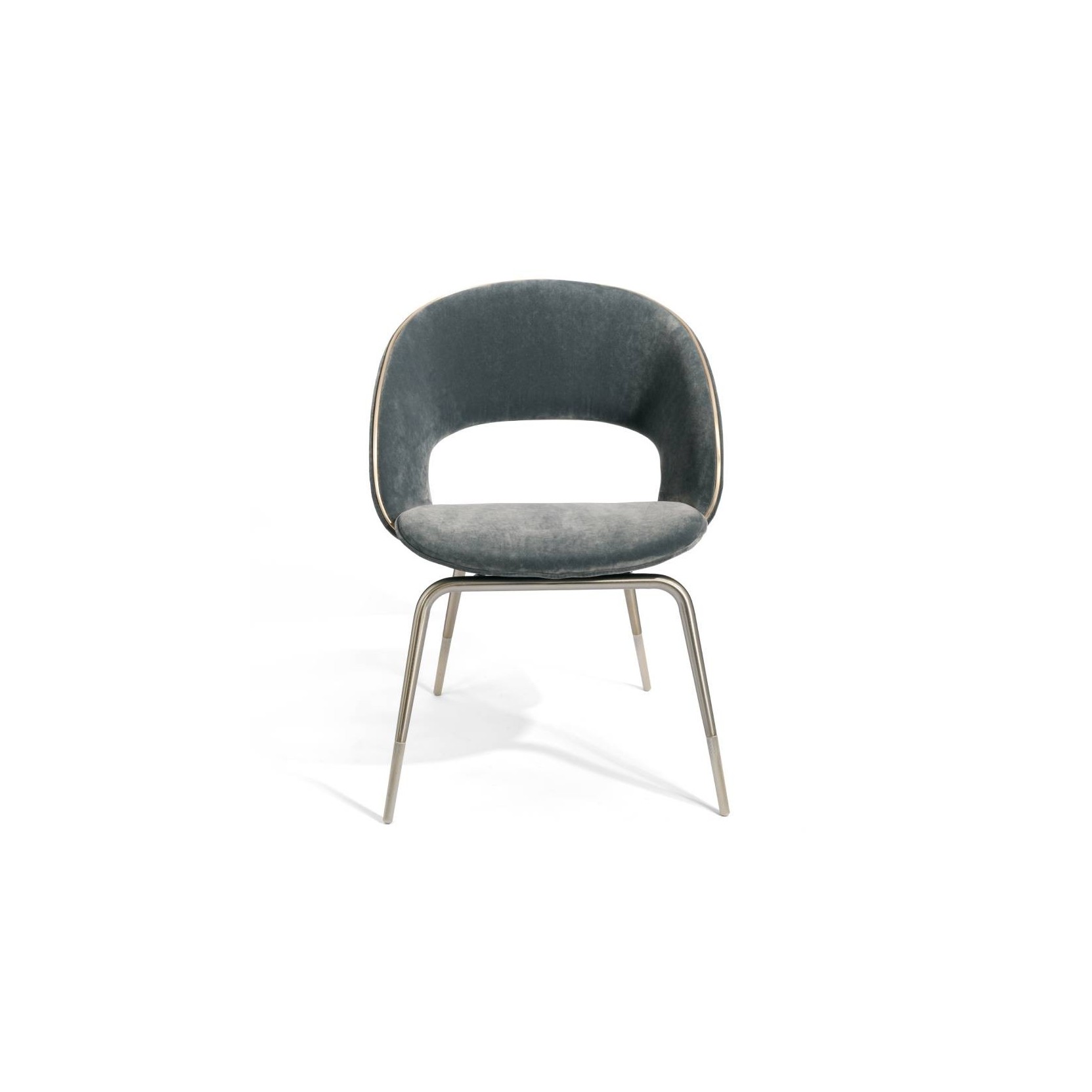Chair in curved wood, legs in conic-shaped metal tube and turned feet. Quilted upholstery in leather or fabric and backrest piping made in satin aluminium. Metal parts can be finished with any lacquer of the metal finish collection.