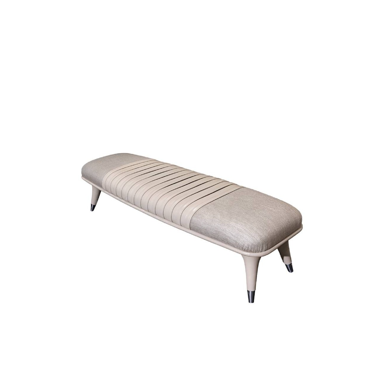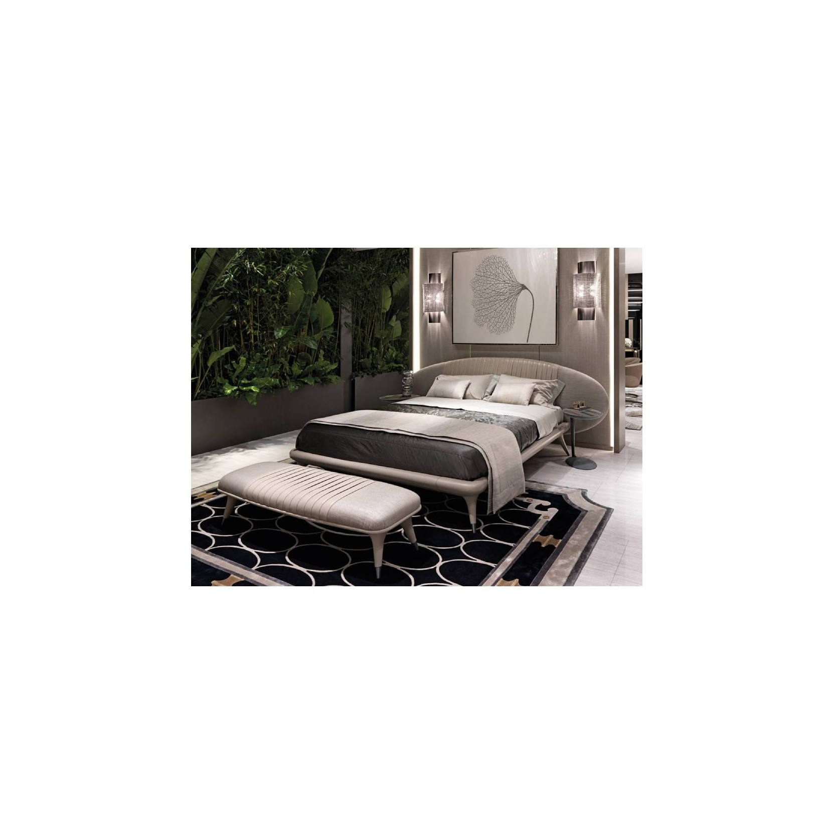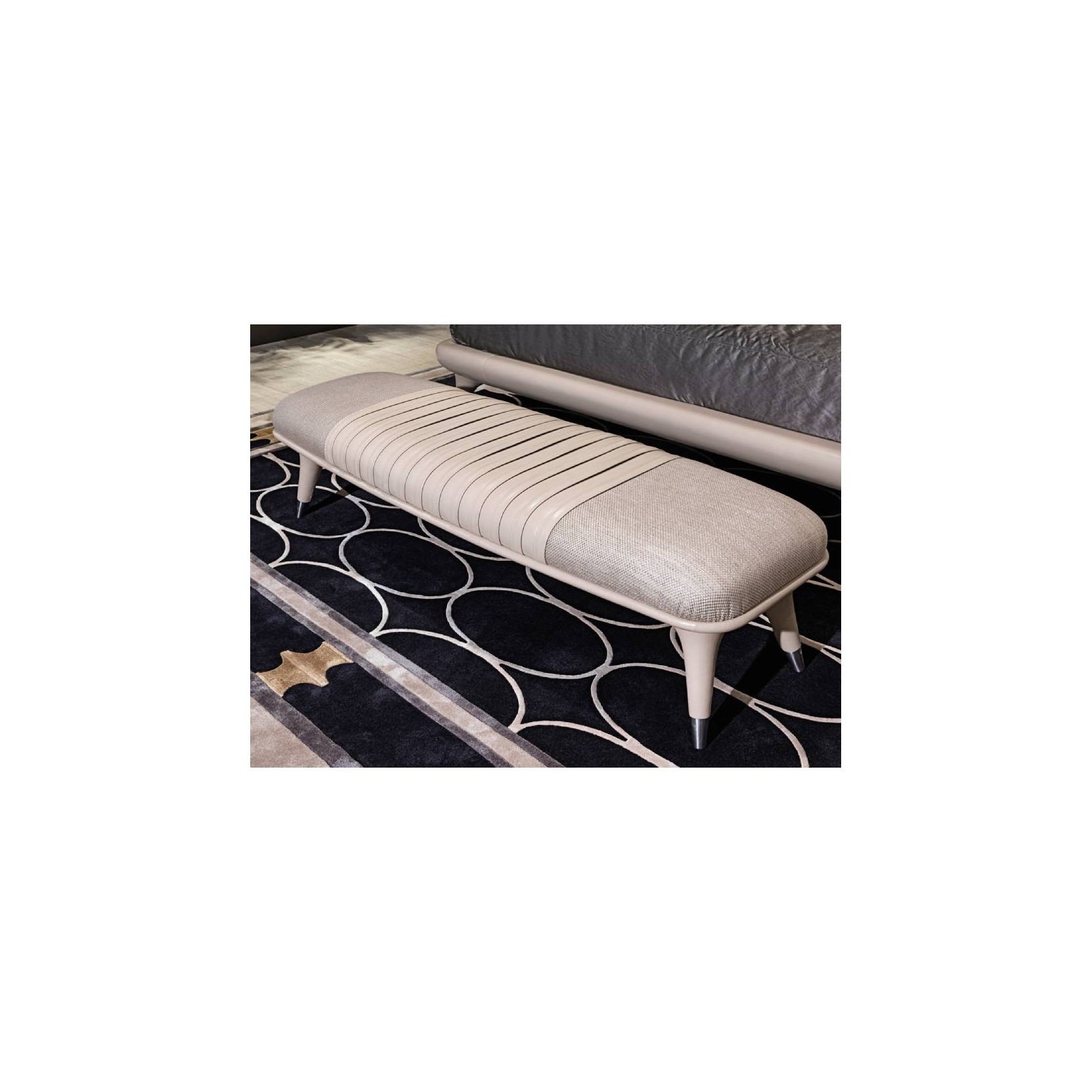 Bench upholstered in leather or fabric. Structure in solid wood carved and upholstered in leather with conic-shaped feet with satinized metal tips. Seat with central part in leather decorated with pleated motive and lateral parts in leather or fabric. Leathers available: Nabuk, Soft, Malta, Sherwood, Classic. Satinized metal parts available in the metal finishing selection.