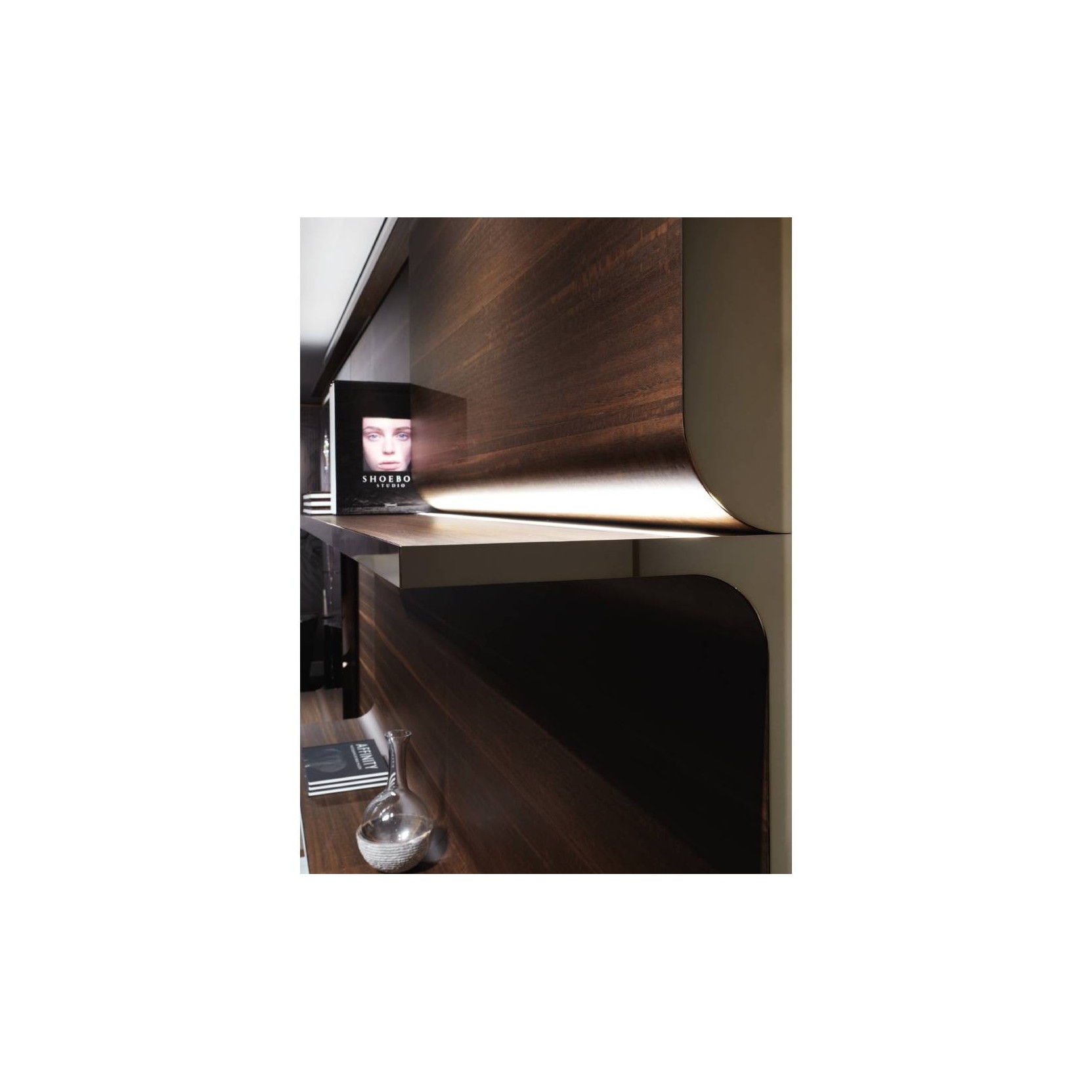 Wall-mounting system designed upon request; it consists of wooden panels with curved profiles, alternating convex and concave shapes, shelves and backlit profiles. Each profile or shelf has an edge in stainless steel. It can be wall mounted by means of pre-assembled slats and panels. Equipped with diffused light and under-shelves lights. Metal parts can be lacquered in any colour of the polished metal finish selection; wood parts can be finished with any veneer of the veneer selection or with RAL/NCS colour lacquering.