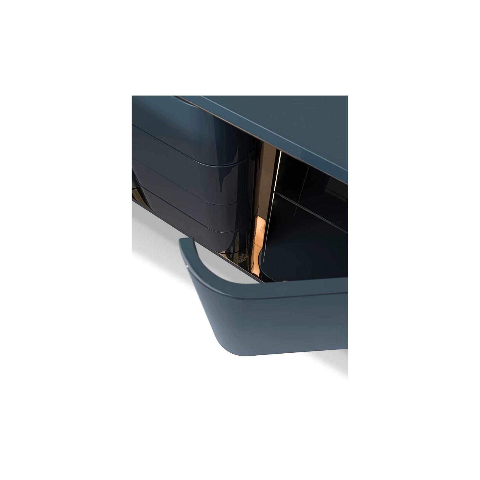 High unit with four doors and four drawers in polish lacquered wood (RAL/NCS colours) with convex sides. Internally lacquered tone on tone, shelves in extra clear glass, optional internal LED light available. Decorative friezes and feet in metal can be lacquered in any colour included in the metal finish selection.