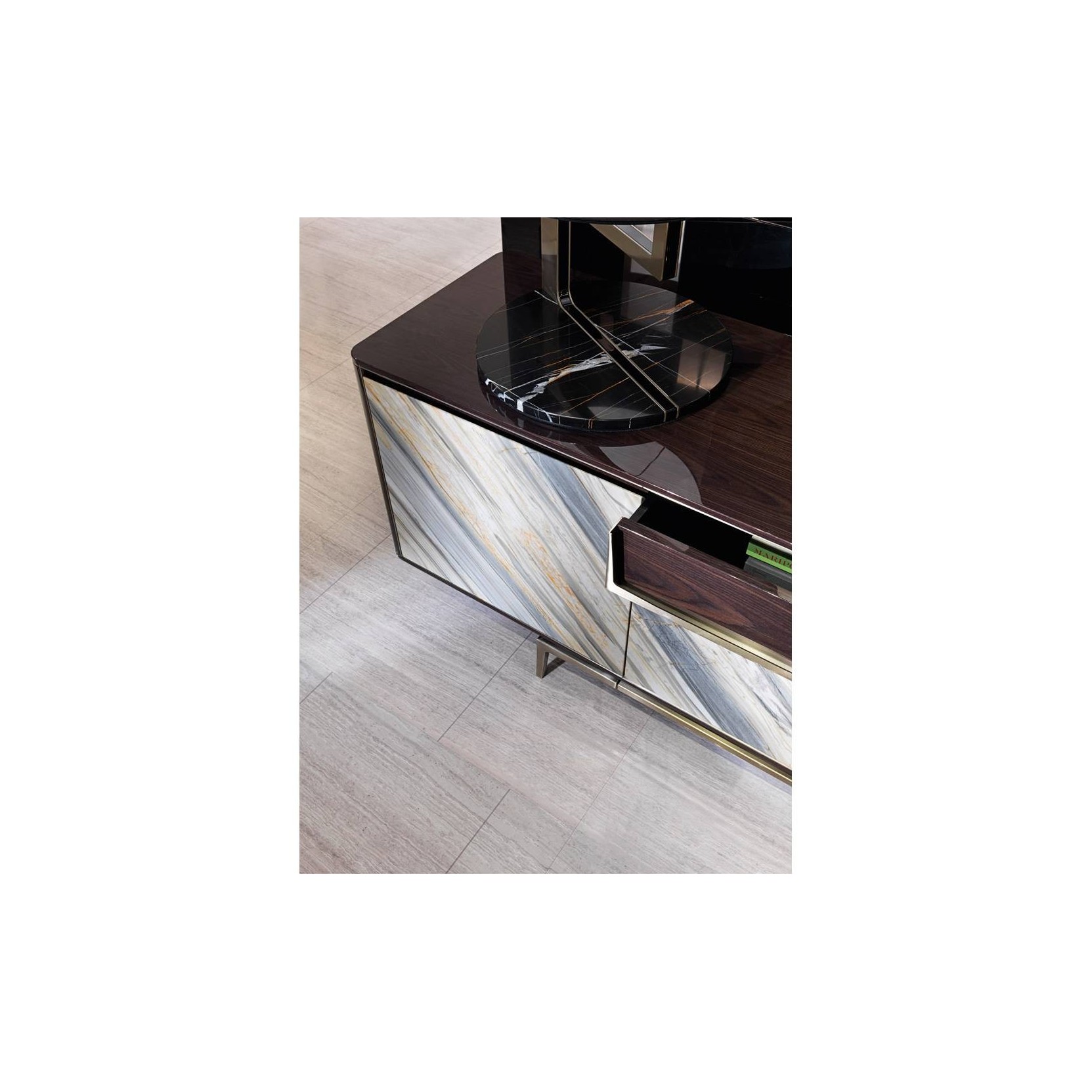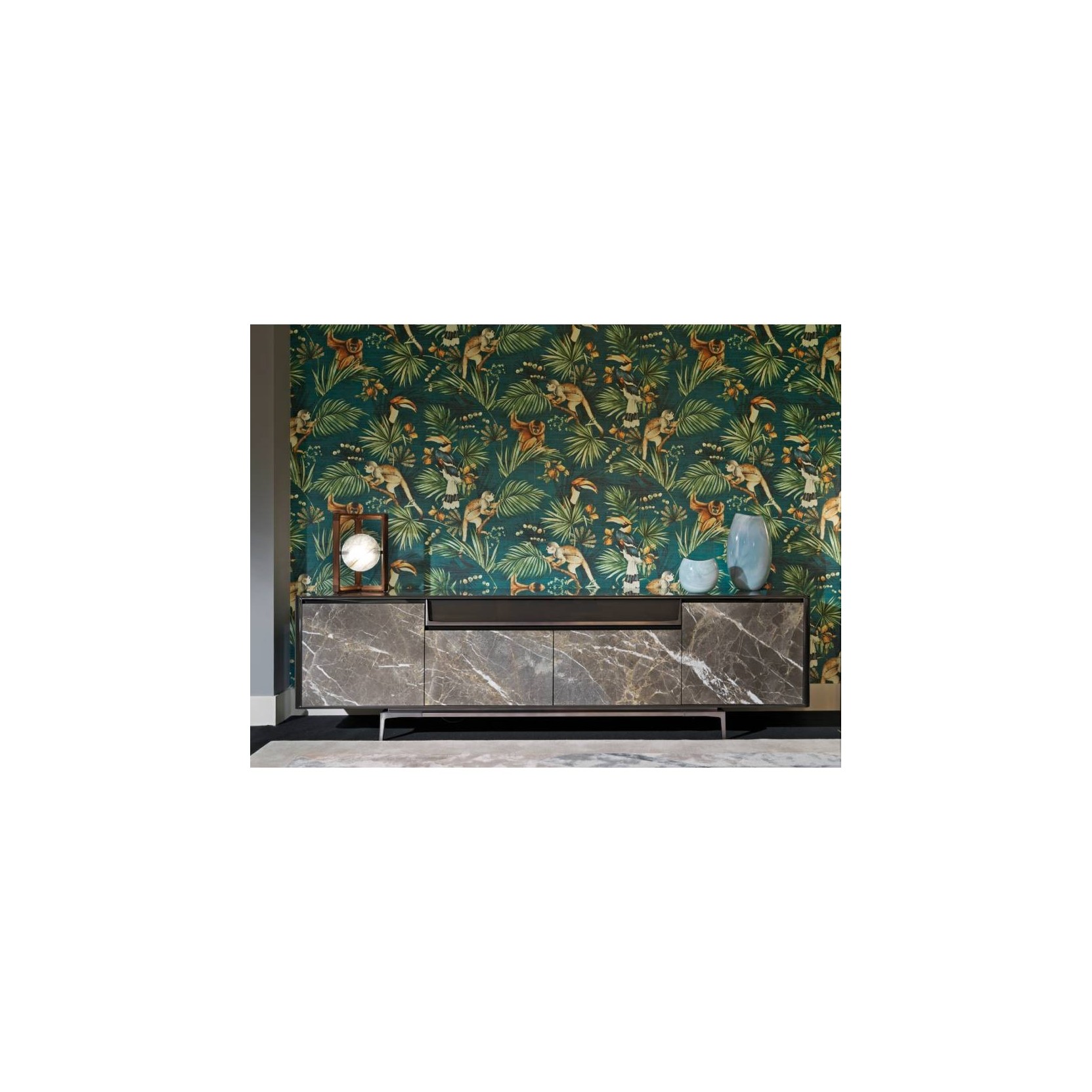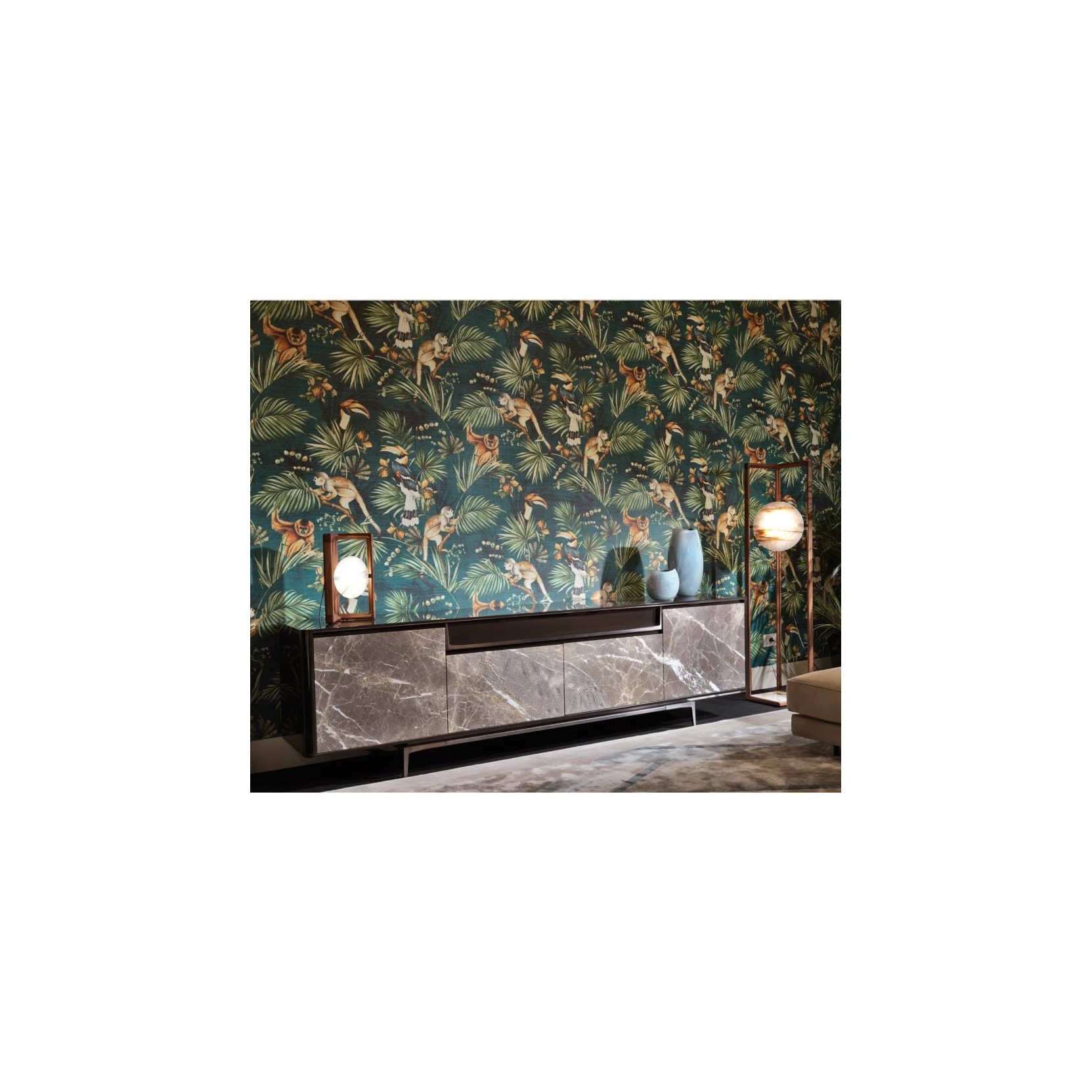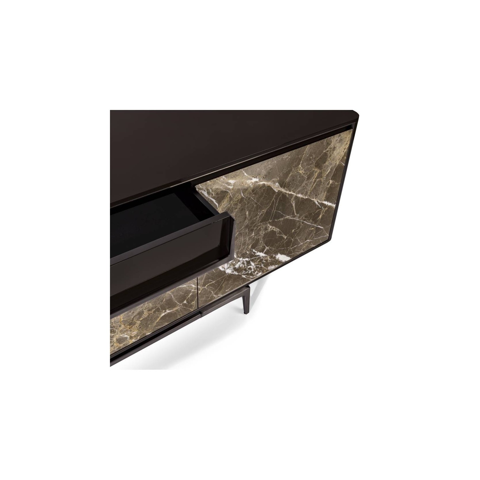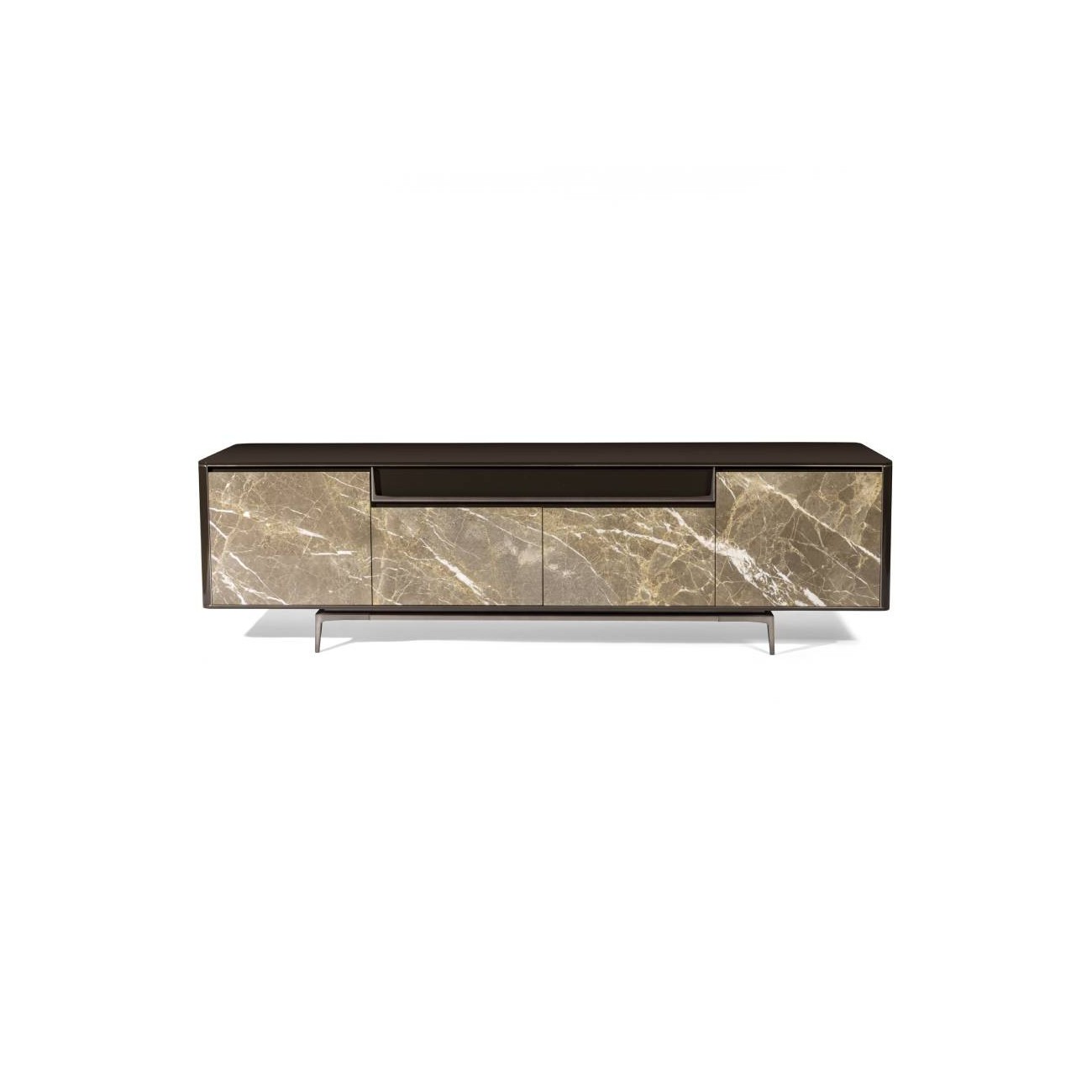 Low unit with 4 doors and 1 drawers, structure in MDF covered with wood veneer with inserts in satin stainless steel encased in the wood. Doors in marble. Internally lacquered with mat finish; backrest lacquered with mat finish, also available covered in wood veneer upon request. Steel parts available with any finish included in the satin metal finish selection. Doors in marble Colle Mandina can also be finished with Snake decorative micro-reflief engraving.