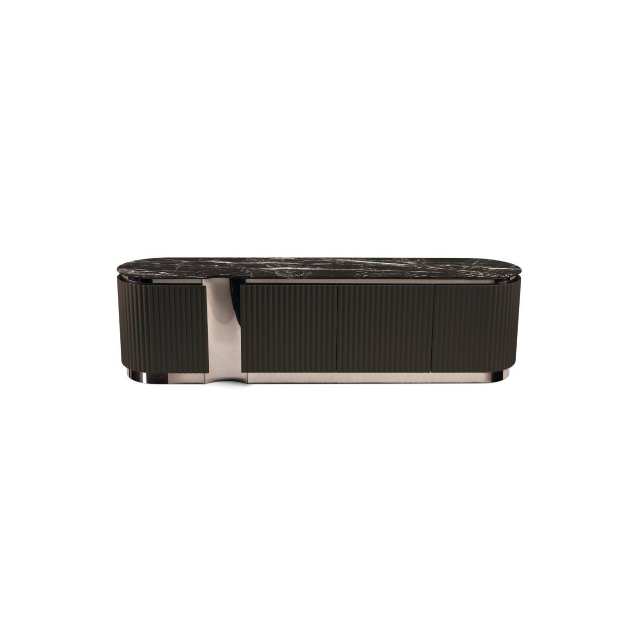 Low unit with four doors and curved sides, structure in wood with plinths, under-top profile and supporting pillar covered in shiny stainless steel, curved as to design convex and concave shapes. Doors and sides decorated with ‘canneté’ stripes carved in low relief, available in one of the following finishes: shiny lacquer (RAL/NCS colours) finish; metal anthracite or metal pink gold lacquer finish; upholstered in Soft leather. Internally finished with matt RAL/NCS lacquer. Decorative profiles in curved stainless steel can be finished with any lacquer of the metal lacquer finish selection. Counter top in polished marble with bevelled lower profile. Optional: internal LED lights.