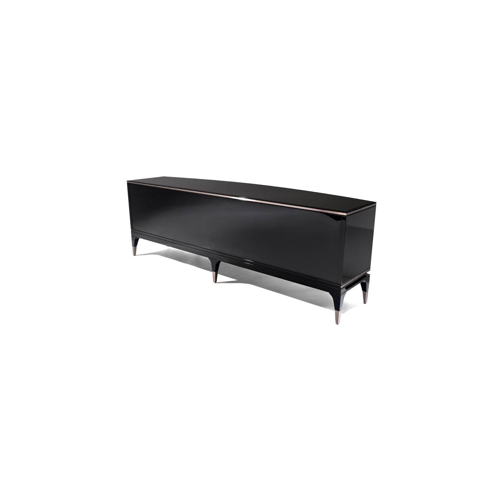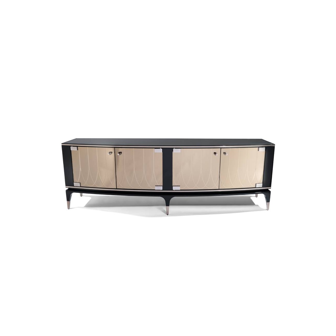 Panay è una madia in legno laccato lucido, quattro ante in specchio (naturale - bronzo - fumé) curvato e inciso, con maniglie in alluminio.‎ Top in vetro nero o a specchio in tinta con le ante, profili di top e base e piedini in acciaio inox lucidato.‎