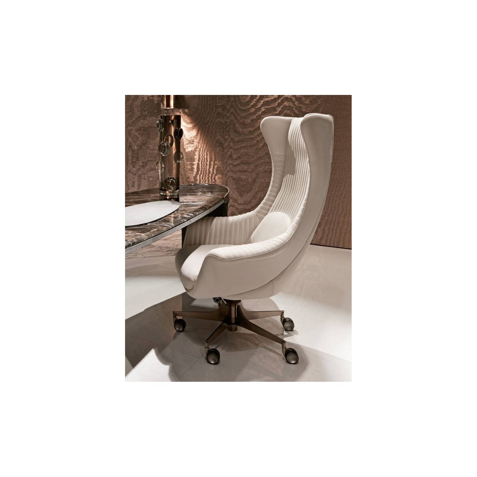 Supporting frame in shaped plywood and solid wood; seat with elastic belt spring system. Seat and armrest padding with different densities. Upholstery in leather, armrests and backrest cover decorated with quilted embroidery and perforation pattern. Curved external structure upholstered in leather. Base in stainless steel with 5 wheels, turnings in aluminium. Rotary piston damper with self-locking drive system and adjustable height. Base can be finished with any lacquer of the metal lacquer finish selection.