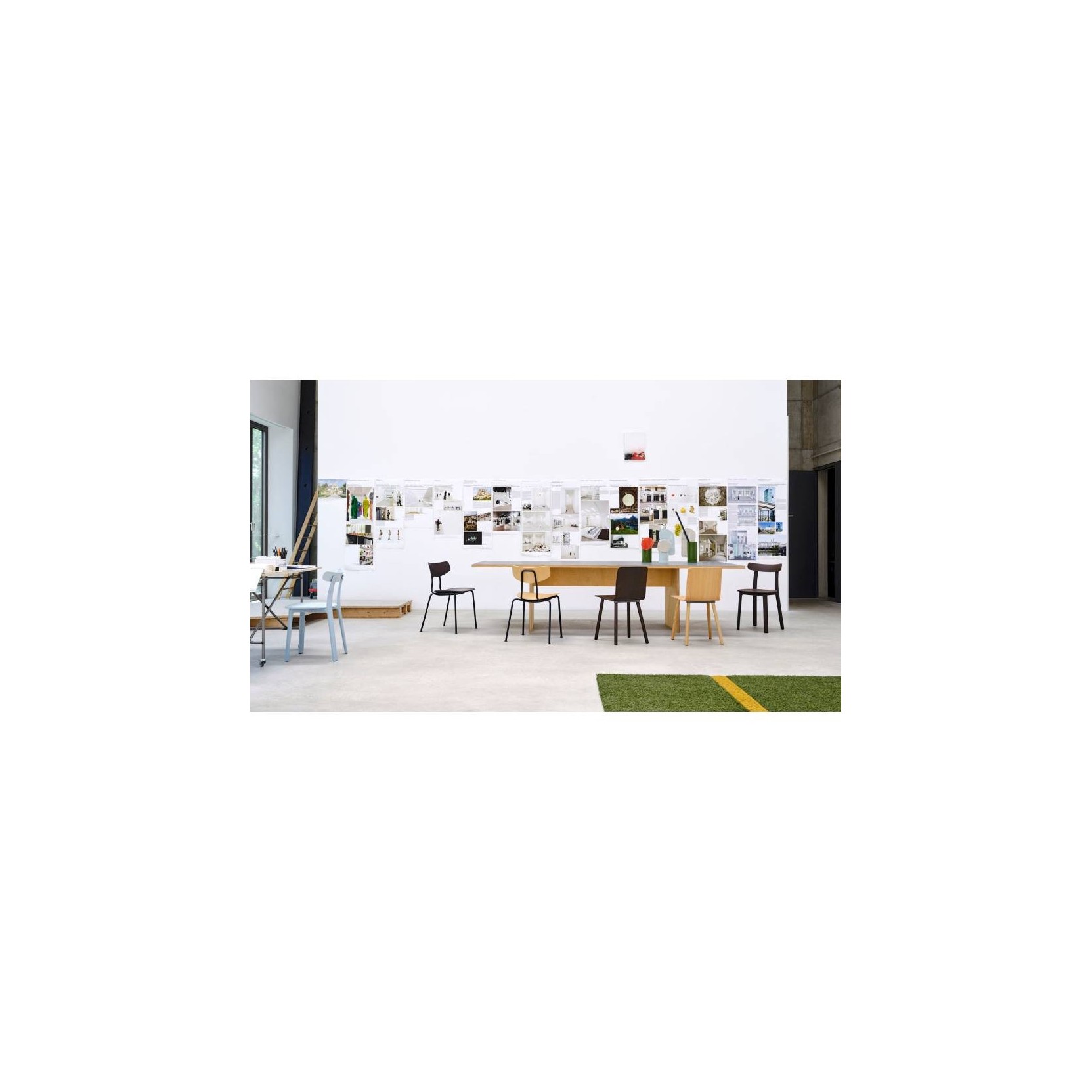 Moca is a lacquered stackable open back oak chair. The Moca chair is an expression of British designer Jasper Morrison's 'super normal' approach to design: understated, useful and responsible. It follows that Moca is nothing new and revolutionary, but unites the accumulated knowledge of an experienced designer with Vitra's manufacturing expertise – and also has such an unassuming appearance that it seems to have always existed. The combination of these aesthetic features with particularly durable, high-quality materials ensures an unusually long product lifespan. The base of Moca is constructed with two arcs of steel tubing – one forming the front legs and backrest support, the other constituting the back legs. Two veneered plywood shells are mounted on the base elements to create a comfortable, anatomically shaped seat and backrest. The clever design of the stacking protector attached between the seat and backrest provides optimal protection for the veneer surface. Moca's seat shells come in natural or dark oak veneer, and the base is available in a chrome-plated version or with a highly robust, powder-coated matt enamel finish. Moca meets all of the standard norms and is therefore suited for use not only in private settings, but also in restaurants and other public spaces.
