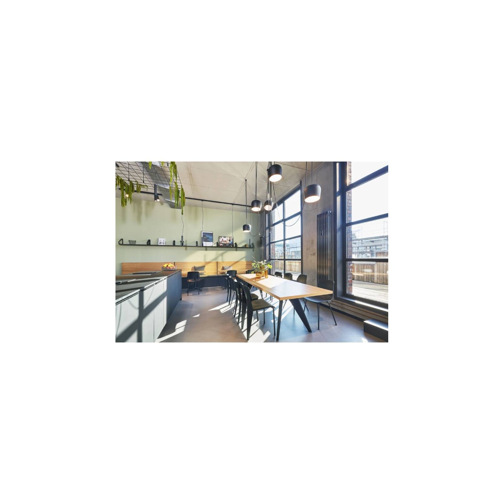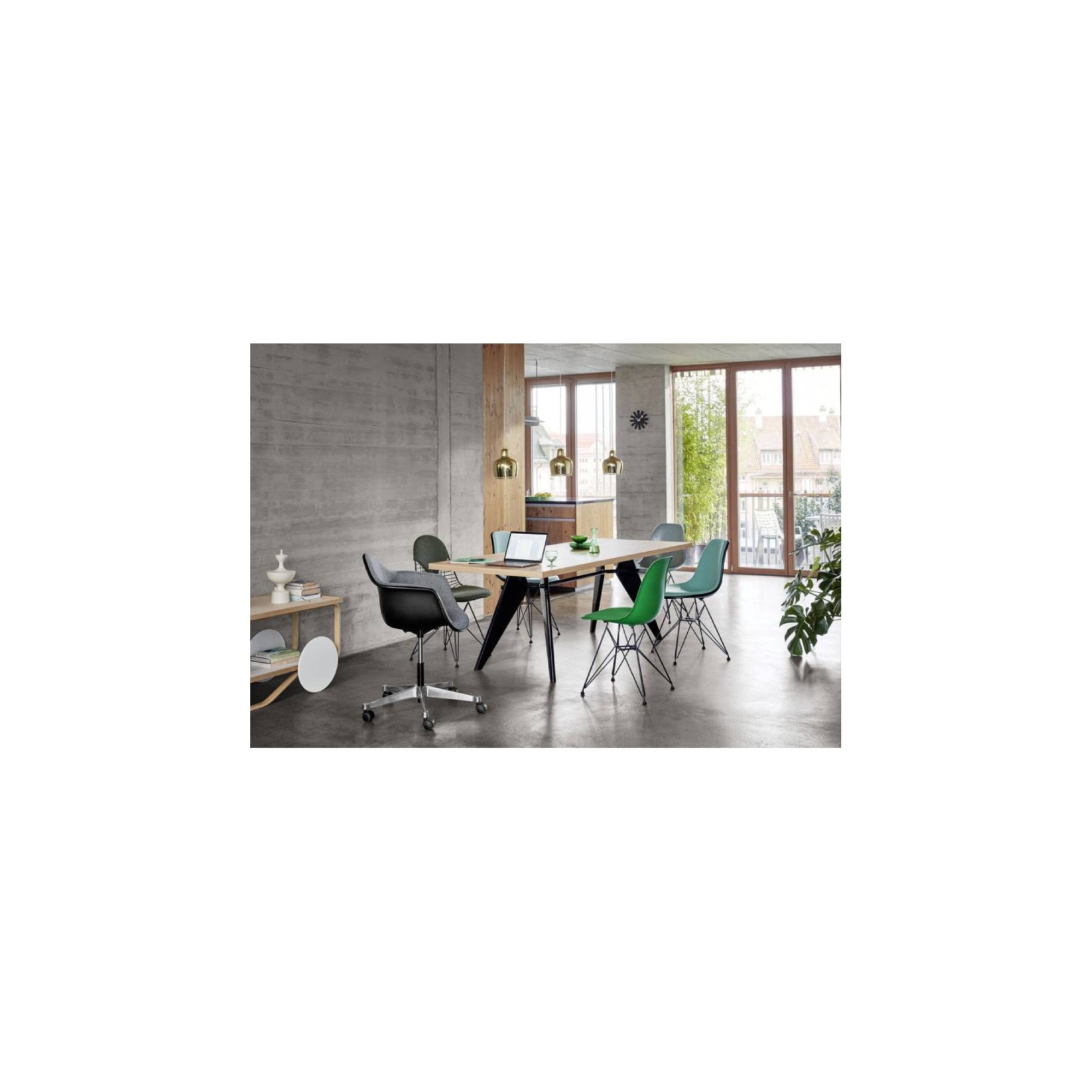 The designer and engineer Jean Prouvé developed the EM Table around 1950 for the project 'Maison Tropicale'. Adhering to the aesthetics of necessity, even the smallest details of this table are determined by its construction. The canted legs are connected by a crossbar, illustrating the structural forces and flow of stresses in a way that is typically seen only in engineering structures. The EM Table is available with table tops in solid wood, robust HPL laminate or – for tops measuring 2000 or 2400 mm in length – wood veneer.