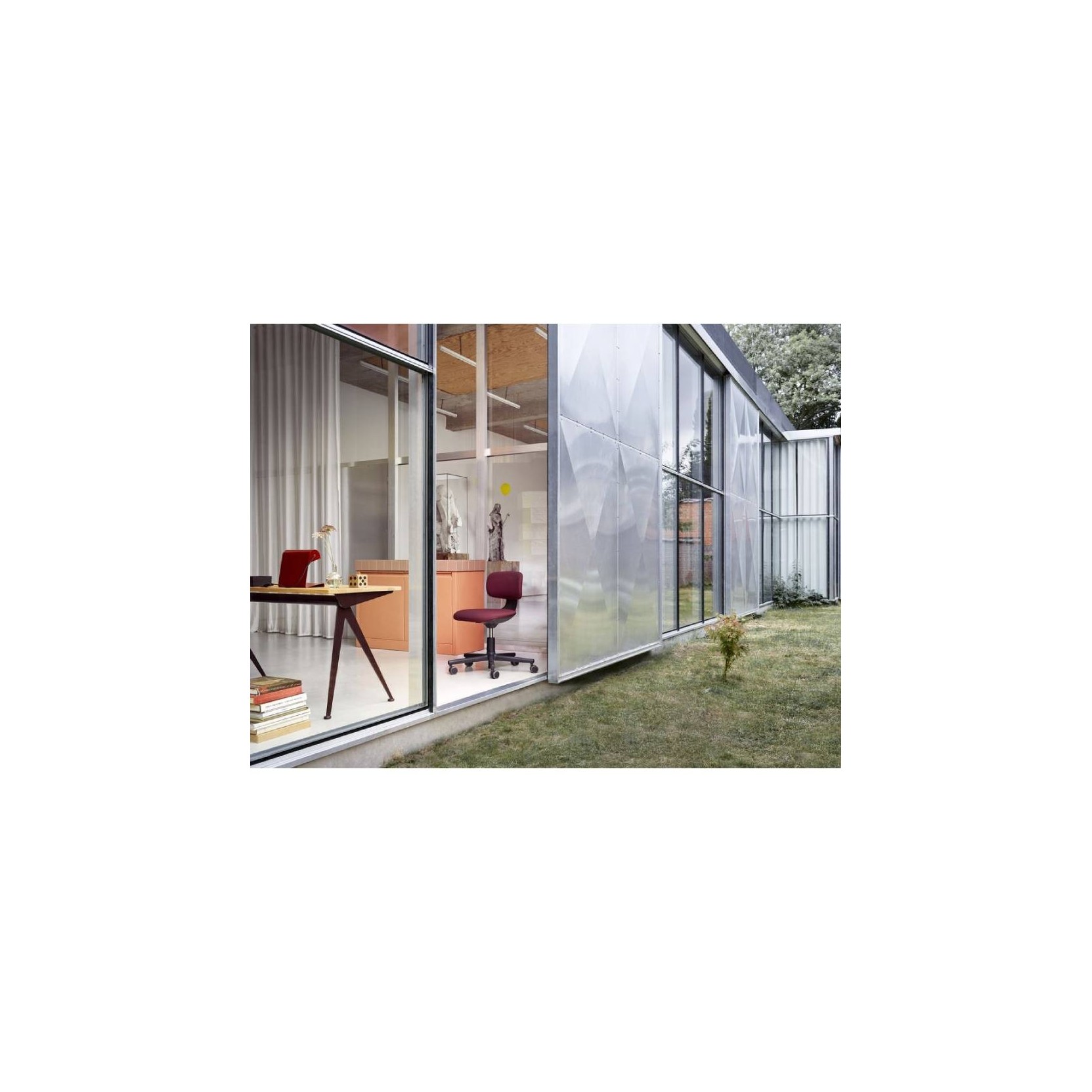 The slender, elegantly splayed metal legs of the Compas Direction desk by Jean Prouvé call to mind the hinged arms of a compass – ‘le compas’ in French. Their design is based on engineering principles that typify the structural approach of the French designer and engineer. Paired with the oiled solid wood table tops, they form a richly contrasting mix of materials in the home office.