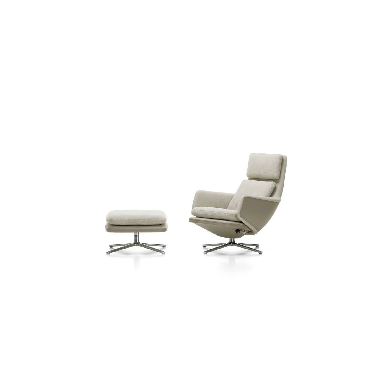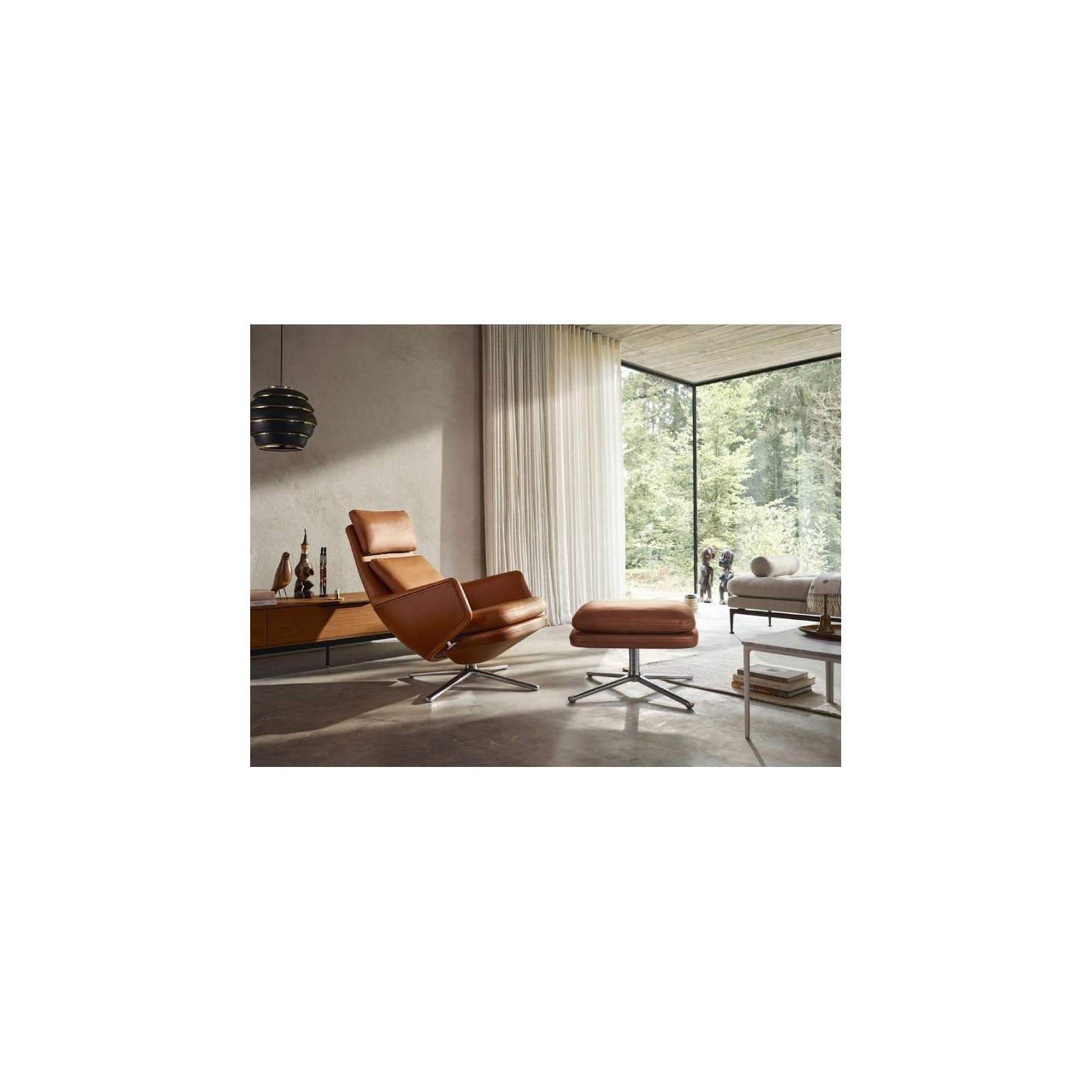 Grand Relax is a luxurious reclining lounge chair combining outstanding comfort with compact dimensions and a classic understated aesthetic.‎ The exceptional seating experience offered by this chair stems from the harmonious interplay of diverse elements and its conception as a leather-upholstered furnishing.‎ High-quality covers in leather or fabric encase the soft seat and back cushions, which sit loosely on the lounge chair and snugly envelop the sitter.‎ When sitting down, the user sinks slowly into the cushions, while a concealed integrated mechanism absorbs the weight and moves the chair into a reclined position.‎ The seat and backrest move independently in synchronised motion.‎ A control knob can be rotated to adjust the resistance of the mechanism, and the backrest can be locked at any angle.‎ Mounted on an elegant four-star base made of aluminium, the lounge chair can be rotated 360°.‎ A matching ottoman is available as a footrest or additional seating option.‎ Grand Relax features a combination of choice materials, such as cast aluminium, elegant fabrics and high-quality leather.‎ Antonio Citterio developed the armchair with the material foremost in mind, and wanted the cushions to have a 'lived-in' look.‎ He therefore selected particularly soft cushions that give each armchair an individual, relaxed appearance – especially with leather covers, which acquire an appealing patina with visible creases over time.‎ The lower half of the outer backrest shell is covered with embossed split leather, forming a type of shield that enfolds the user, while defining the contours of the lounge chair.‎ The combination of split leather with the rest of the armchair creates a dynamic contrast between the armchair's inner and outer faces, which can be further accentuated with the choice of different colours.‎ Grand Relax has a compact yet inviting appearance.‎ The carefully designed proportions of the low-slung body, long armrests and upward tapering backrest visually emphasise the dynamic seating experience and emanate a comfortable feeling of security.‎