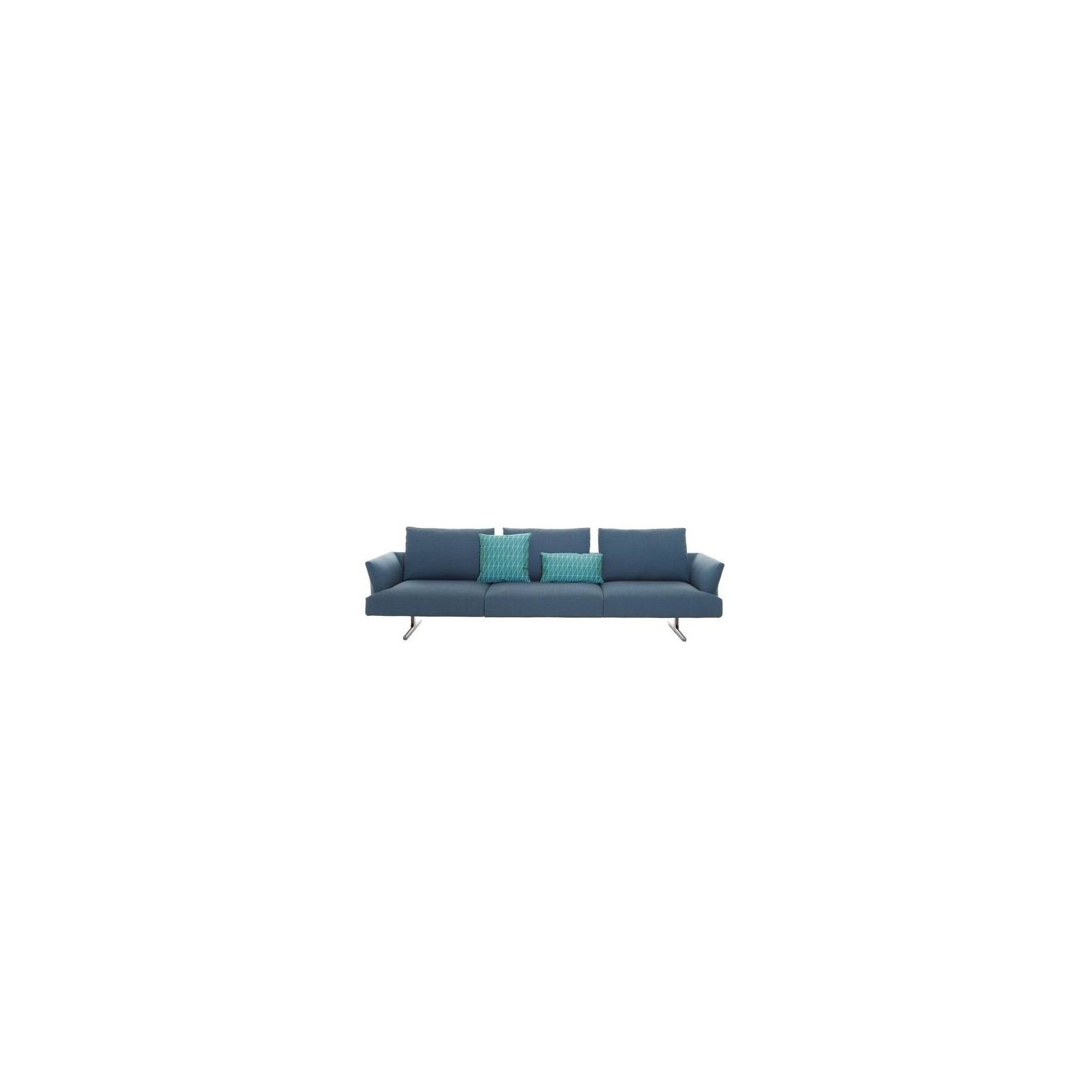 Like a true hero, this important sofa captures attention by becoming the absolute protagonist of the space in which it will be exhibited. Hiro is made up of feet in polished aluminum alloy or nickel-plated natural or black color. Steel structure. Springing on elastic bands. Structure padding in polyurethane / heat-bound polyester fiber. Seat cushion in polyurethane. Back cushion in Solotex®. Detachable lining in fabric or leather.