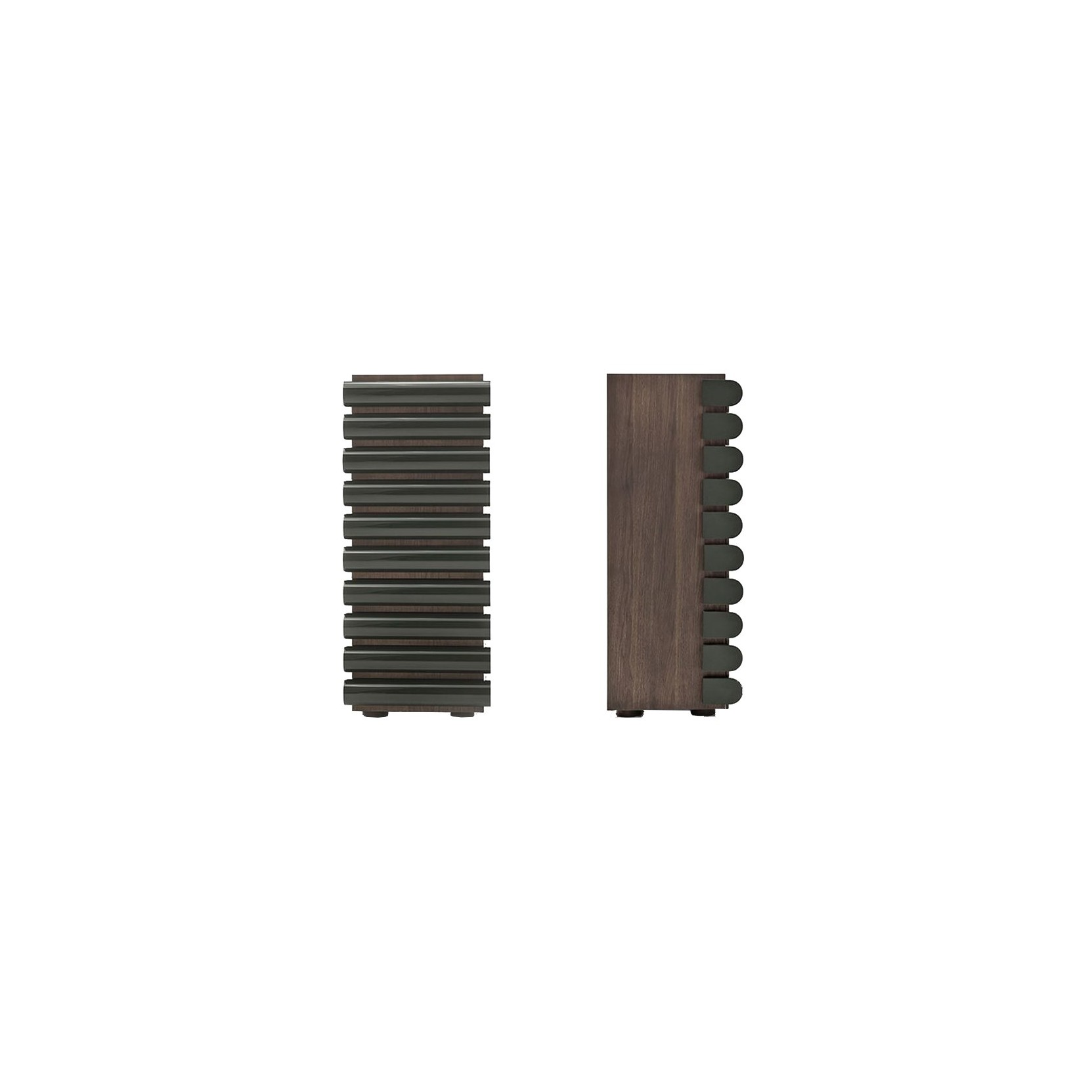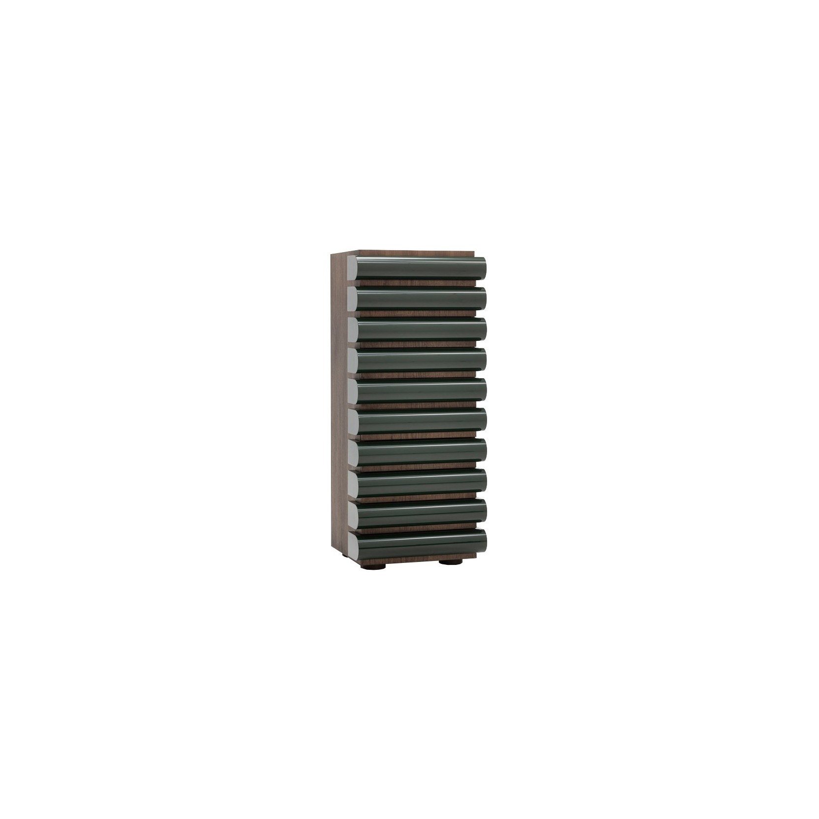 Storet, progettata da Nanda Vigo per Acerbis nel periodo 1994-2020, presenta una struttura portante in frassino nero o noce tinto scuro, abbinata a cassetti in laccato lucido disponibile in molteplici colori per un’estetica dinamica e personalizzabile. Con dimensioni di 55,6 cm di larghezza, 51,7 cm di profondità e 131,1 cm di altezza, si propone come soluzione ideale per organizzare con stile camere da letto, soggiorni o uffici, mantenendo un appeal senza tempo grazie alla cura artigianale e alla scelta materica.