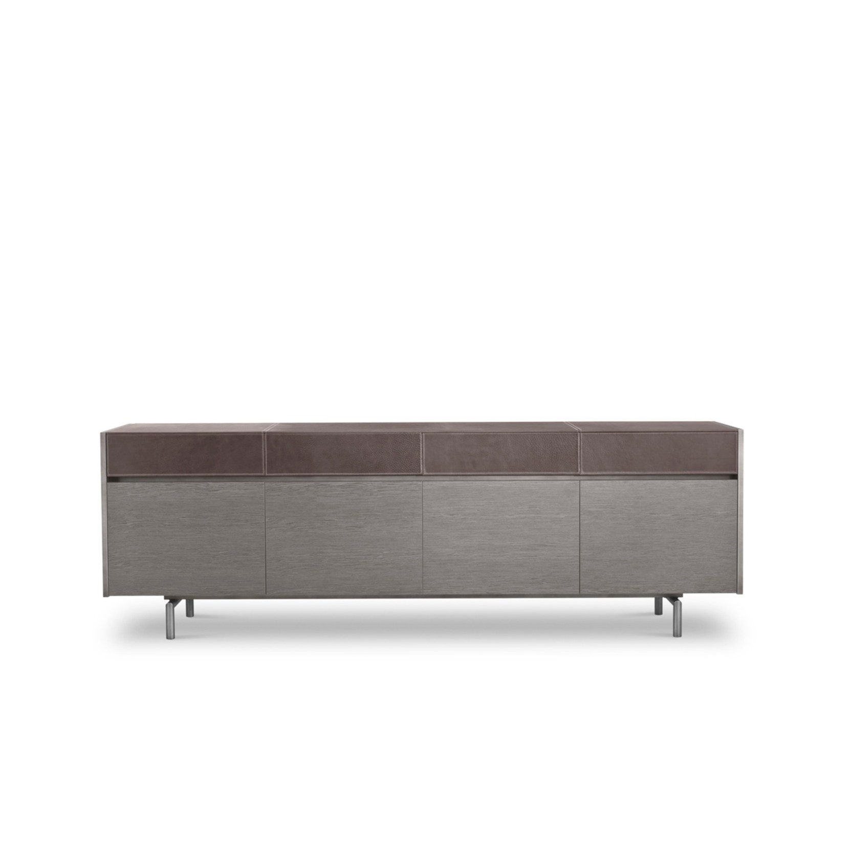 La struttura si articola in una composizione che unisce solidità e leggerezza. Il top e i frontali dei cassetti sono rivestiti in cuoio o pelle, con cuciture a contrasto che aggiungono una nota sartoriale e rendono ogni pezzo unico. Le ante sono realizzate in legno con essenze pregiate, mentre i fianchi sono laccati e rifiniti a mano con una particolare lavorazione spazzolata che restituisce profondità alla superficie. I piedini e la gola della maniglia, entrambi in metallo, introducono un elemento di precisione formale e brillantezza contemporanea. Ogni materiale impiegato nella madia Equa è calibrato nel rapporto con gli altri, generando una tensione misurata e armonica che rispecchia quella “giustizia formale” che tanto caratterizzava l'opera di Scarpa. Il risultato è un arredo dalla presenza borghese e ricercata, perfettamente integrato nel linguaggio contemporaneo ma fortemente ancorato alla tradizione del design colto e consapevole. Equa non è solo una madia: è una microarchitettura domestica che interpreta lo spazio e lo arricchisce.