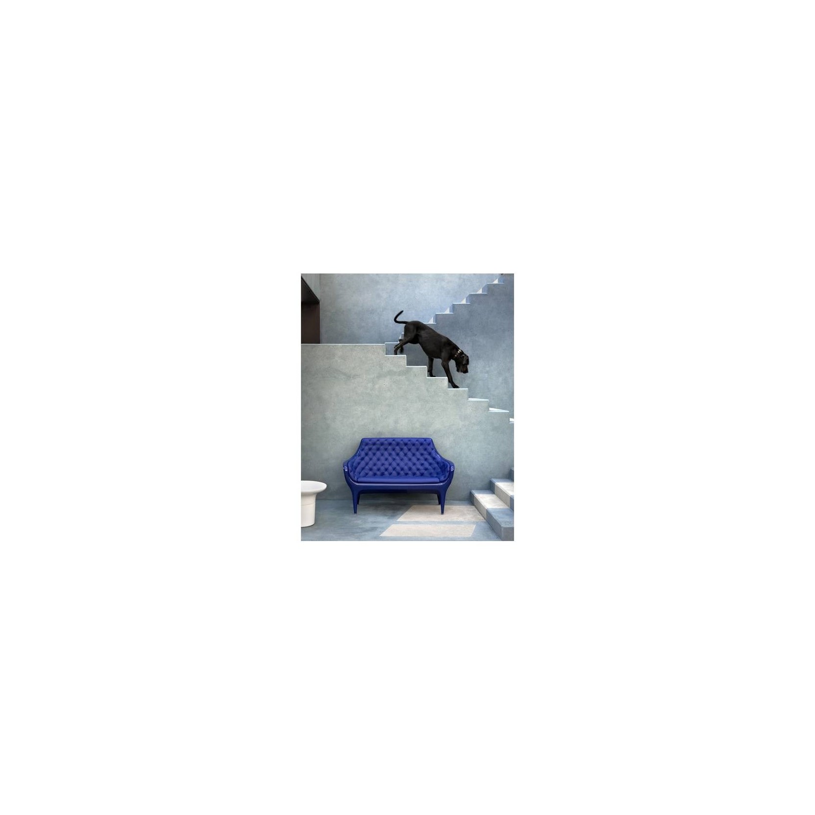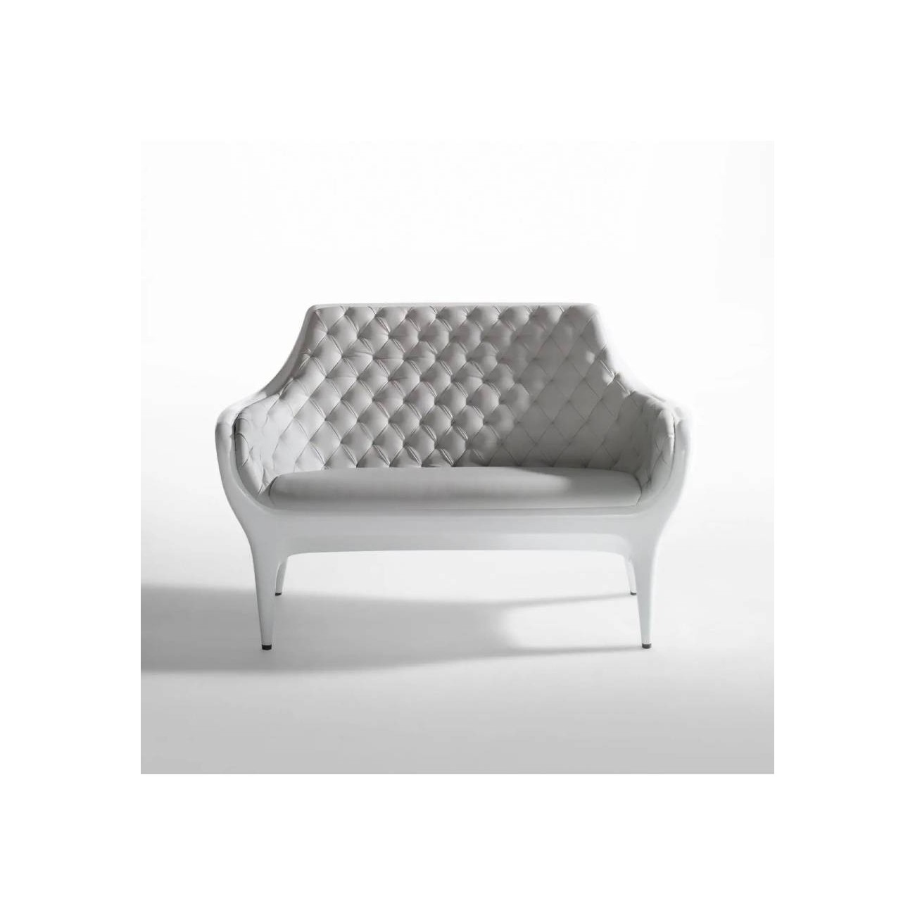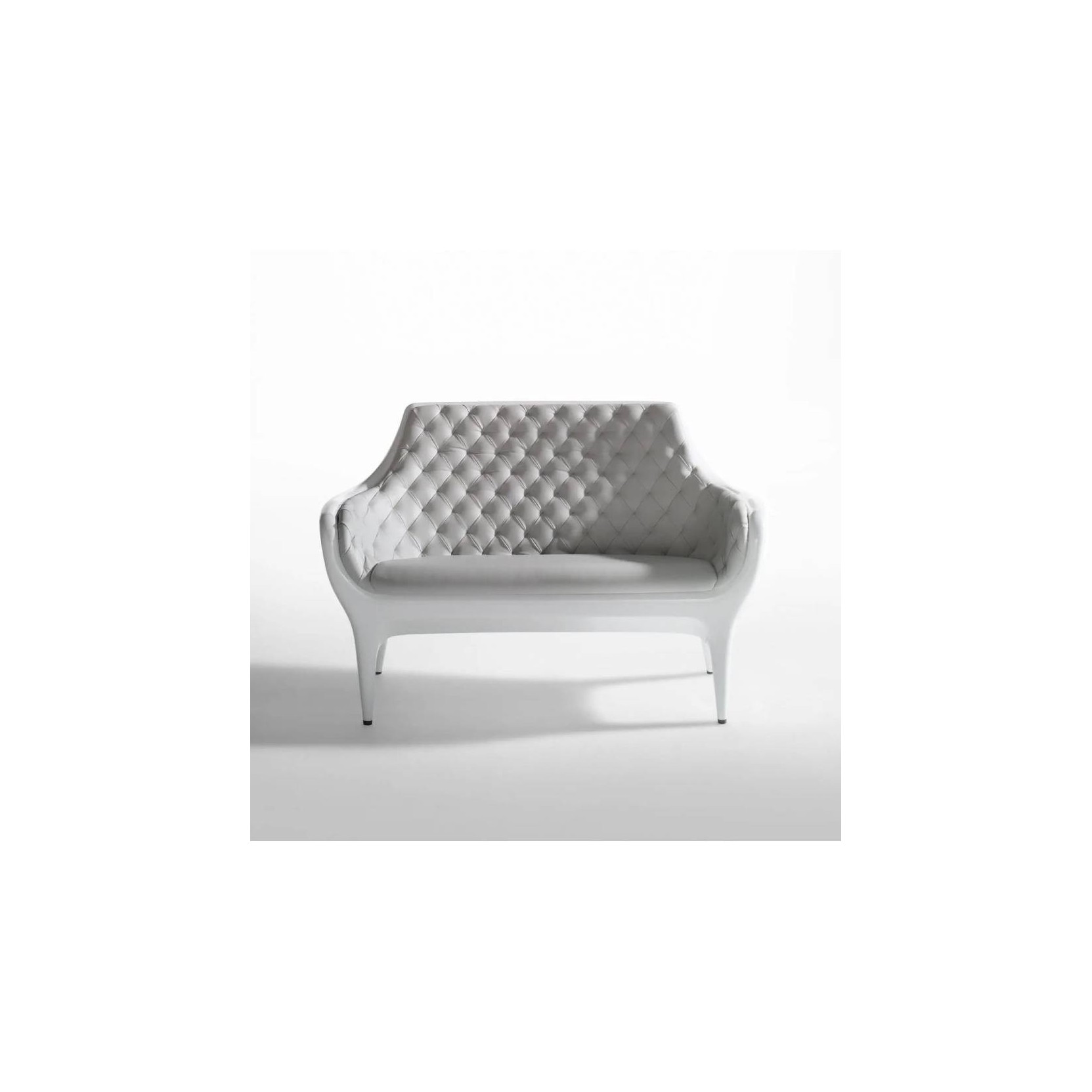 Dimensioni 73 x 145 x h.95 cm Poltrona, divano e rivestimento in polietilene stampato in rotazionale, rivestito in pelle capitoné e laccato lucido.