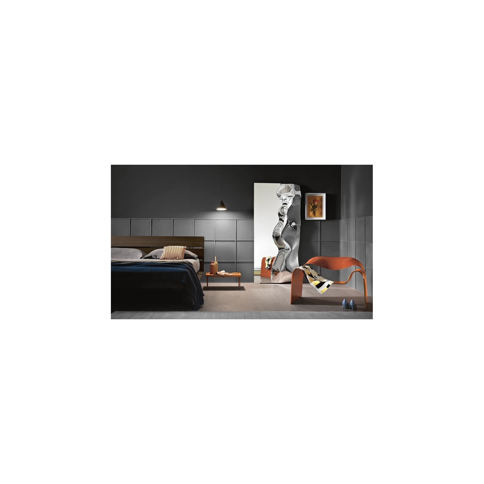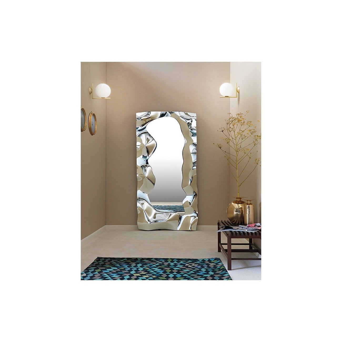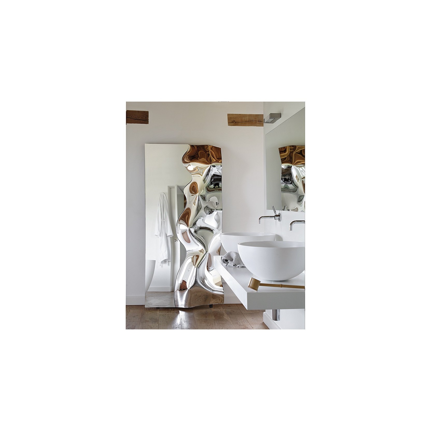 Specchio da parete in vetro fuso da 6 mm retro argentato, specchio piano da 5 mm. Telaio posteriore in metallo verniciato. Possibilità di appendimento verticale od orizzontale.