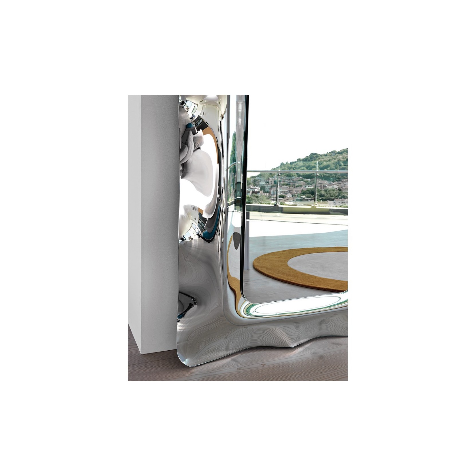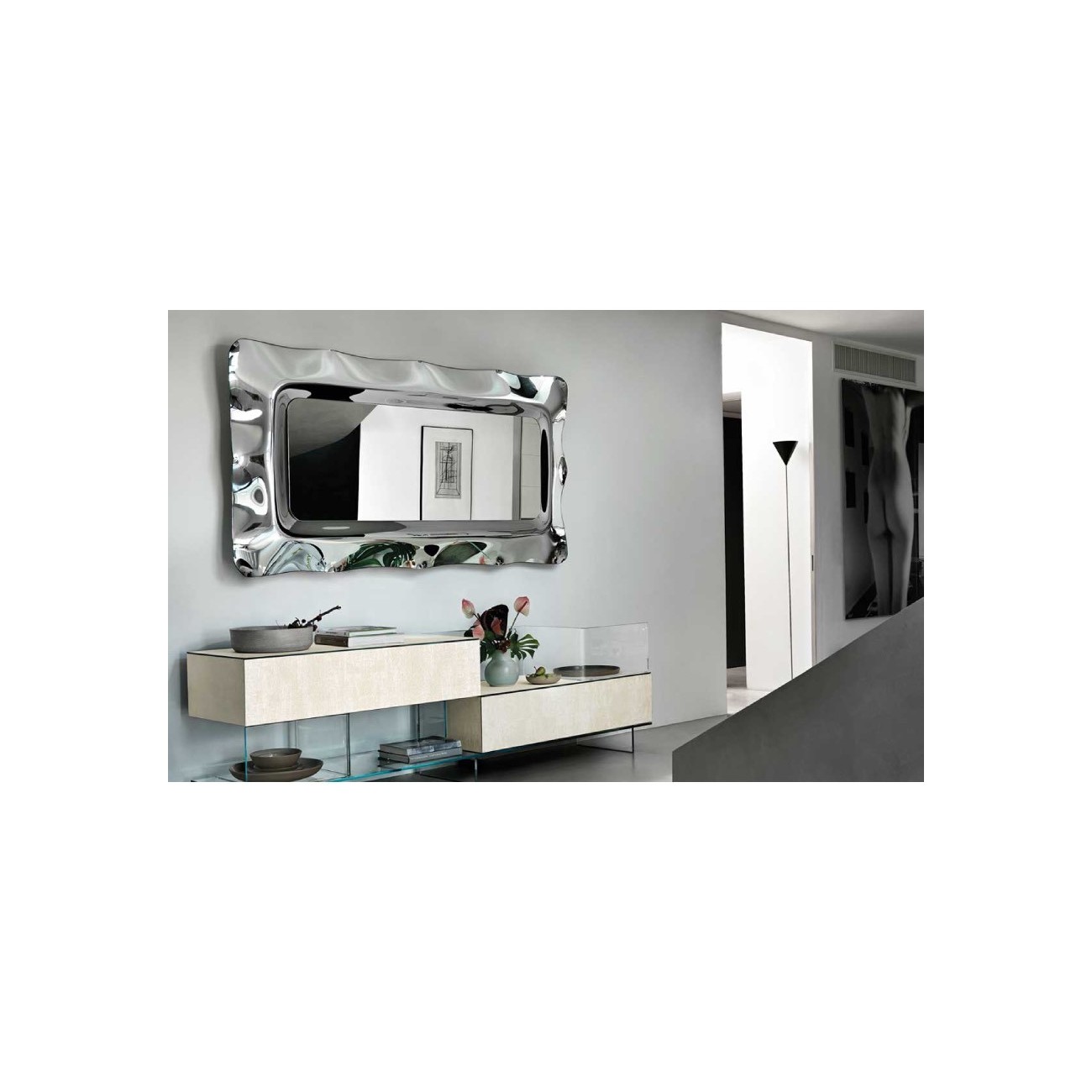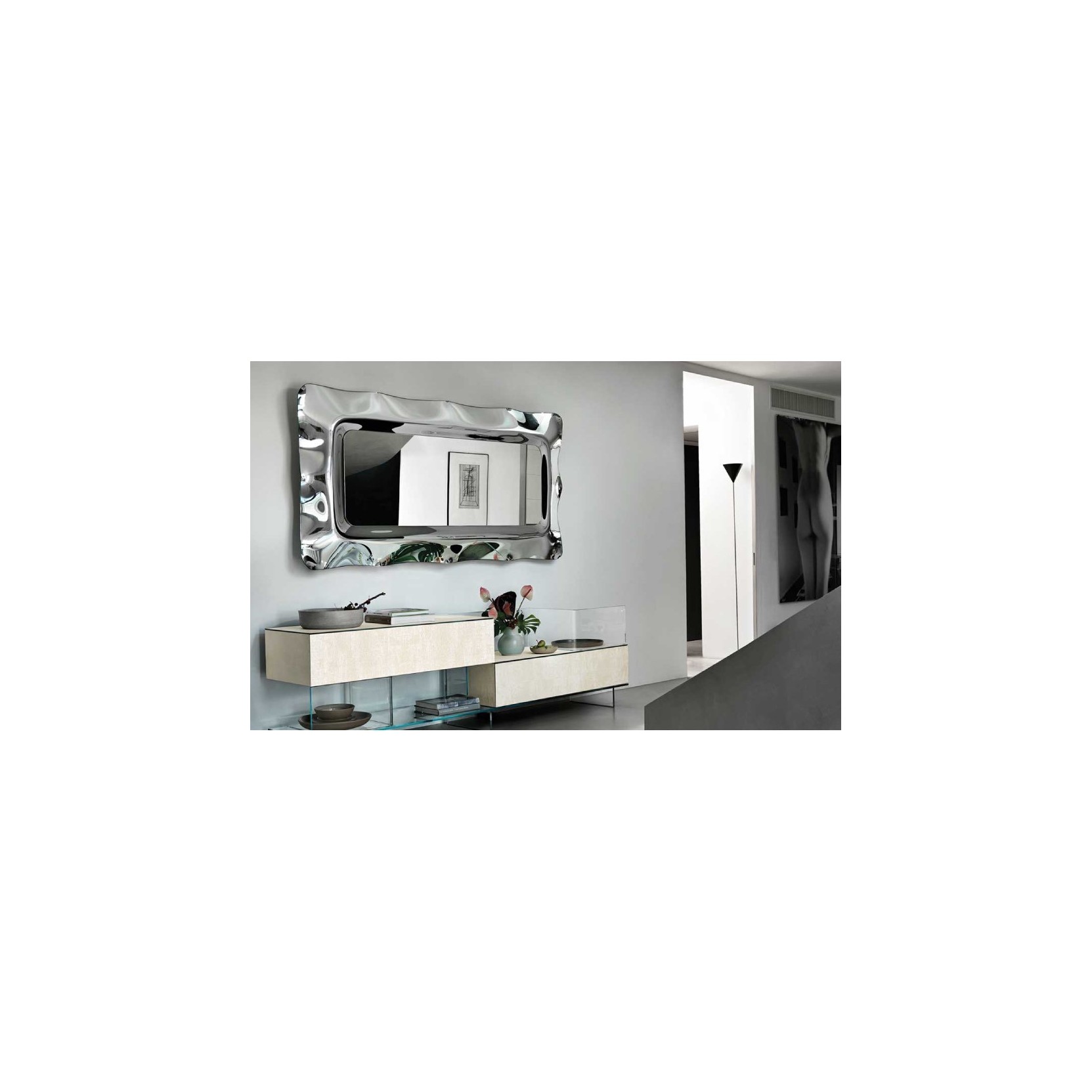 Specchio con cornice in vetro fuso a gran fuoco da 6 mm retroargentato; specchio piano da 5 mm. Telaio posteriore in metallo verniciato. Possibilità di appendimento verticale od orizzontale.Spedizione 5-6 settimane lavorative