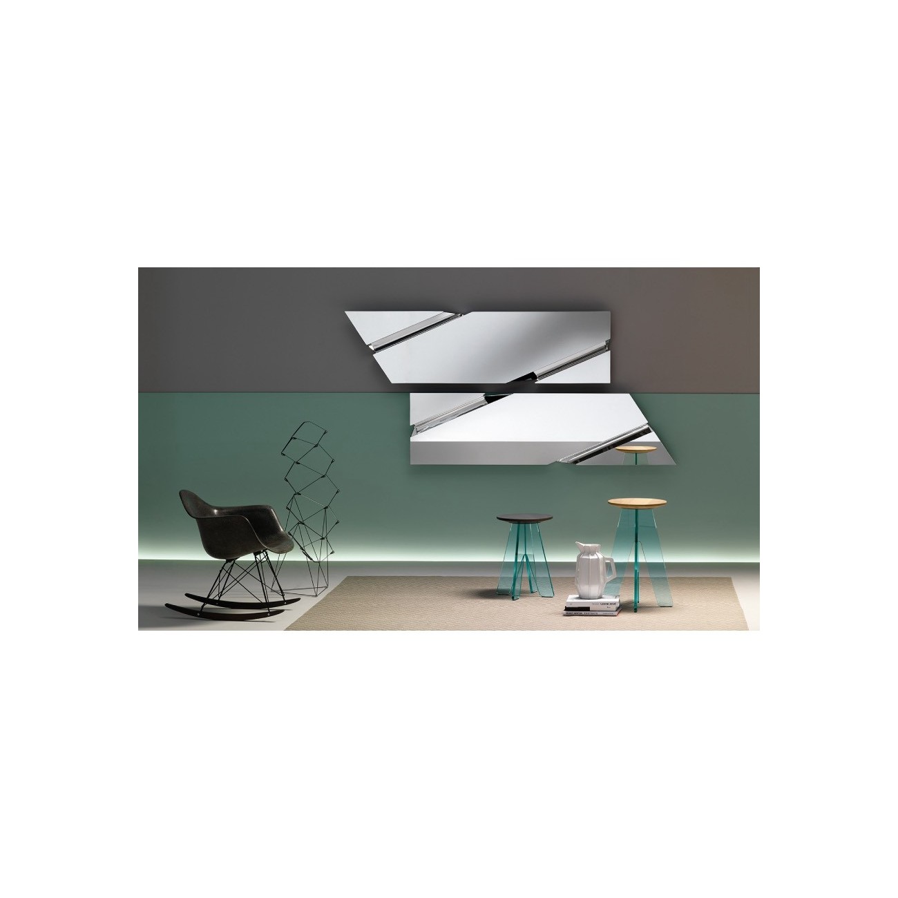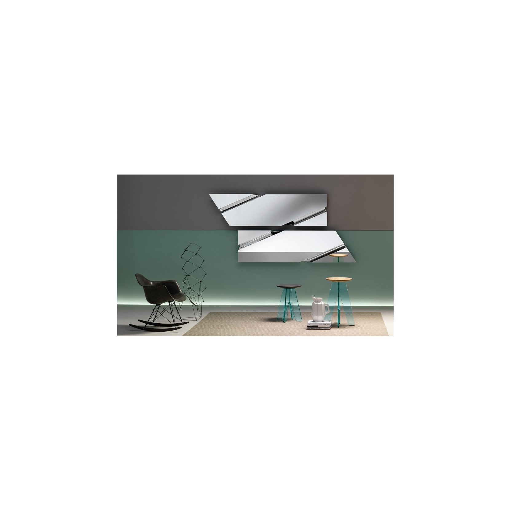 Specchio da parete composto da due elementi in vetro curvato retro argentato e da tre specchi piani tra loro saldati. Telaio posteriore in metallo possibilità di appendimento in diverse posizioni.Spedizione 5-6 settimane lavorative