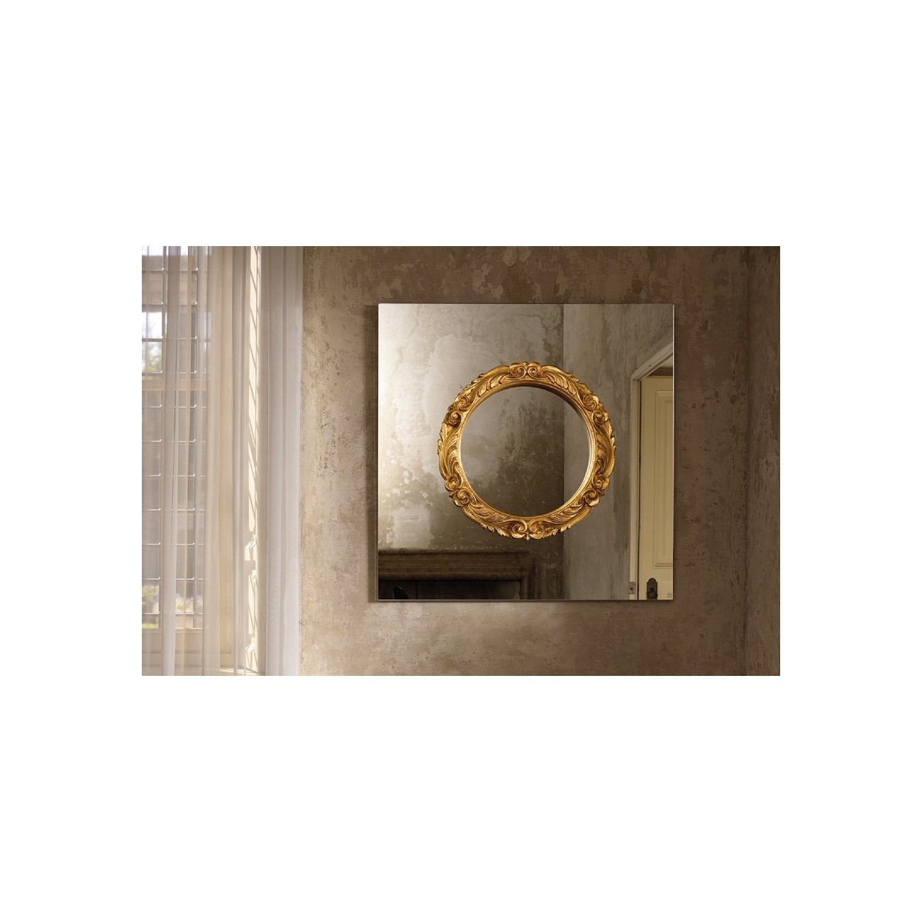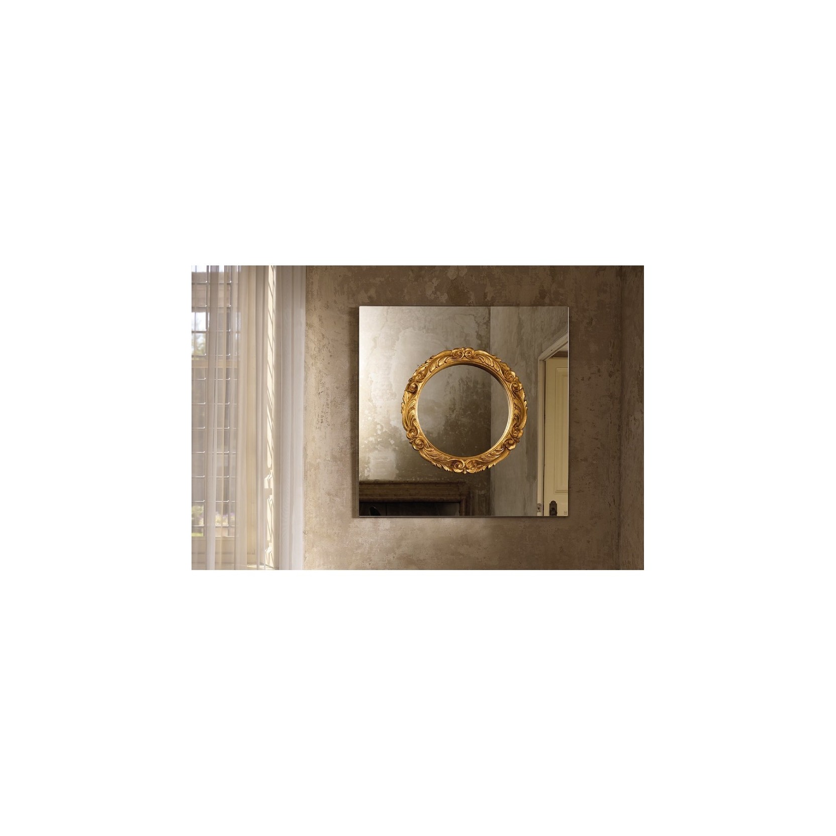 Specchio da parete con cornice in legno applicata direttamente sulla superficie specchiante. La cornice tonda in stile barocco è disponibile nelle finiture oro ed argento.Spedizione 5-6 settimane lavorative