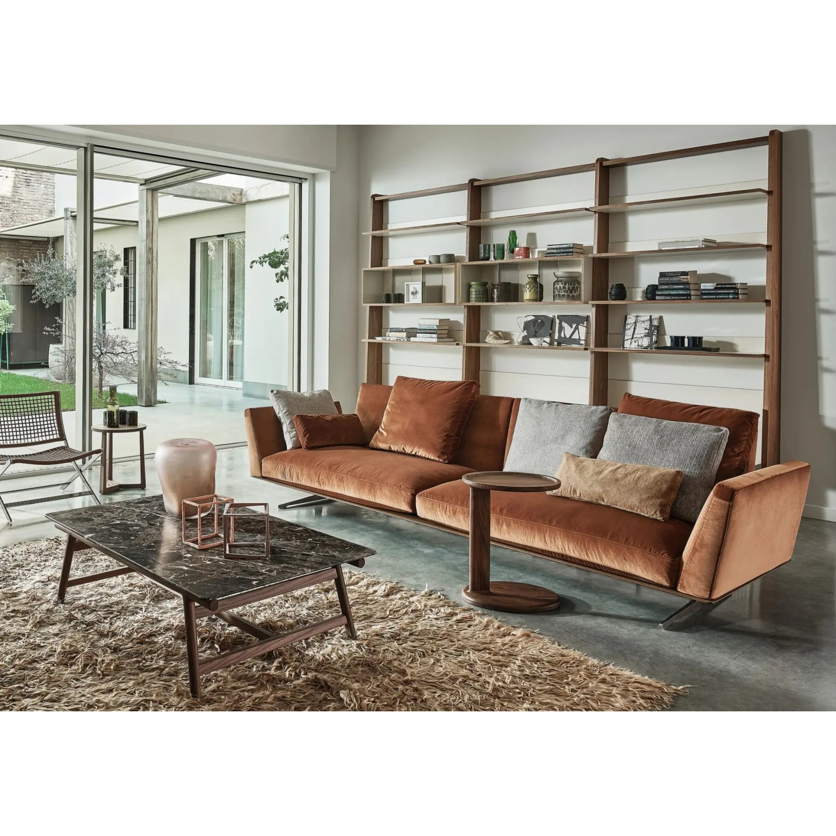 La base in metallo pressofuso lo solleva da terra conferendo un aspetto arioso, mentre gli schienali e i braccioli sottili, leggermente aperti verso l’esterno, accentuano la sua eleganza eterea. La seduta poggia su una struttura in metallo rivestita in cuoio, un dettaglio che valorizza ulteriormente il carattere versatile del divano. I cuscini di seduta in piuma d’oca sterilizzata, integrati da un inserto indeformabile a densità differenziata, assicurano comfort e sostegno ottimali, mentre lo schienale in poliuretano espanso garantisce un supporto pratico e confortevole. Il rivestimento, disponibile sia in tessuto che in pelle, è completamente sfoderabile per facilitarne la cura e personalizzarne l’estetica. I piedi in alluminio pressofuso, proposti in diverse finiture, completano il progetto con un tocco di eleganza contemporanea.