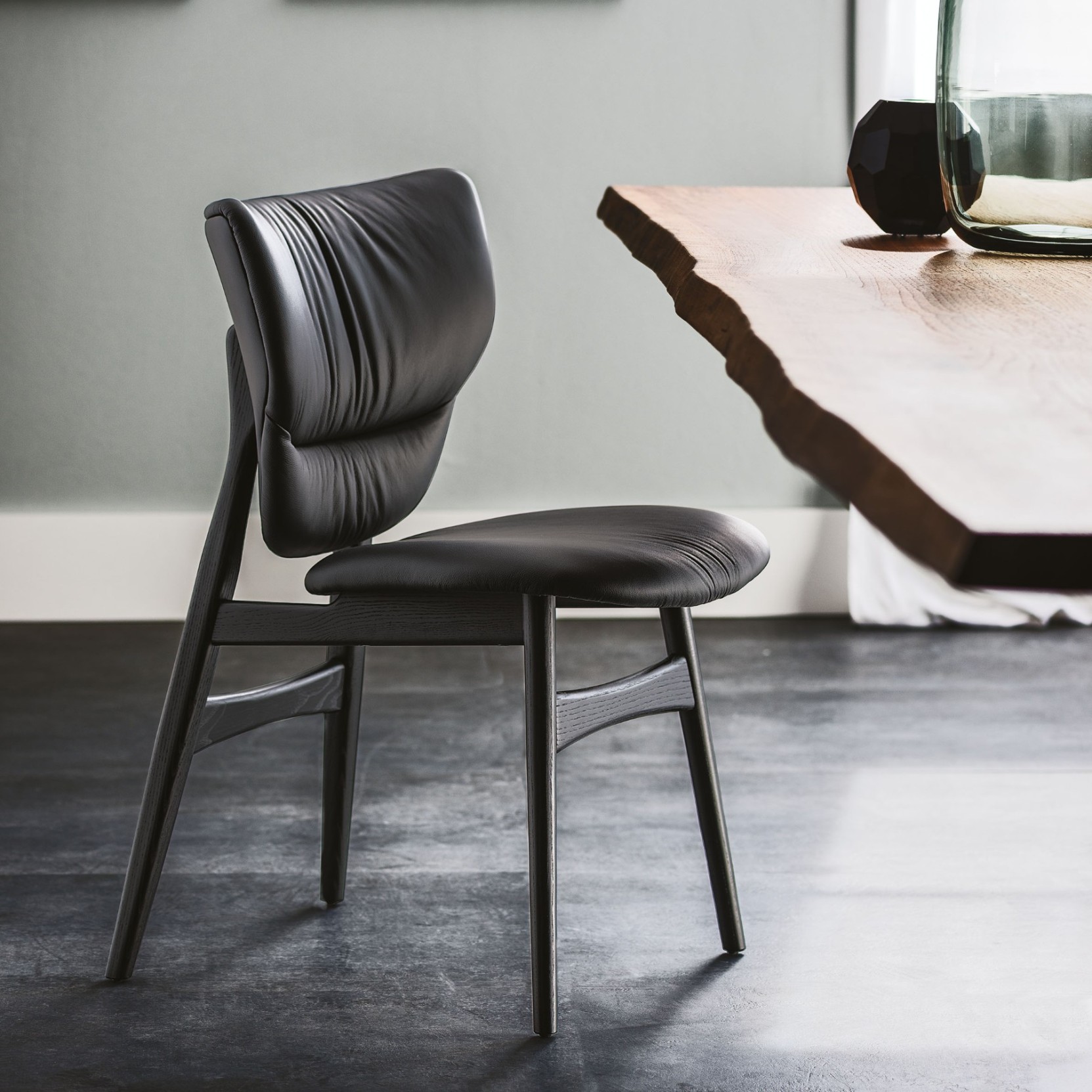 Dumbo è una sedia imbottita dal carattere deciso, capace di coniugare forza materica ed eleganza formale.