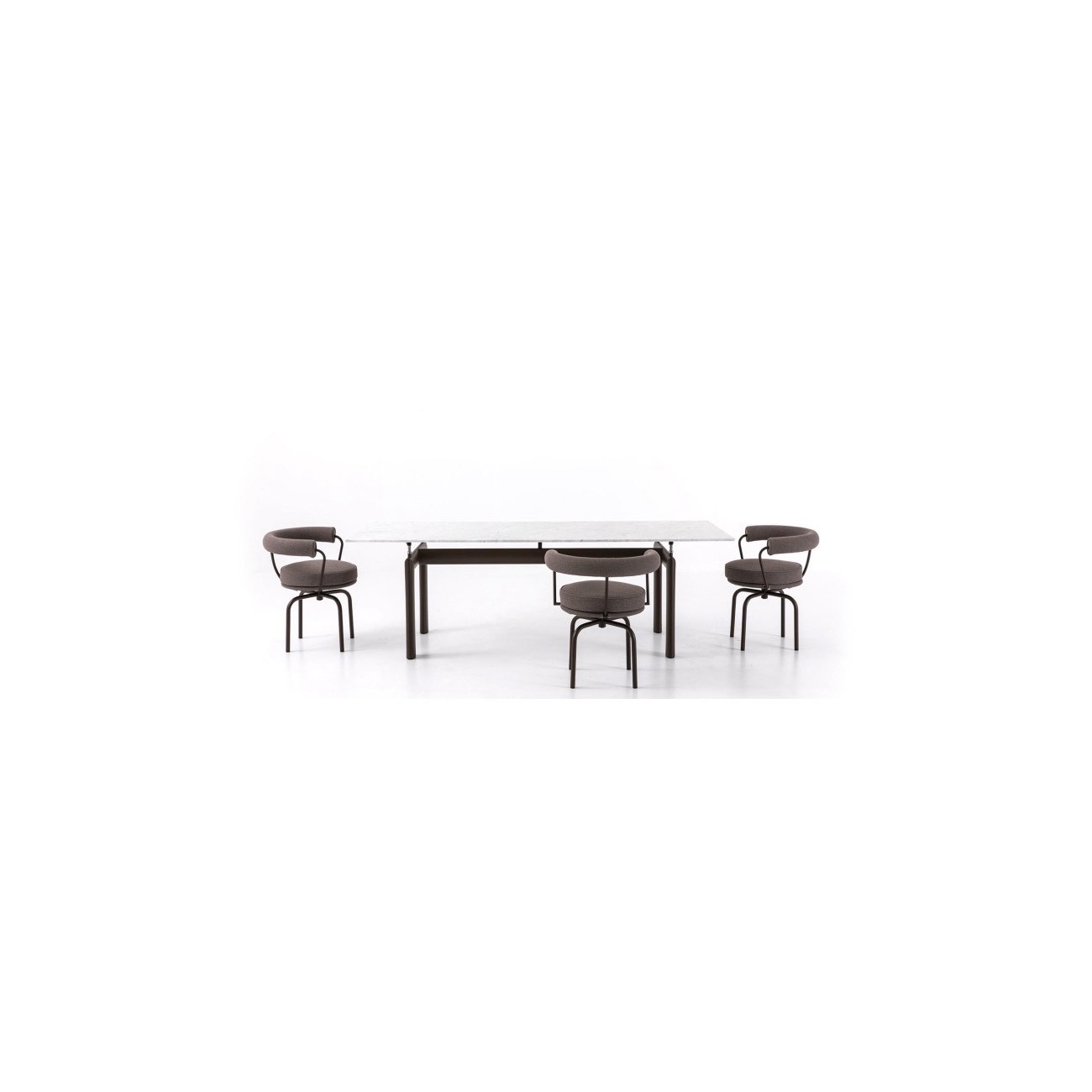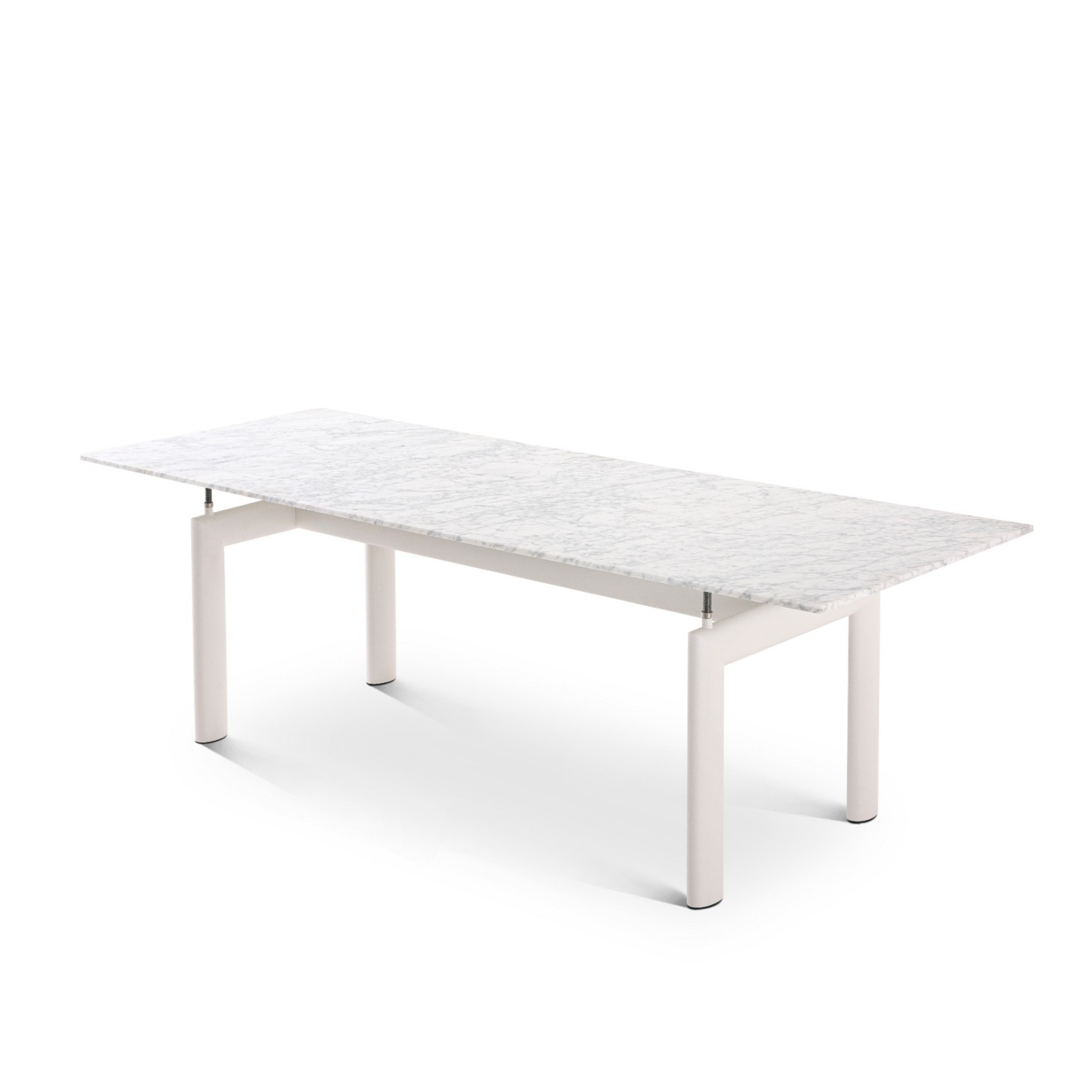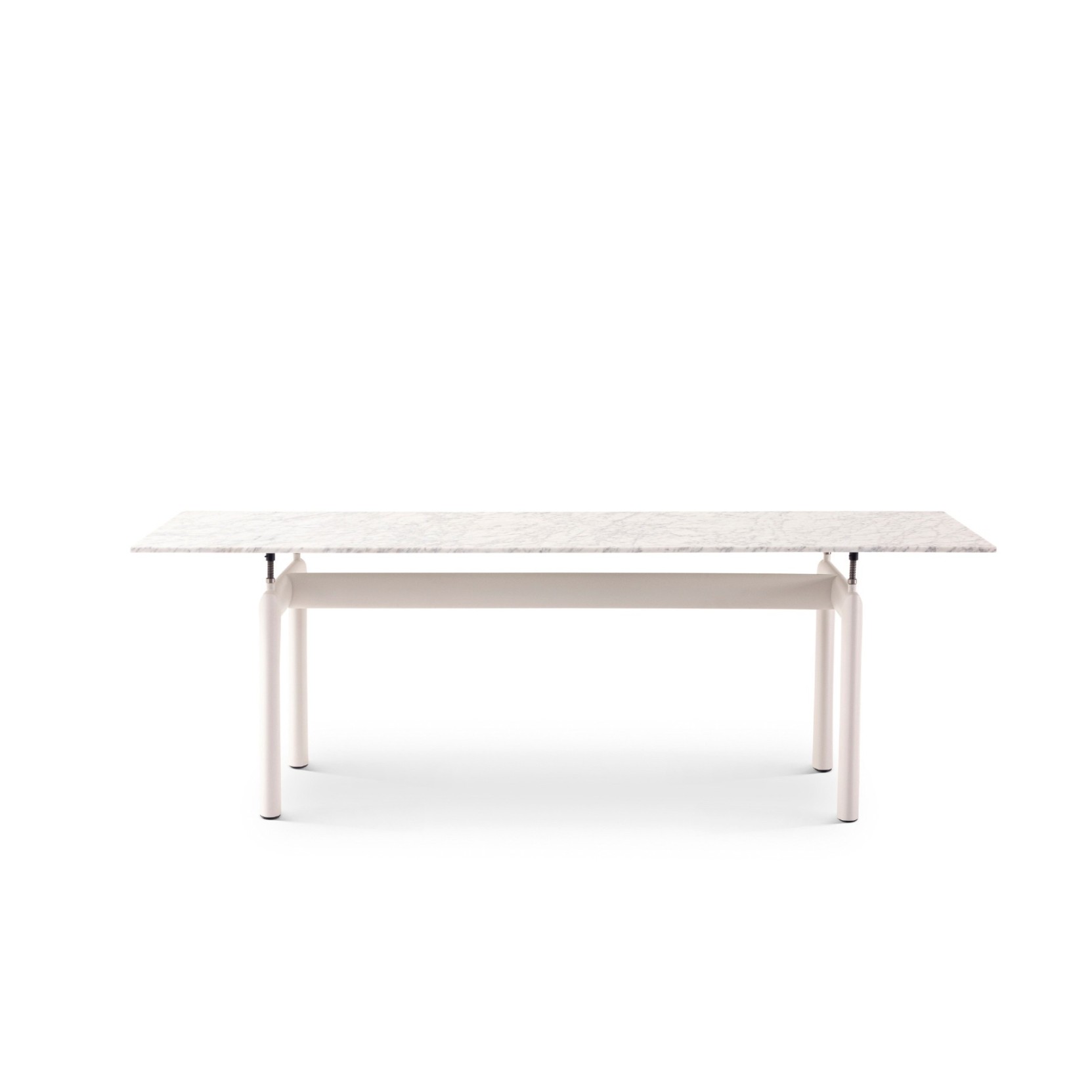 Il basamento del tavolo, disegnato nel 1928, trae ispirazione dai profili aerodinamici degli elementi usati nel settore aeronautico, in particolare quelli ovoidali utilizzati per separare le ali dei biplani. Questa scelta conferisce al tavolo un carattere unico, in cui tecnologia e arte si fondono in un equilibrio di forme ed eleganza. La struttura è realizzata in tubolare di acciaio inox AISI 304, verniciato nei colori goffrati disponibili a catalogo, e dotata di quattro supporti con gambo filettato in acciaio che consentono una regolazione in altezza fino a 50 mm, per garantire stabilità e adattabilità a qualsiasi ambiente. Il piano è in pregiato marmo di Carrara con finitura idrorepellente, capace di coniugare bellezza e resistenza. I piedini, in materiale plastico nero con feltro adesivo, proteggono le superfici su cui poggia il tavolo. Il modello è disponibile anche in versione Outdoor, con struttura in acciaio inox verniciato a polvere, specifica per resistere agli agenti atmosferici, proposta in cinque eleganti colori goffrati.