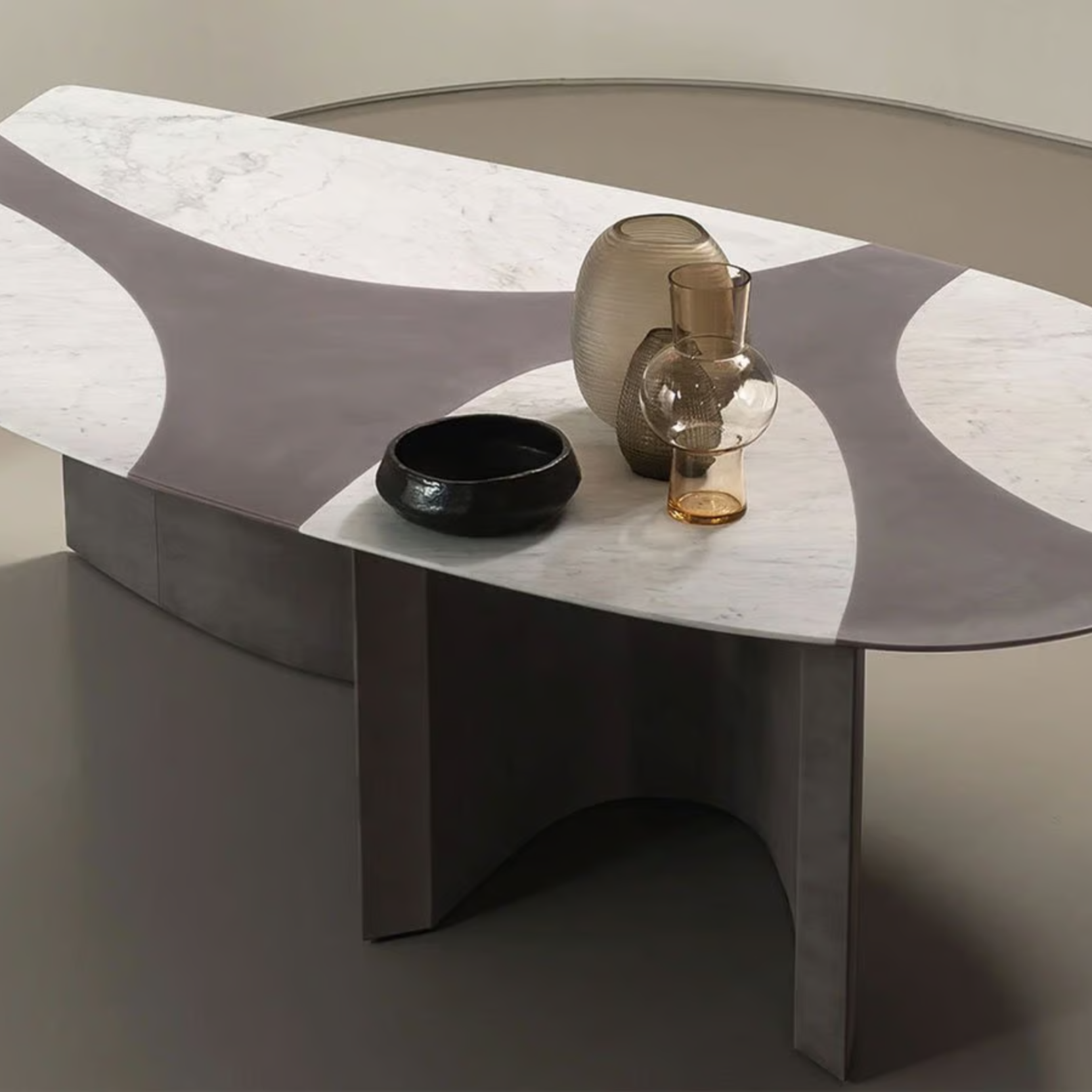 Il tavolo da pranzo Ronchamp, creato dal prestigioso marchio italiano Baxter, è un autentico capolavoro di eleganza e raffinatezza. La sua struttura vanta una base in marmo e resina, che si unisce a gambe in Polimex rivestite in pregiata pelle Kashmir, offrendo una combinazione unica di materiali che esprimono un lusso senza tempo. Originariamente caratterizzato da marmo a vista, il design evoluto di Ronchamp ora presenta gambe rivestite, elevando ulteriormente l'estetica del pezzo. Il rivestimento in pelle di questa edizione, disponibile in un sofisticato colore Plombe, si integra perfettamente con spazi contemporanei e ambienti eleganti, arricchendo la collezione Baxter con un tocco di classe. Il tavolo Ronchamp rappresenta l'armonia tra l'innovazione del design e l'arte della manifattura, riflettendo la maestria dell'artigianato italiano e rendendolo un simbolo di stile e funzionalità per la tua sala da pranzo.