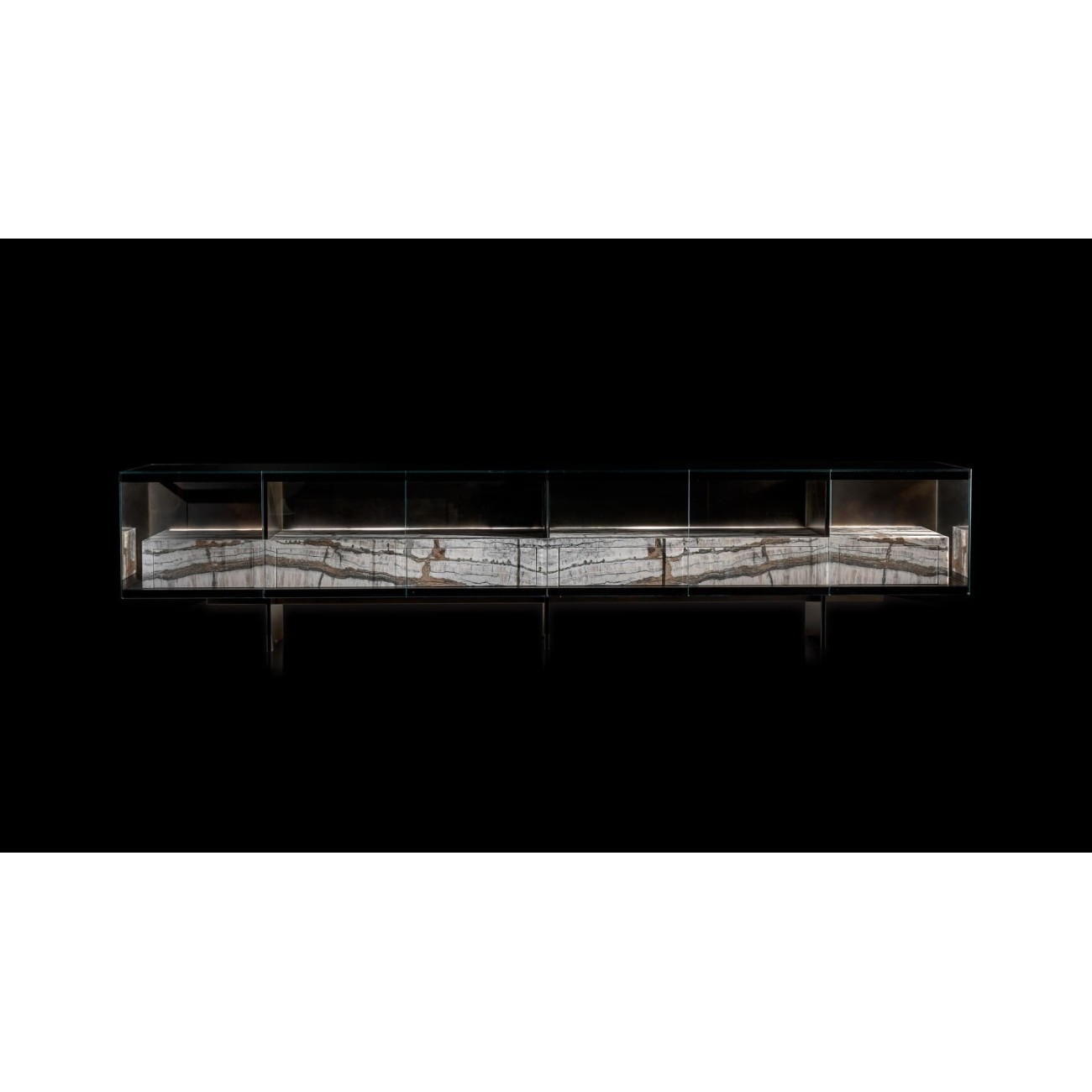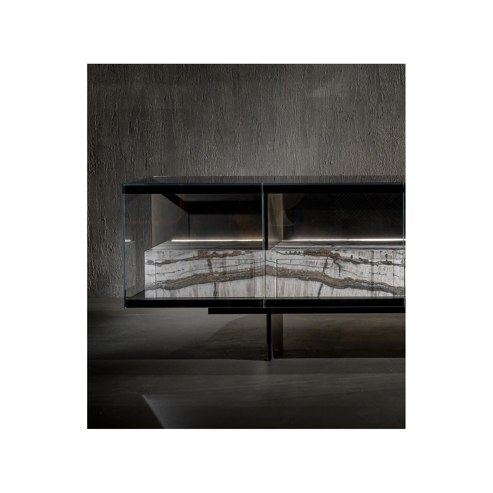 Teke si distingue per la sua struttura in titanio brunito, con pannelli laterali, piano e ante realizzati in vetro extra chiaro o bronzeo, mentre lo schienale è in pietra, che può essere personalizzata tra le opzioni disponibili nella nostra gamma. Il mobile interno, che contiene i cassetti, è ricoperto con finiture in titanio brunito, platino brunito, ottone patinato, ottone e argento patinato. La base, disponibile in acciaio brunito nero, è alta 6 o 26 cm, con la possibilità di aggiungere una luce LED interna con luce calda naturale (3000K), montata sotto la base. Ogni elemento è realizzato con cura artigianale, rendendo ogni pezzo unico grazie alle variazioni naturali dei materiali utilizzati.