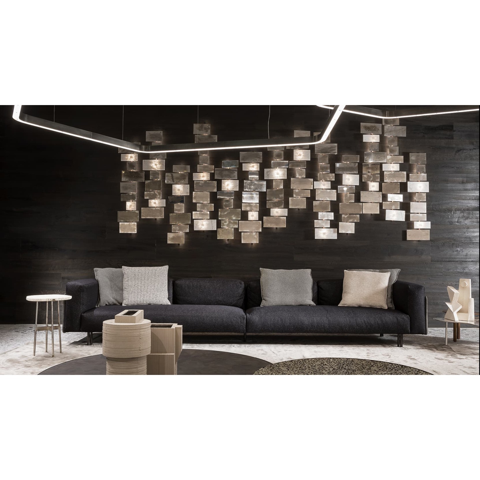 Il rivestimento è disponibile in una selezione esclusiva di pelli e tessuti, mentre la struttura posteriore in legno può essere rifinita con una laccatura opaca a poro aperto, coordinata con l’intreccio in pelle scelto. Disponibile nelle dimensioni 100x72h cm, con un’altezza della seduta di 43 cm.