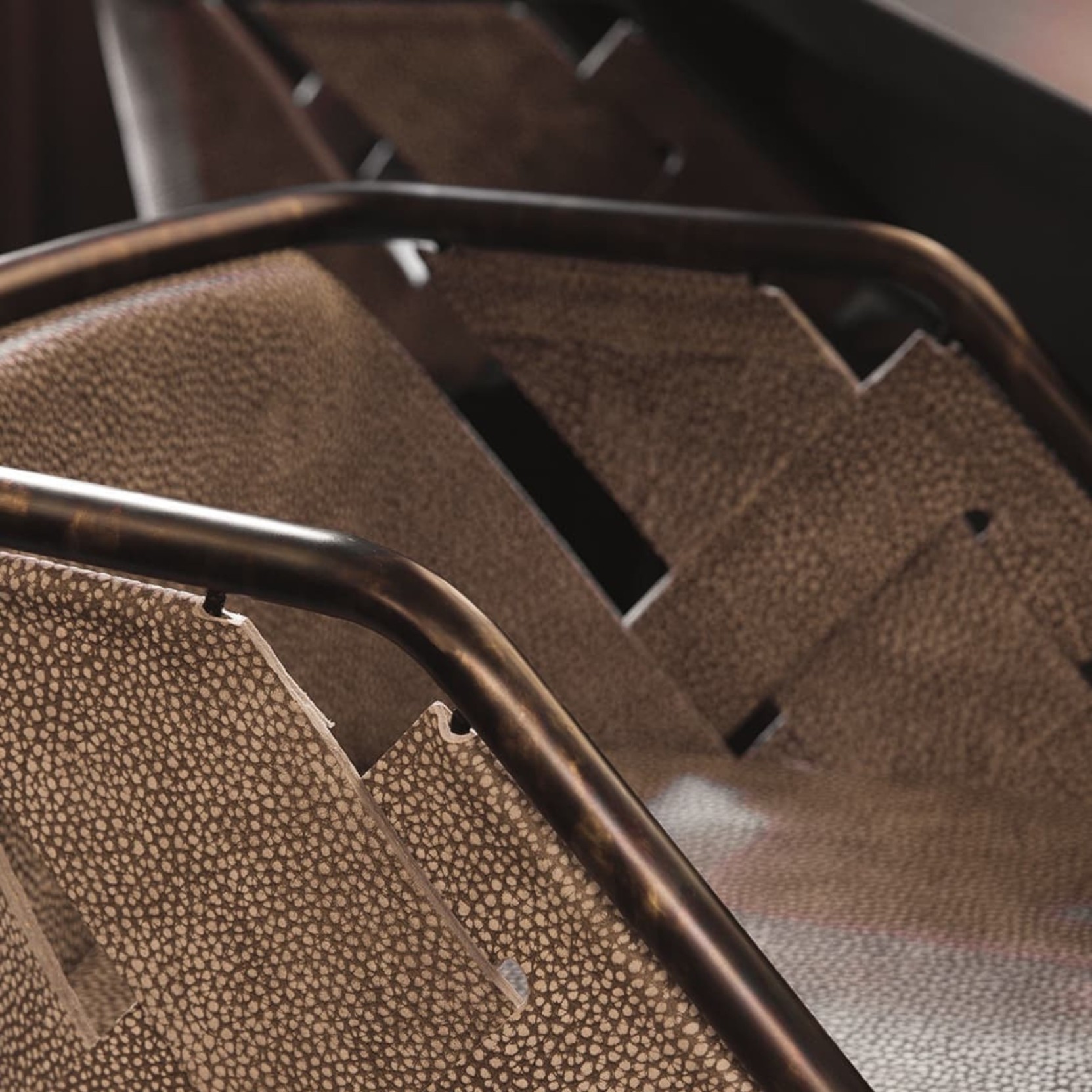 Lo sgabello Strip è caratterizzato da una struttura in tubo metallico curvato, con un diametro di 2,5 cm, disponibile in finiture di acciaio bruciato nero, burnished Platino, burnished Titanio e burnished brass, lavorate a mano con tecniche tradizionali. Il sedile è imbottito con pelle intrecciata laser-cut a doppio spessore, disponibile nelle varianti Durango, Nabuk, Camoscio o E-Type. Le sue dimensioni di 56x56x84 cm e un'altezza del sedile di 61 cm lo rendono perfetto per ambienti eleganti e moderni, combinando stile e comfort.