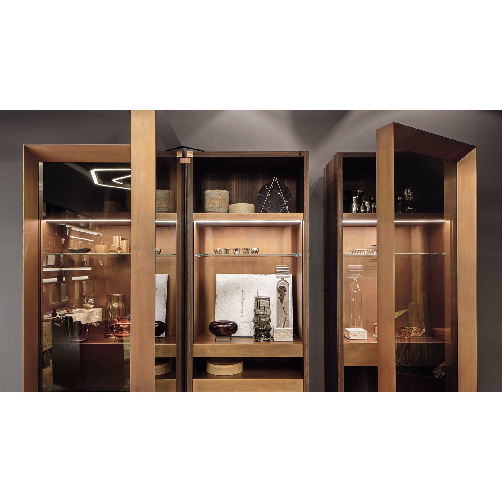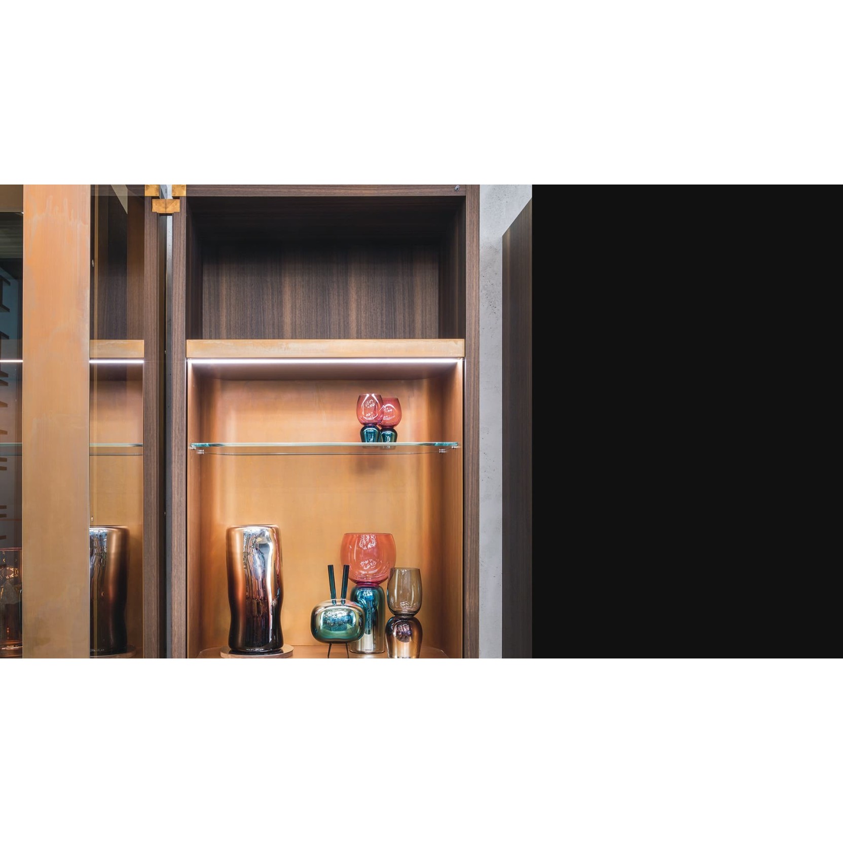 Loom FR è caratterizzato da linee pulite e raffinate, con una struttura in legno multistrato da 4 cm di spessore, rivestito con finitura in legno selezionato, e montanti in legno da 1,4 cm di spessore o rivestiti in Acciaio Nero Lucido. Il mobile è dotato di pannelli posteriori in metallo, disponibili in diverse finiture come Acciaio Nero Lucido, Platino Lucido, Titanio Lucido, Ottone Lucido, oppure in pietra. Presenta una luce LED integrata che illumina verso il basso. Le unità di stoccaggio sono dotate di ante a ribalta in legno multistrato da 2 cm di spessore e vetro bronzo da 1 cm per le mensole. La base in Acciaio Nero Lucido è alta 35 cm, mentre le porte in vetro scorrevole hanno una struttura metallica e un rivestimento Stopsol Supersilver. Le dimensioni standard sono 86x55x234h cm e 120x55x184h cm, con opzioni personalizzabili.