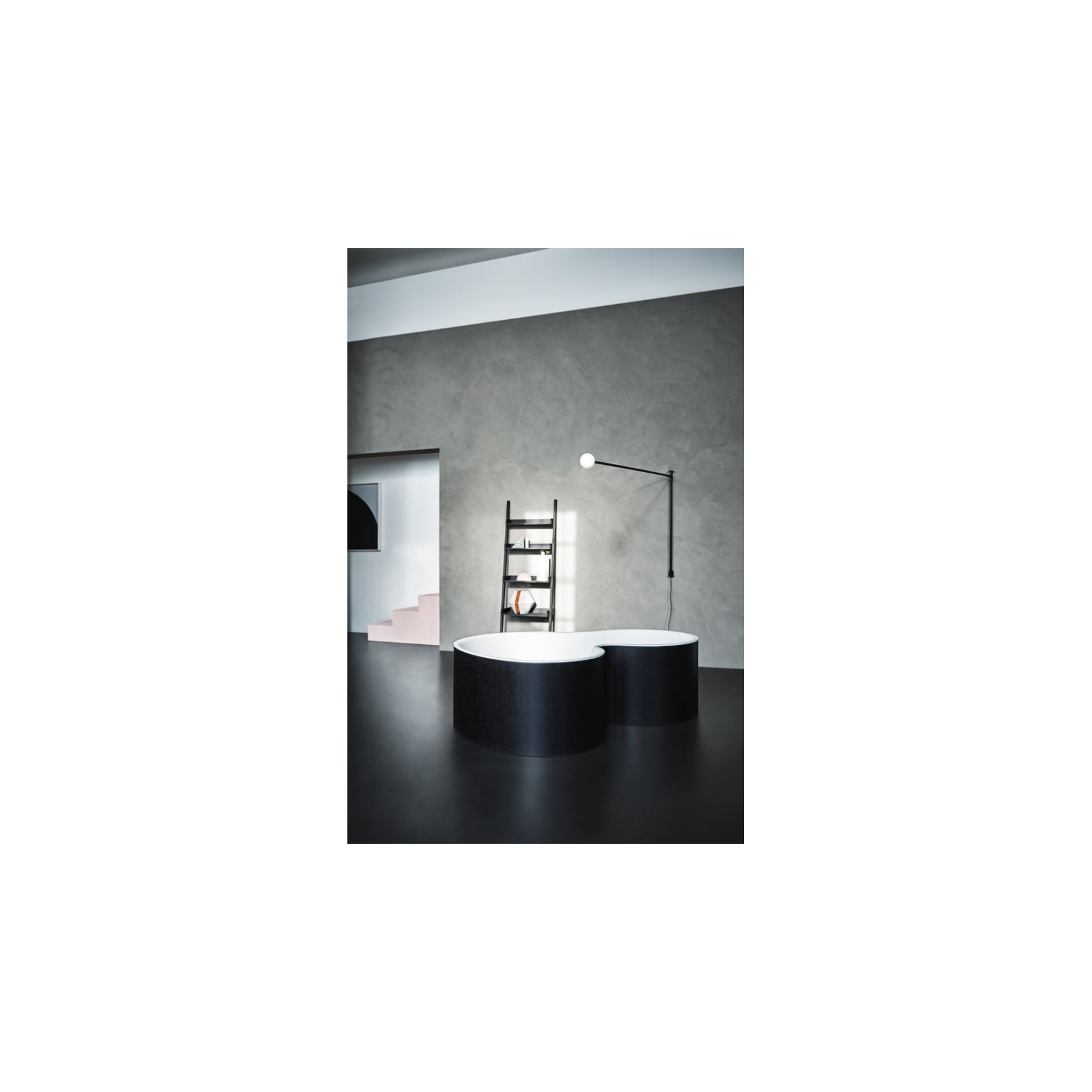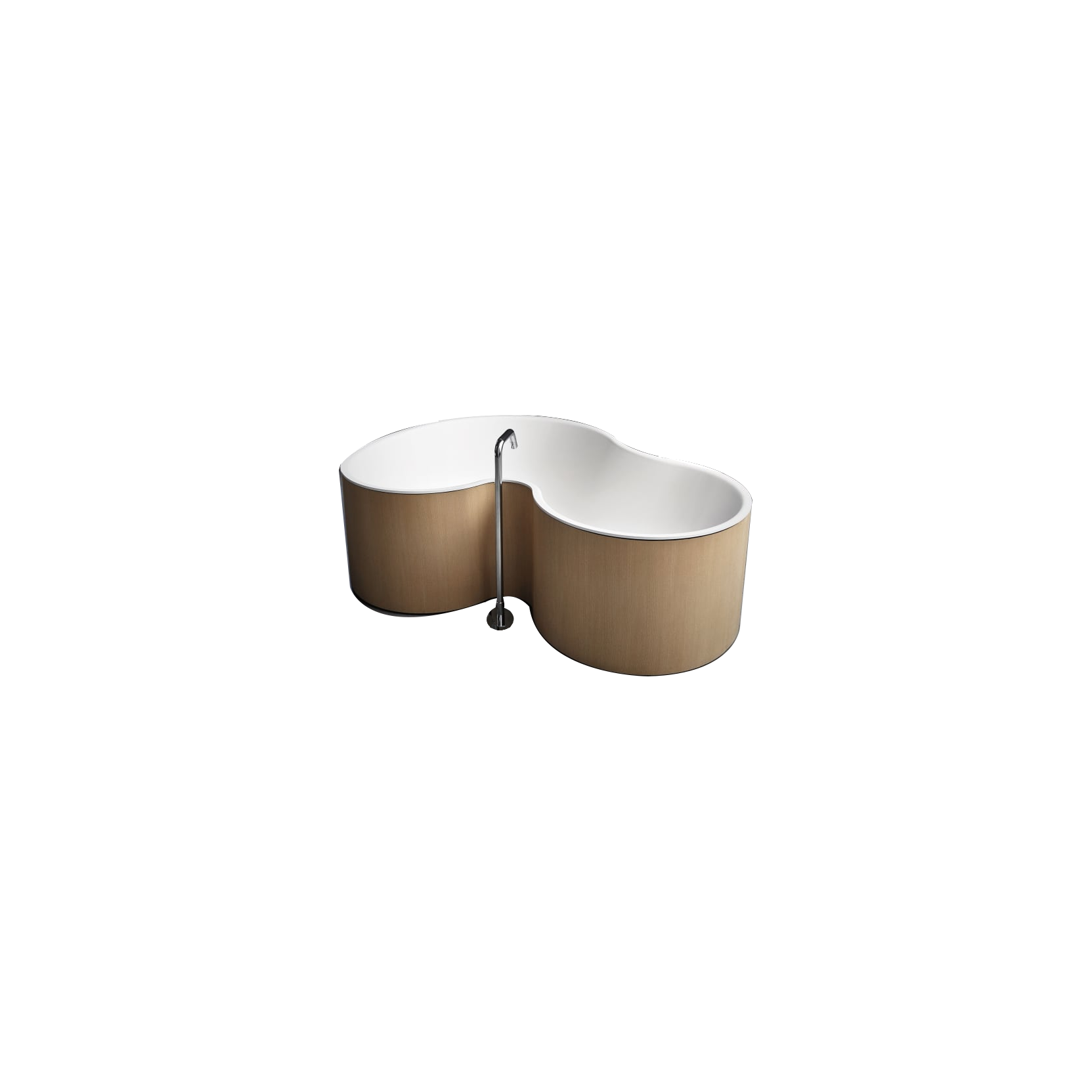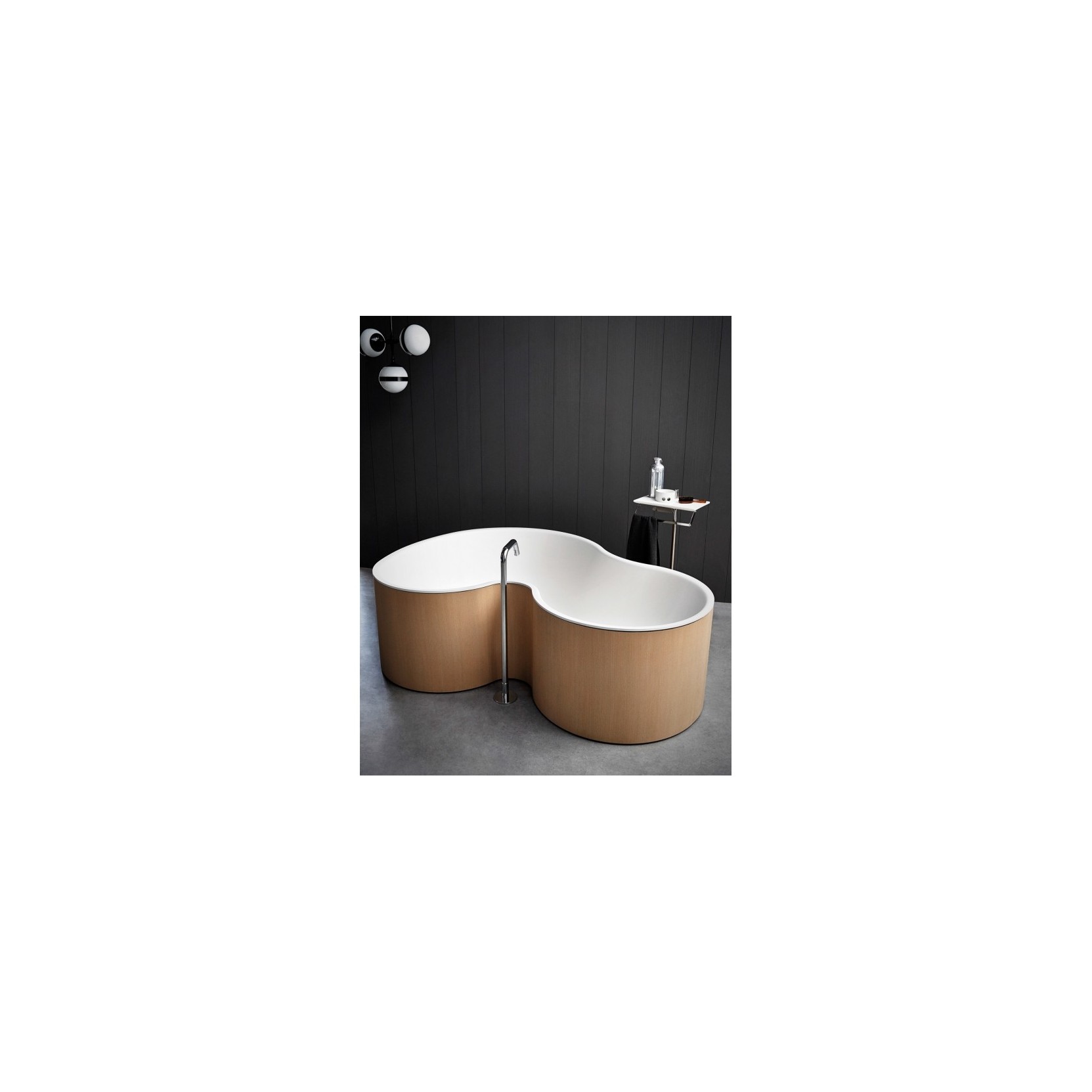DR, progettata da Studio MK27, Mariana Ruzante e Marcio Kogan per Agape nel 2014, presenta un corpo vasca monoblocco in solid surface bianco opaco senza fori preforati per rubinetteria esterna, dimensioni 183,2 cm di lunghezza, 130,7 cm di larghezza e 56,5 cm di altezza, sorretta da strutture rialzate in multistrato di pioppo precomposto con finitura teak naturale oliato, laccatura soft touch opaca o effetto terra cruda grezza. L’acqua sgorga internamente dal fondo provvisto di ghiera estraibile in acciaio inossidabile lucido, ideale per immersioni profonde in bagni minimalisti o luxury.