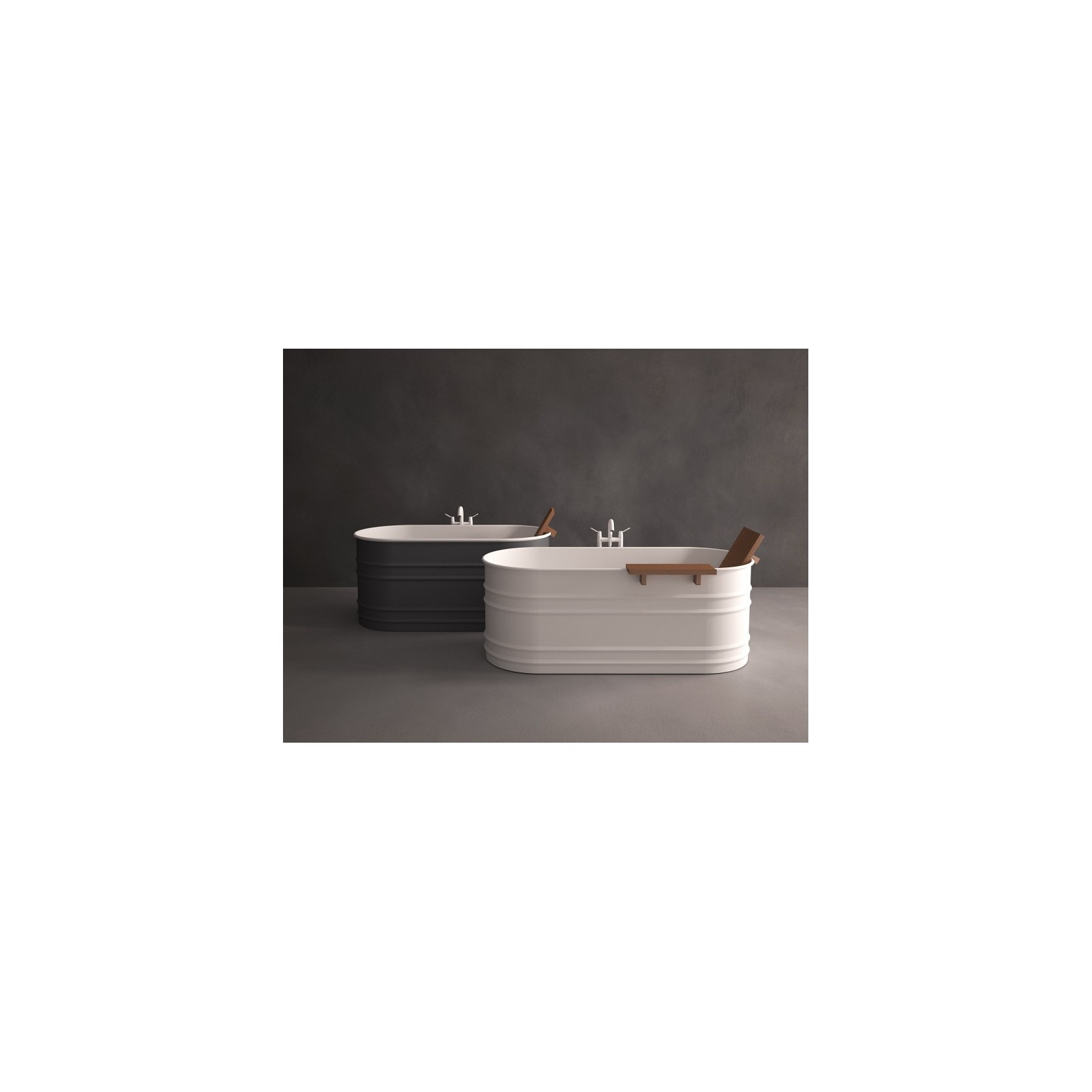 Vieques, creata da Patricia Urquiola per Agape ispirandosi alle vasche in stagno vintage dell'oasi Vieques Island, realizza un omaggio ready-made con struttura in acciaio verniciato bianco interno (RAL9003) e esterno grigio scuro (RAL7021) o grigio chiaro (RAL7044), dimensioni 171 cm lunghezza, 72,6 cm larghezza, 63,5 cm altezza e capacità 370 litri, dotata di troppopieno esterno bianco e scarico sifonato (.MET0433WU). Completabile con poggiaschiena e mensola in iroko di alta qualità da fissare sul bordo, versione bicolore personalizzabile su richiesta e inox per uso outdoor, montaggio freestanding con rubinetteria a muro o pavimento.