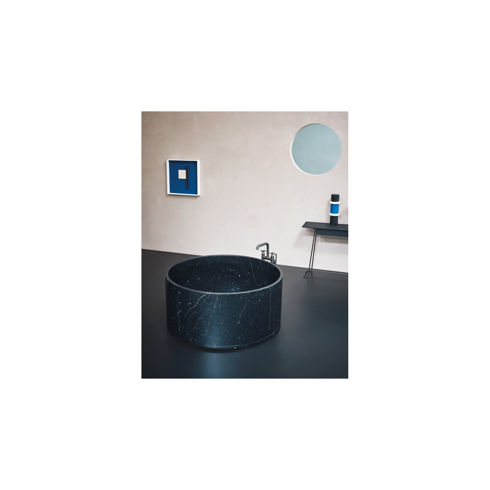 In-Out in marmo, firmata Benedini Associati per Agape, realizza il suo invaso perfettamente tondo scavato in lastre di marmo naturale selezionato – Bianco Carrara, Nero Marquina, Verde Alpi o Emperador Dark – dimensioni diametro 129,4 cm e altezza 58 cm, capacità 521 litri, peso 345 kg e imballo 160x160x94 cm da 400 kg, completa di piletta sifonata cromata .MET0722 con troppopieno integrato (esclusa in alcuni display), senza fori per rubinetteria da collocare a parete o pavimento. Geometria elementare per versatilità in contesti indoor, materiale nobile esalta personalità scultorea e tattile, installazione freestanding semplificata con template opzionale AKITPZVAS.