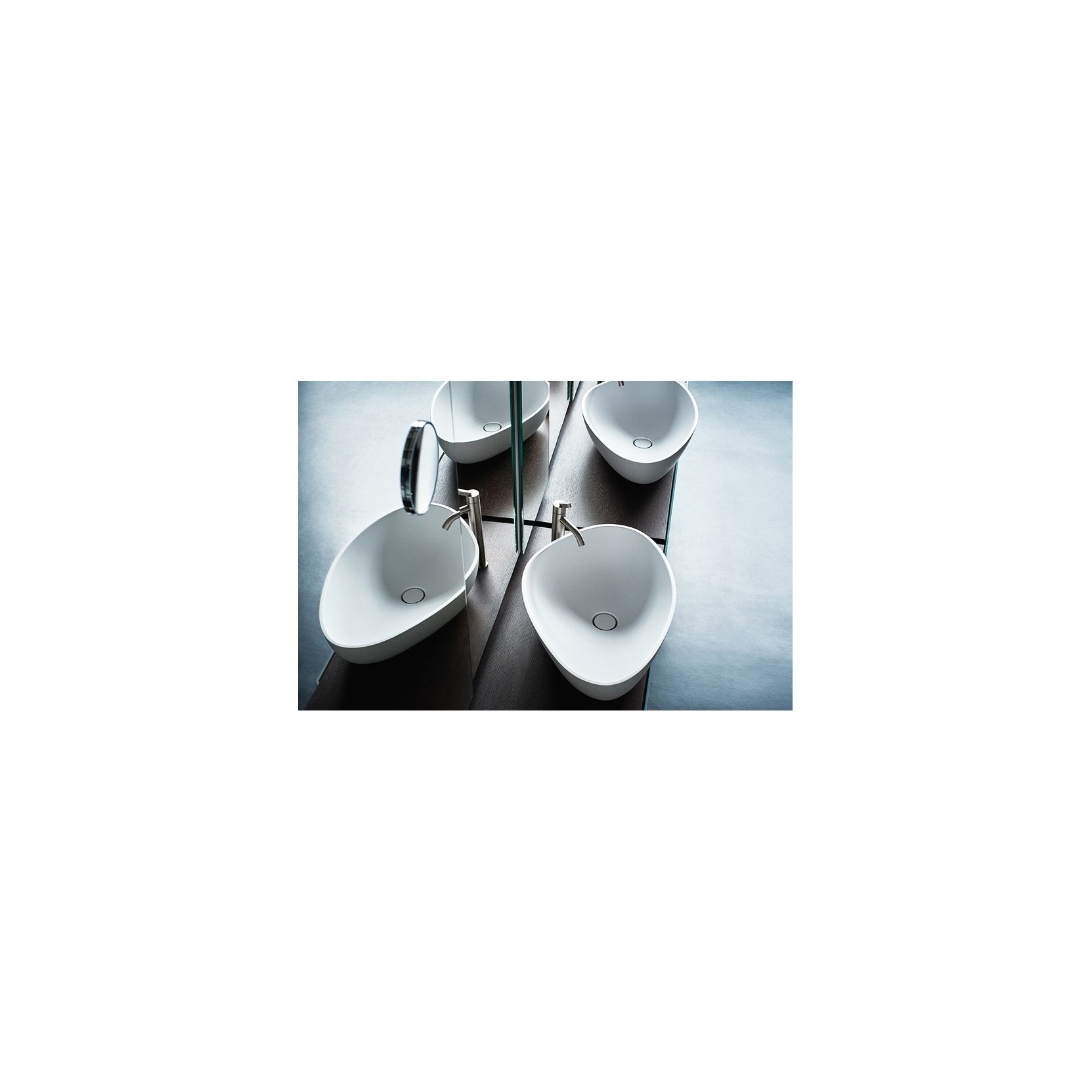 Drop, parte della famiglia omonima di Benedini Associati per Agape, propone forma sagomata organica in Cristalplant® biobased monocolore bianco o bicolore grigio chiaro (RAL7044)/scuro (RAL7021), dimensioni 63,3 cm larghezza, 39,6 cm profondità, 18 cm altezza (peso 12 kg; versione L: 67x44,2x18 cm), o in marmi prestigiosi come Bianco Carrara (MC), Grigio Carnico (CG), Nero Marquina (NM), Verde Alpi (VP), Emperador Dark (ED), con varianti RAL/NCS o pietre su richiesta. Completo di piletta sifonata .MET0723 (Cristalplant) o .MET0563 (marmo) con calotta a filo della sagoma interna in stessa finitura, scarico libero senza foro rubinetto né troppopieno, montaggio su piano autoportante o isola freestanding, solo Petit Granit per indoor/outdoor