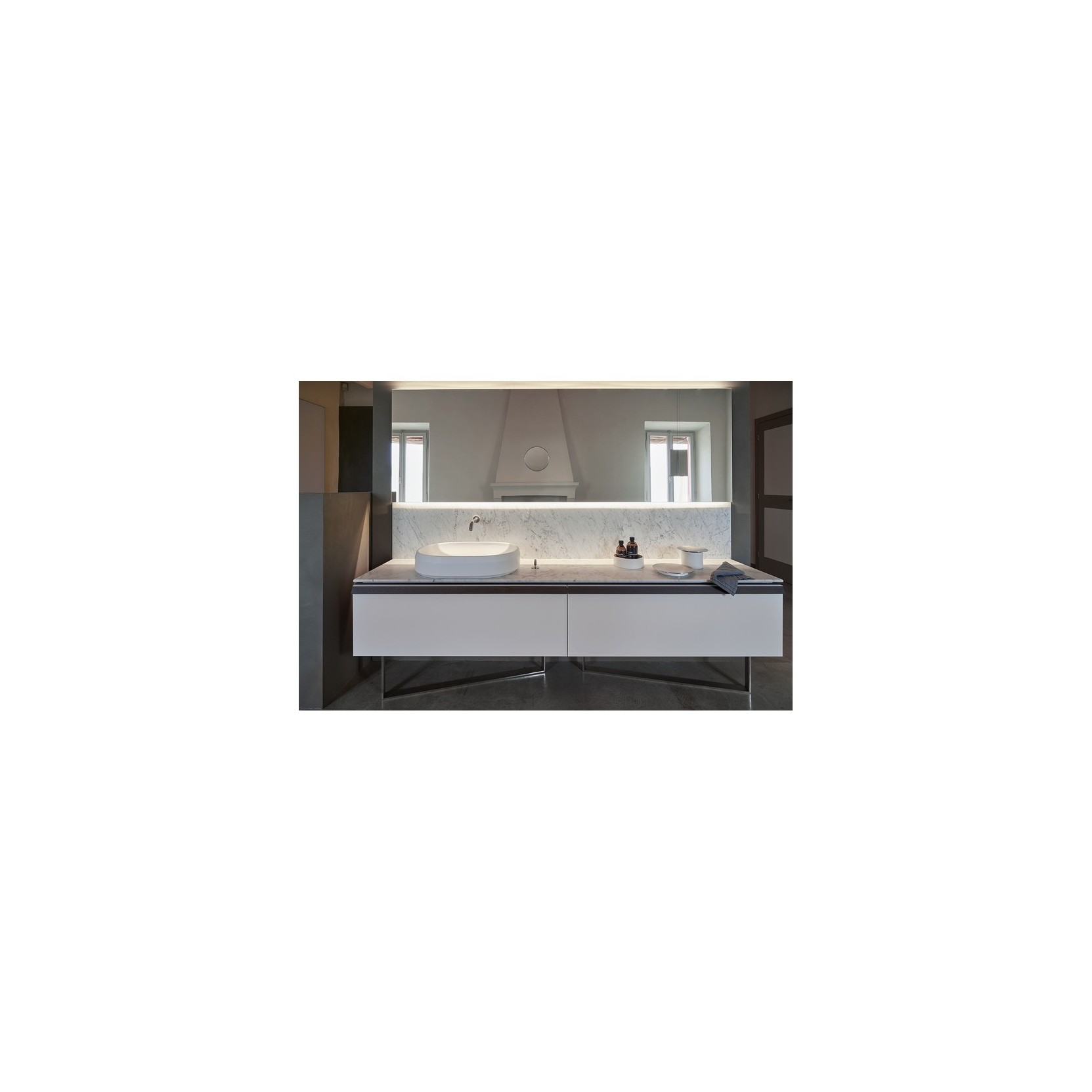 Lariana da appoggio riprende il contrasto curvo-interno/lineare-esterno della omonima vasca, con doppio involucro in Cristalplant® biobased monocolore bianco o bicolore grigio chiaro/scuro, dimensioni 64,9 cm larghezza, 46,9 cm profondità, 13 cm altezza (peso 16 kg; marmo 43 kg), imballo 71x53x23 cm, completo di piletta sifonata .MET0723 (Cristalplant) o .MET0563 (marmo) con calotta a filo in finitura abbinata per scarico libero senza foro rubinetto né troppopieno. Montaggio su piano consolle o mobile per rubinetteria a muro/deck, varianti marmi prestigiosi (Bianco Carrara, Grigio Carnico, Nero Marquina, Verde Alpi, Emperador) su richiesta.