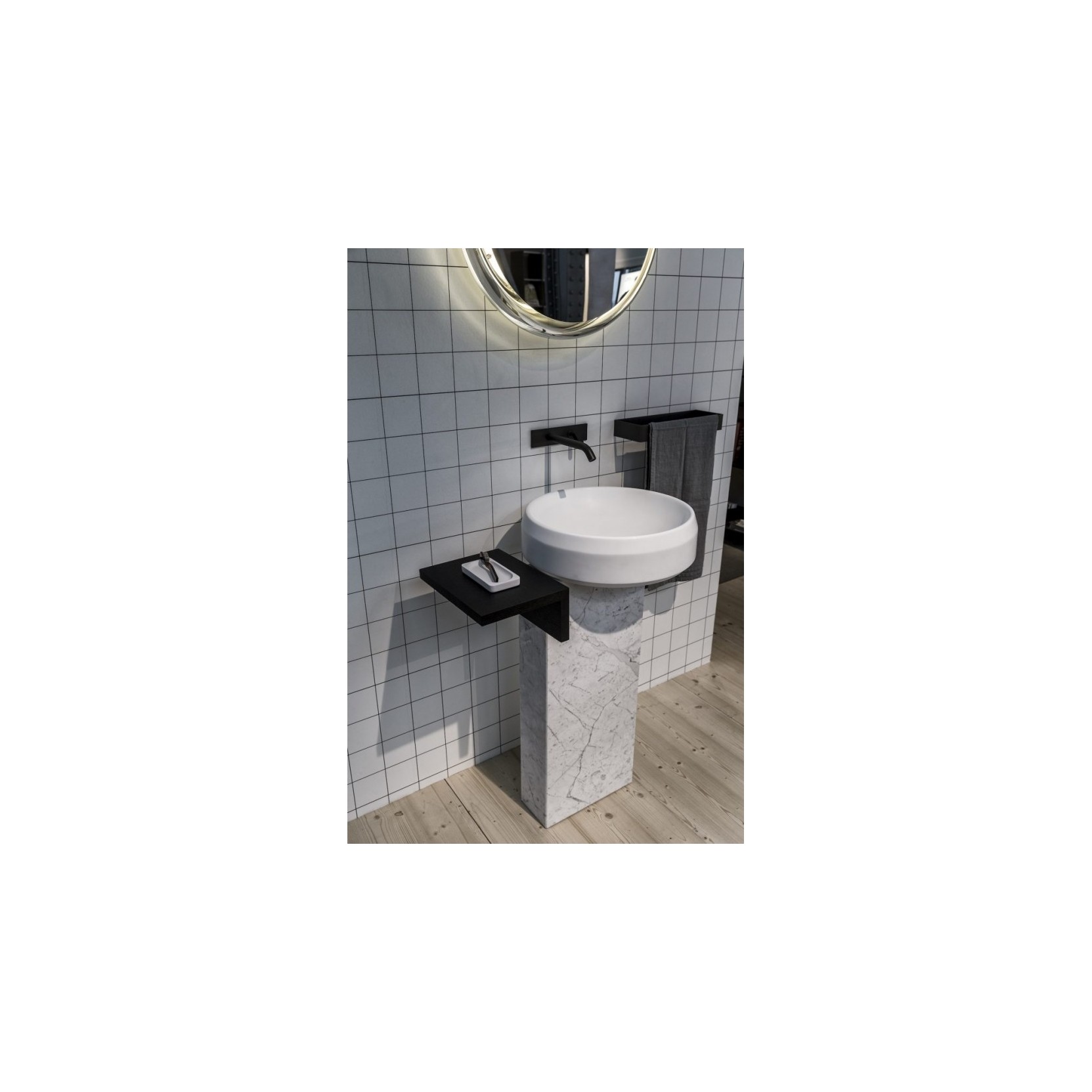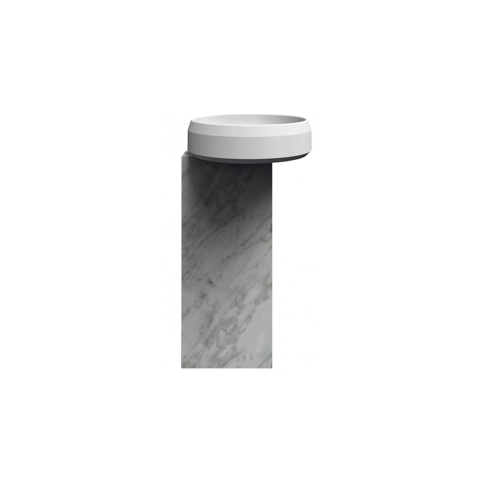 Lariana a colonna presenta bacino ovale o tondo in posizione asimmetrica (destra, sinistra o frontale) su basamento monolitico squadrato in Cristalplant® biobased bianco puro o bicolore grigio chiaro/scuro, altezza totale 77 cm, dimensioni bacino 64,9 cm larghezza, 46,9 cm profondità, 13 cm altezza (peso 16 kg), imballo compatto, completo di piletta .MET0723 con calotta coordinata per scarico libero senza foro rubinetto. Versioni cemento colorato per outdoor, marmi (Carrara etc.) su richiesta, predisposto per scarico a parete o isola freestanding con sifone dedicato, rubinetteria a muro/free-standing.