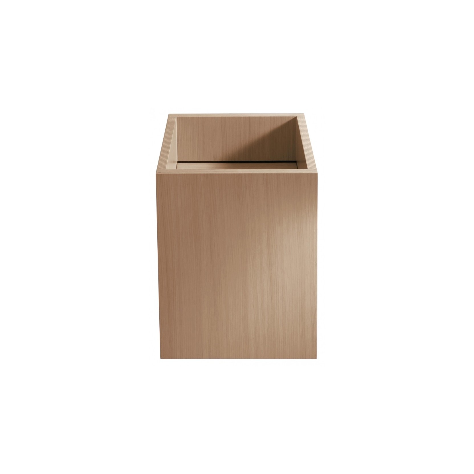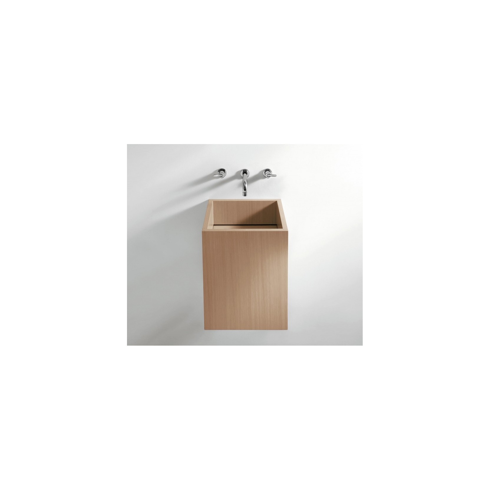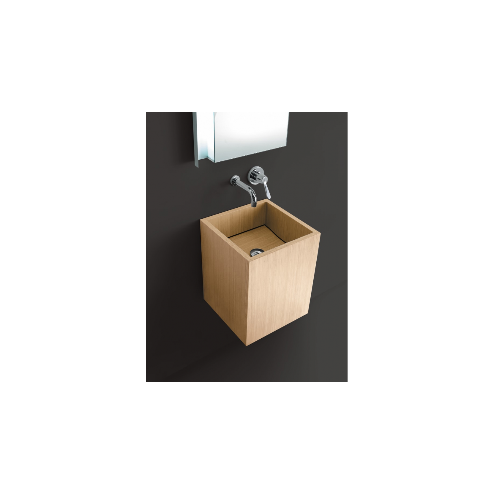 Cube realizza volume massiccio in multistrato waterproof di betulla rivestito rovere naturale, bruno, scuro o legno precomposto teak, dimensioni 40 cm larghezza, 40 cm profondità, 50 cm altezza (peso 15 kg, imballo 47x44x66 cm 17 kg totali), completo di kit fissaggio a parete e piletta .MET0563 preassemblata per scarico libero senza foro rubinetto né troppopieno. Ampie superfici laterali valorizzano venature legno, installazione sospesa a parete per rubinetteria a muro, integrabile con elementi rovere/teak per composizioni naturali, adatto a bagni moderni con calore tattile.