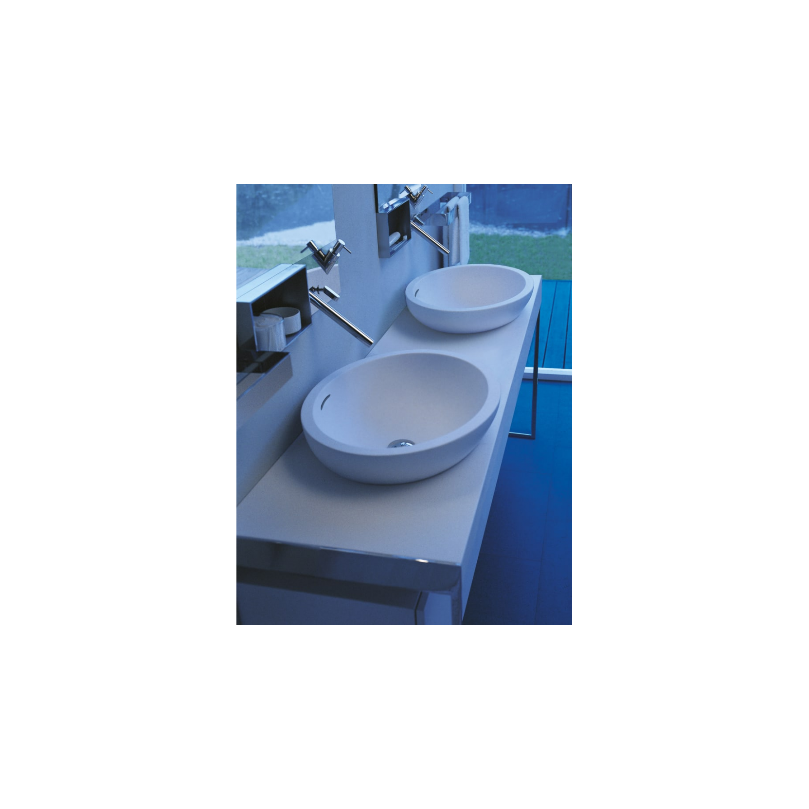 Spoon XL presenta invaso ovale ampio e profondo in Cristalplant® biobased bianco monocolore o bicolore grigio chiaro/scuro, dimensioni 63,8 cm lunghezza, 49 cm larghezza, 17,6 cm altezza, senza foro rubinetto ma con foro per troppo pieno, utilizzabile con piletta .MET0346P, .MET0562 o sifone per semincasso. Montaggio da appoggio su piano o semincasso per composizioni versatili, materiale caldo e piacevole al tatto conserva eleganza essenziale, parte della famiglia Spoon XL che include vasca coordinata
