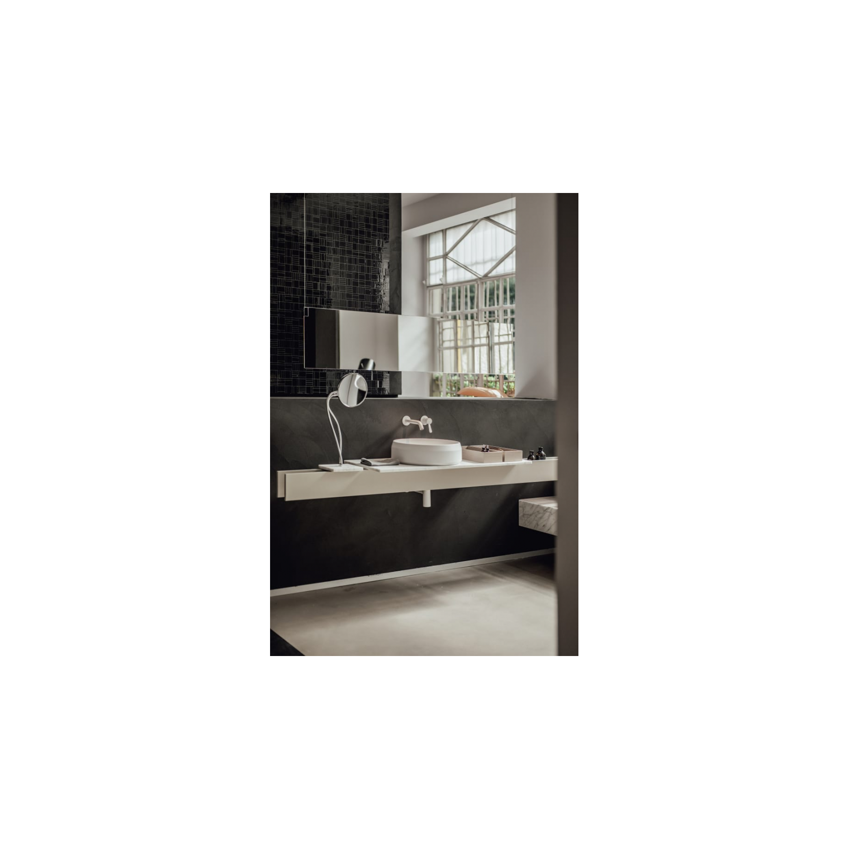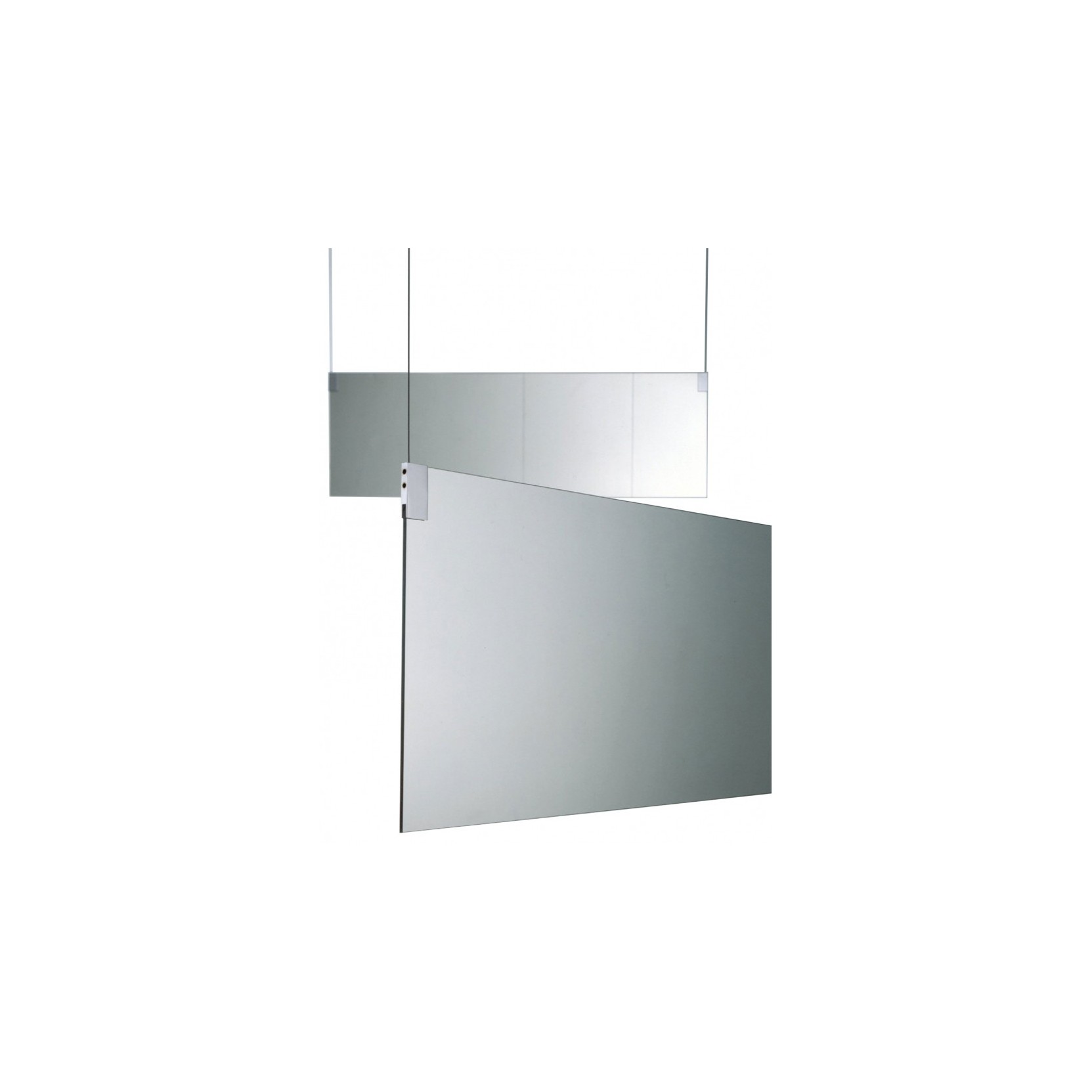 Insegna è un grande pannello specchiato realizzato in vetro da 3+3 mm con pellicola di sicurezza, ottenendo un elemento leggero ma sicuro, con bordo levigato e finitura lucida che ne enfatizza la superficie riflettente. Il kit di fissaggio include supporti e cavi in acciaio inox lucido, pensati per un montaggio a soffitto con viti e tasselli standard, che permettono di posizionare lo specchio a distanza regolata dal piano sottostante (bagno, ingresso, zona futile, ecc.). La struttura è bifacciale: entrambe le superfici specchiate permettono una visione da due lati, ideale in corridoi, tra zona lavabo e parete o come elemento di rottura spaziale tra ambiente bagno e zona oltre specchio. Le dimensioni indicano un’altezza fissa di 40 cm e una larghezza variabile, con opzioni “da catalogo” che vanno da 80 cm fino a 180 cm (ASPE015–ASPE019), mentre misure intermedie possono essere richieste su ordinazione. Insegna è disponibile senza illuminazione integrata ed è concepito per essere illuminato da luci a parete o plafoniere, che ne enfatizzano il profilo sospeso rendendolo un elemento scultoreo oltre che funzionale.