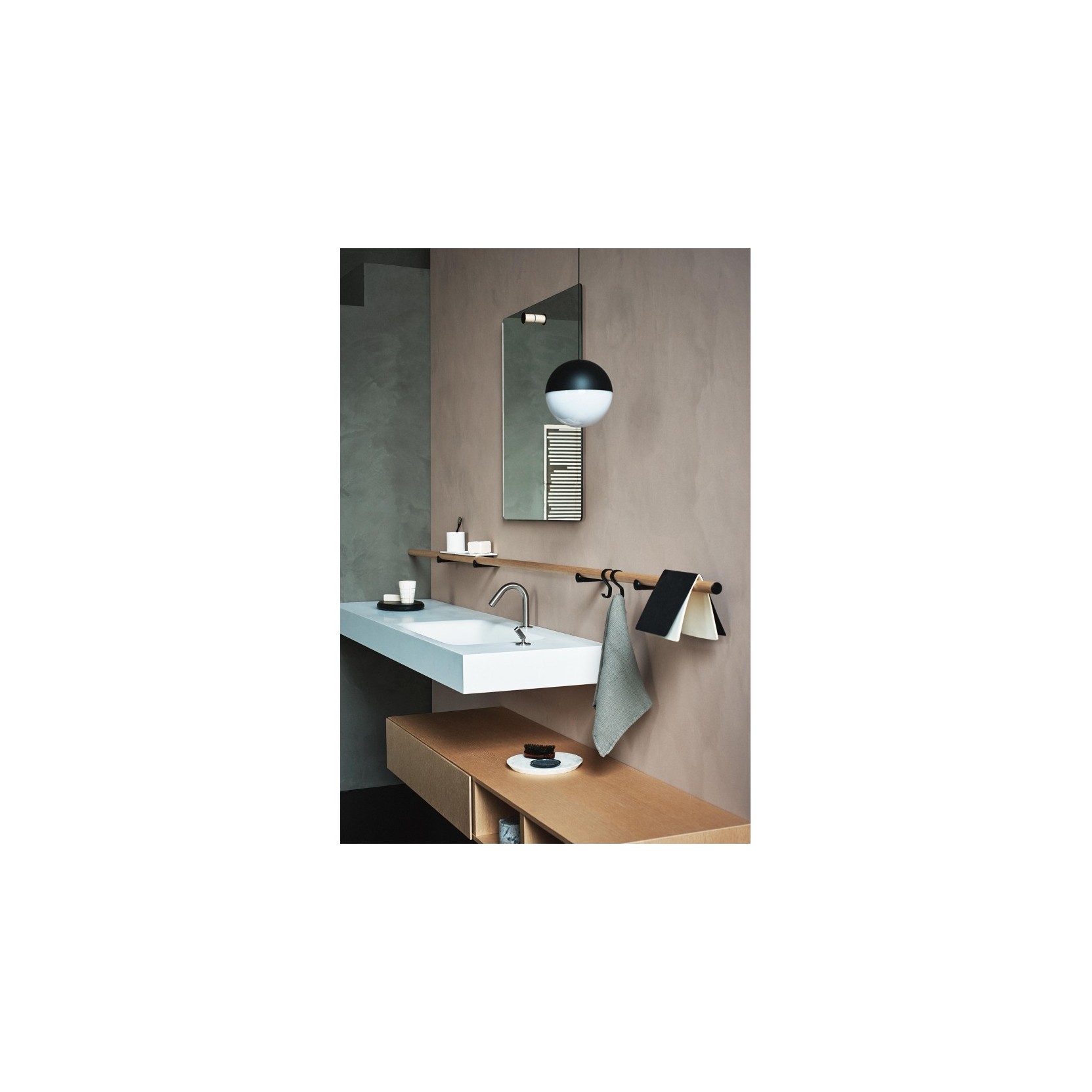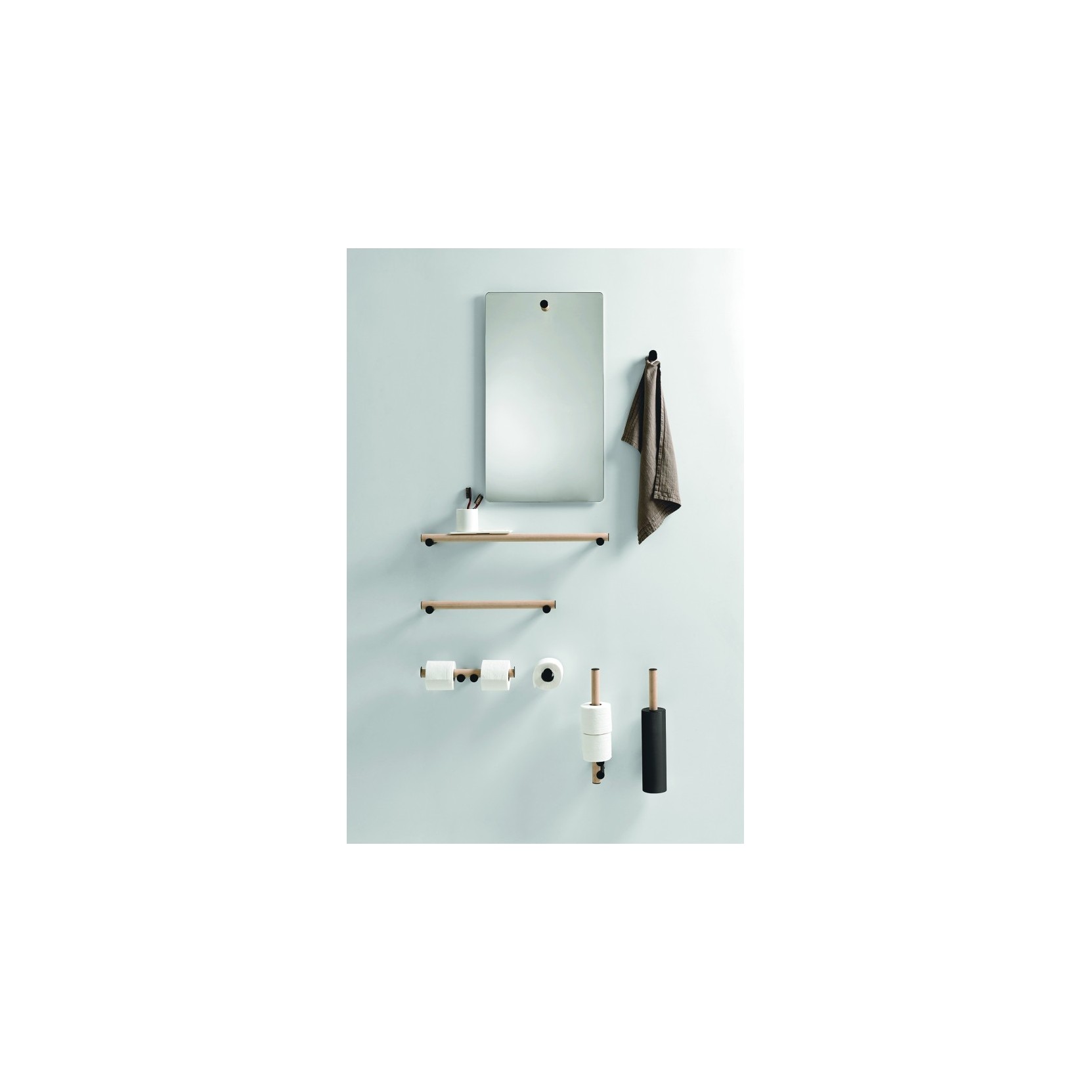 Dot Line è composto da un pannello specchiato rettangolare, con bordo levigato e finitura a filo, montato su una struttura verticale in alluminio anodizzato spazzolato nero oppure in alluminio con rivestimento in legno di rovere naturale, bruno o scuro. Il sostegno, che si allineala in altezza con lo specchio, funge sia da elemento strutturale sia da segno grafico, richiamando il tema della linea e del punto che caratterizza tutta la collezione Dot Line di Agape (accessori, portasalviette, mensole, luci a parete). Lo specchio è fissato a parete mediante viti e tasselli ad espansione, forniti nel kit, e può essere installato in posizione verticale o orizzontale a seconda della configurazione ambiente. Le dimensioni tipiche del modulo segnalato dai cataloghi sono circa 110 cm di altezza, 65 cm di larghezza e 7,8 cm di profondità, realizzato in pannello MDF con superficie riflettente e bordo lucido. La versione descritta è senza luce integrata, concepita per essere illuminata da luci a parete o soffitto che mettano in risalto il profilo del sostegno, trasformando Dot Line in un elemento compositivo che unisce funzione e segno grafico in bagni minimali, contract o residenziali contemporanei.