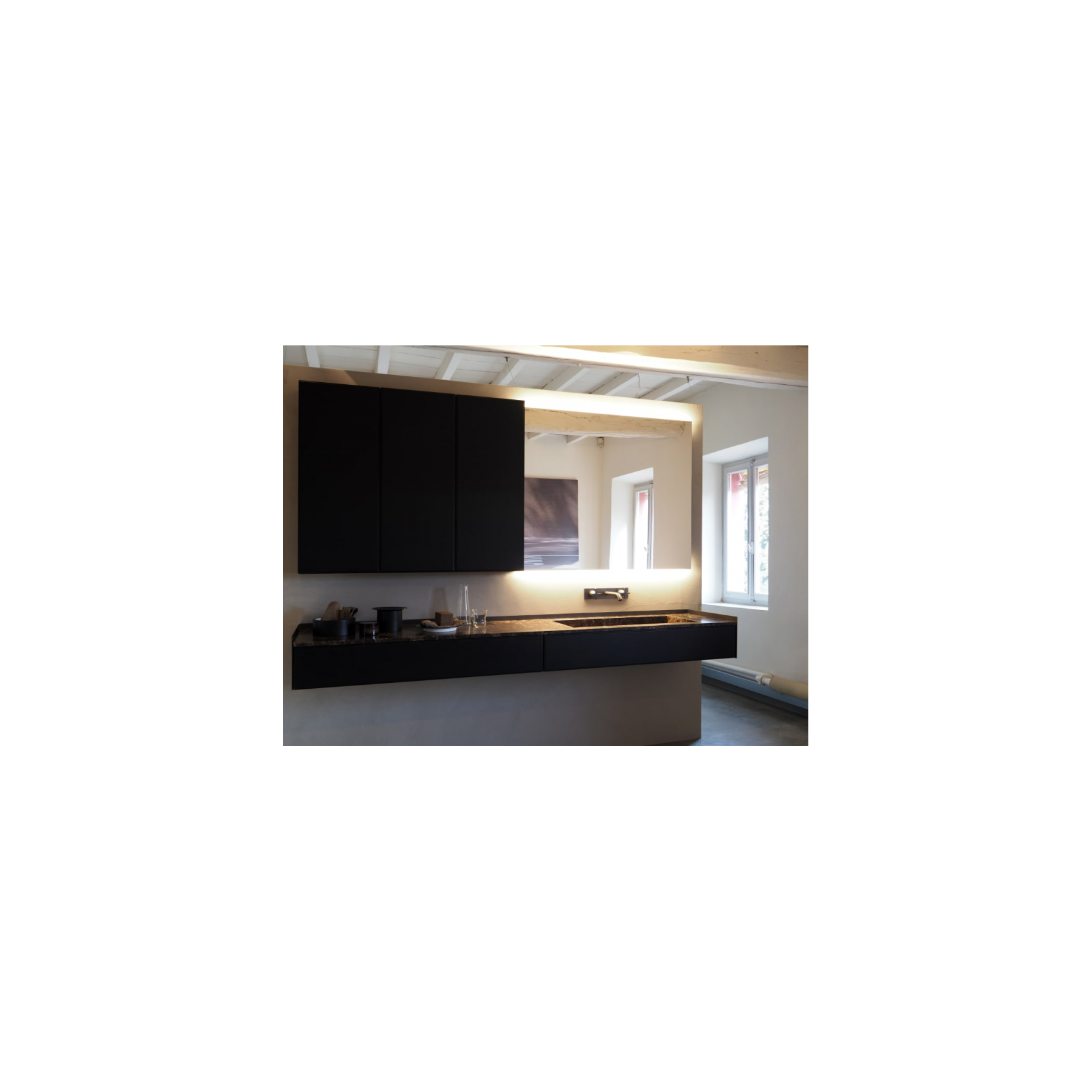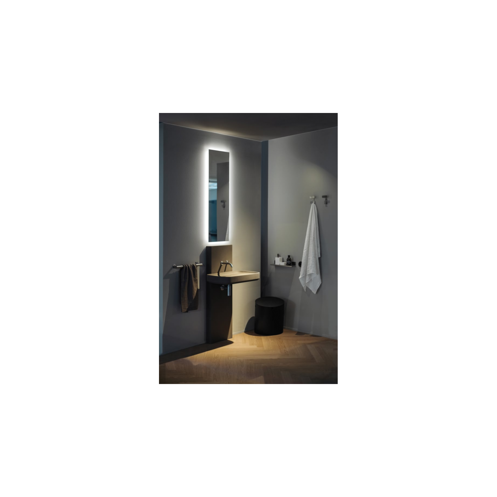Nudo LED è realizzato come un pannello specchiato rettangolare, con bordo levigato e pellicola di sicurezza sul retro che ne aumenta la robustezza mantenendo un profilo sottile e discreto, con una profondità di circa 3 cm dal muro. La luce LED è integrata in una fascia sul perimetro dello specchio: è possibile richiederla su uno o più lati (orizzontale superiore, inferiore, verticale destro o sinistro) oppure, in alcune configurazioni, su tutti e quattro i lati, creando un effetto di cornice luminosa soft attorno alla superficie riflettente. Lo specchio è alimentato a 220 V, con versione 110 V disponibile aggiungendo la lettera U al codice, e include un interruttore incorporato per il controllo della fascia LED. Il fissaggio a parete avviene con il kit di viti e tasselli ad espansione, con possibilità di montaggio sia in orizzontale sia in verticale, per adattarsi a differenti layout di bagno, ingresso o cabina armadio. Le dimensioni indicate dal catalogo vanno da altezze di 40 cm o 120 cm a larghezze che partono da 35 cm fino a 240 cm, con opzioni su misura su preventivo. Nudo LED può essere accostato alla versione Nudo senza luce, sfruttando il diverso spessore dei due elementi per creare giochi di luce sulla superficie riflettente, eventualmente arricchiti con una fascia riflettente bianca (AELE001_) quando un lato luminoso è affiancato a uno normale.