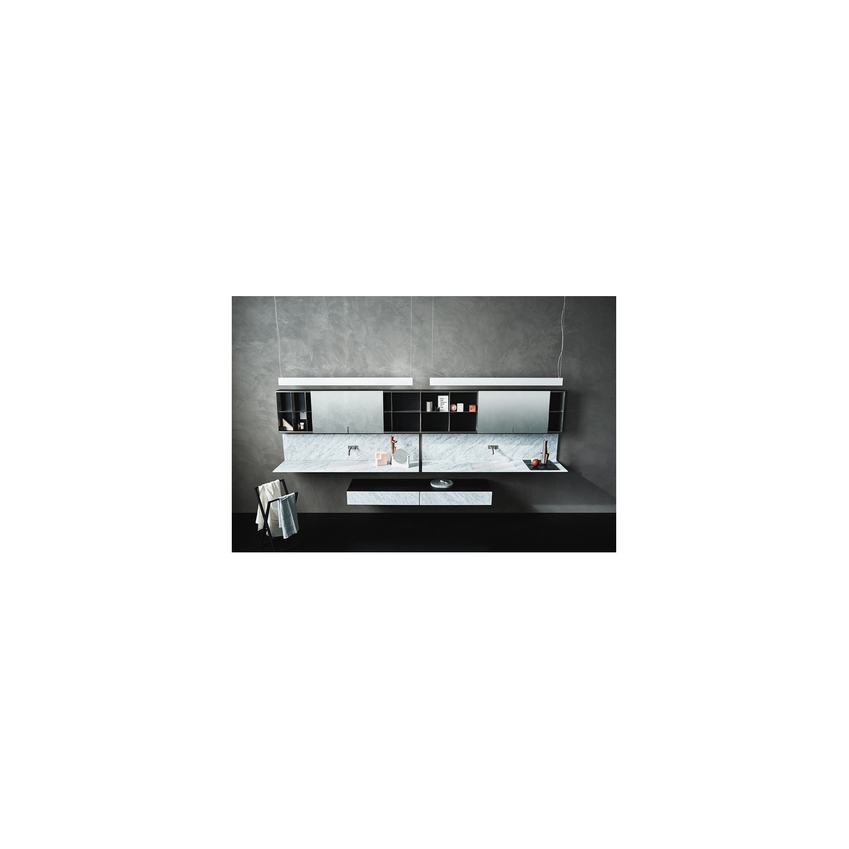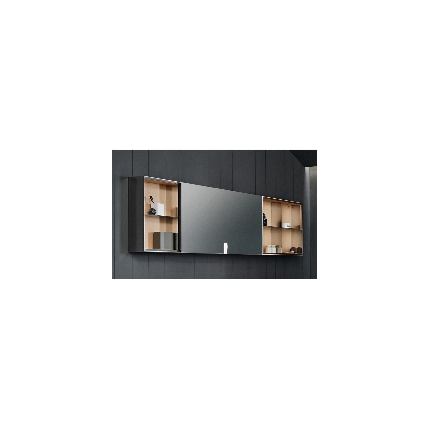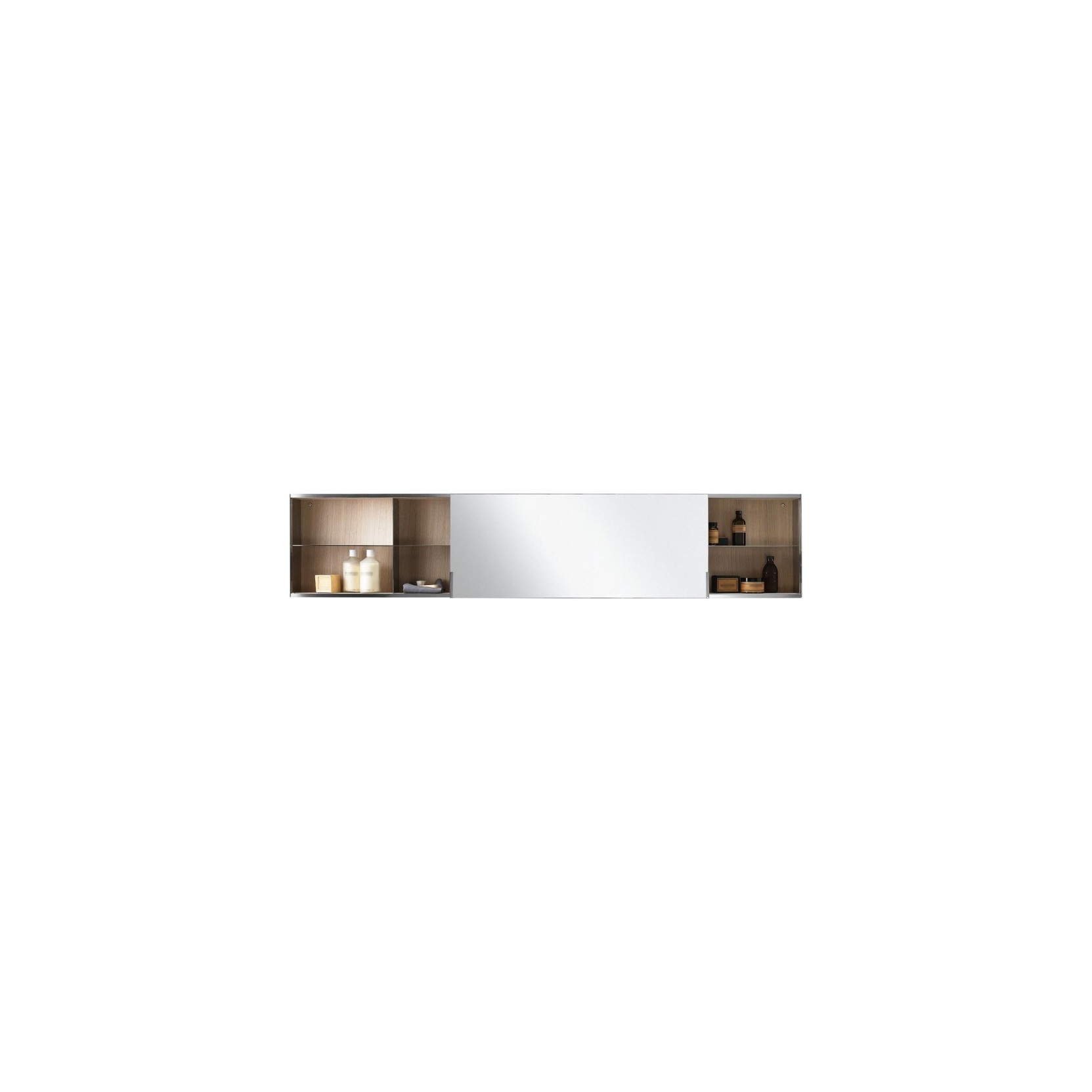 027 è realizzato in multistrato di betulla con rivestimento in rovere naturale, bruno, scuro o legno precomposto teak, con anta frontale in vetro specchiato 3 mm pellicolato per la sicurezza. L’anta scorre lateralmente su guide metalliche incorporando riflessione e accesso ai ripiani interni in acciaio inox, progettati per accogliere accessori e prodotti da bagno. Il contenitore è fissato a parete con viti e tasselli, con altezza 60 cm, profondità 16 cm e larghezza regolabile (oltre 120,6 cm fino a 220,6 cm e su misura). Divisori e maniglia in acciaio inox lucido o satinato definiscono l’estetica interna, mentre il telaio in legno garantisce stabilità. La versione senza luce si affida alla luce ambientale, ma alcune configurazioni contemplano LED integrati lungo il perimetro o sui ripiani.