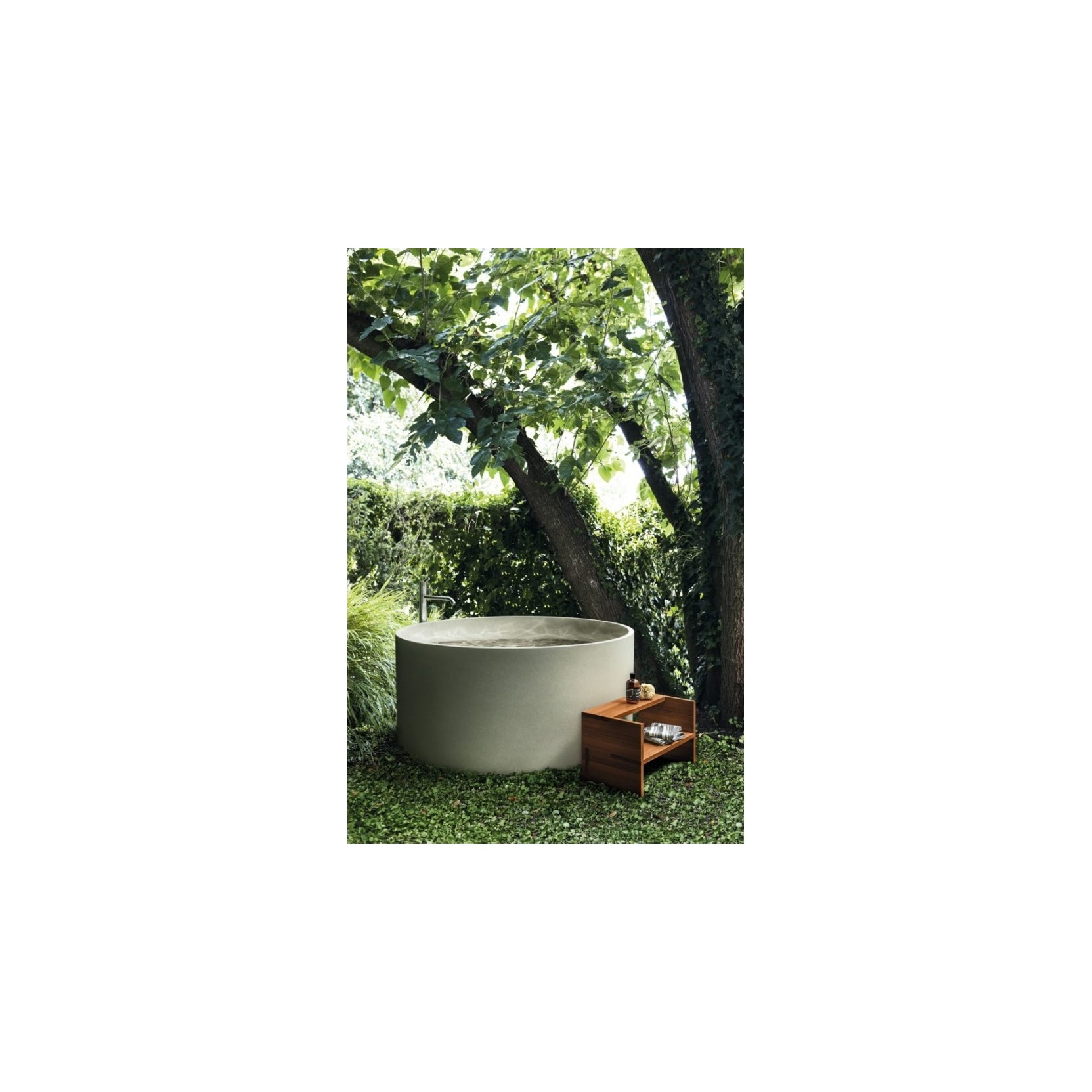 La vasca In‑Out Cemento è realizzata in Cementoskin®, un compost di cemento colorato in pasta con elevata resa strutturale, con dimensioni di circa 130×130 cm di diametro e 58 cm di altezza, e un peso intorno ai 235 kg, con imballaggio industriale molto robusto. L’invasso è tondo, con pareti leggermente inclinate e una capacità di circa 465 litri, mentre il troppo pieno è integrato nella piletta cromata MET0722 inclusa, con scarico consigliato tramite pozzetto specifico (AKITPZVAS). È disponibile in diverse colorazioni – tra cui rosso mattone, verde, grigio chiaro, grigio scuro e caffè – pensate per adattarsi a contesti residenziali, hotel o garden spa, sia installata su pavimento che semi‑incassata in basamento. La serie In‑Out fa parte della famiglia di vasche circolari Agape (che comprende versioni in solid surface e marmo); la versione in cemento rafforza il legame tra architettura, materiali e ambiente esterno, trasformando il bagno in un’esperienza “immersa” nel paesaggio.
