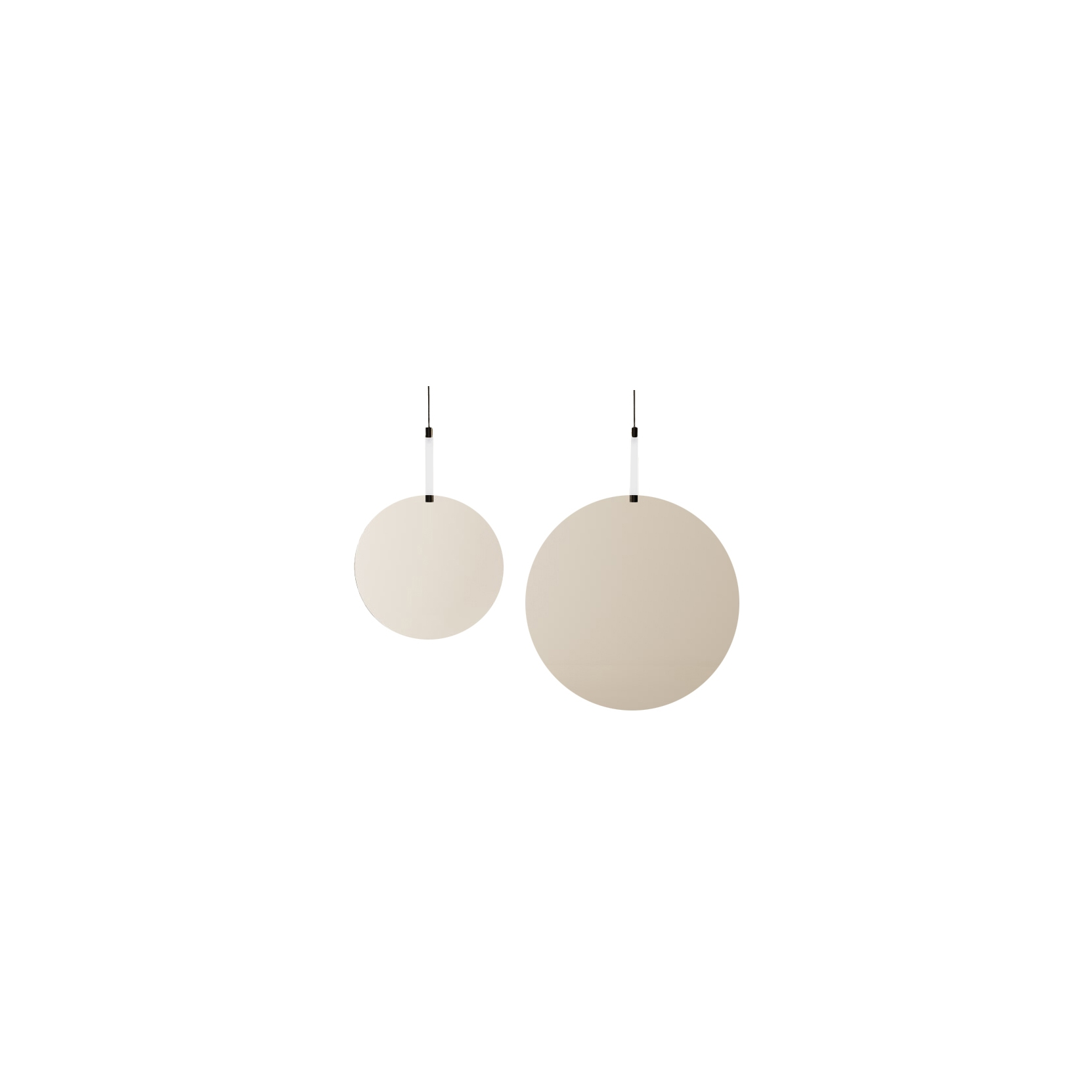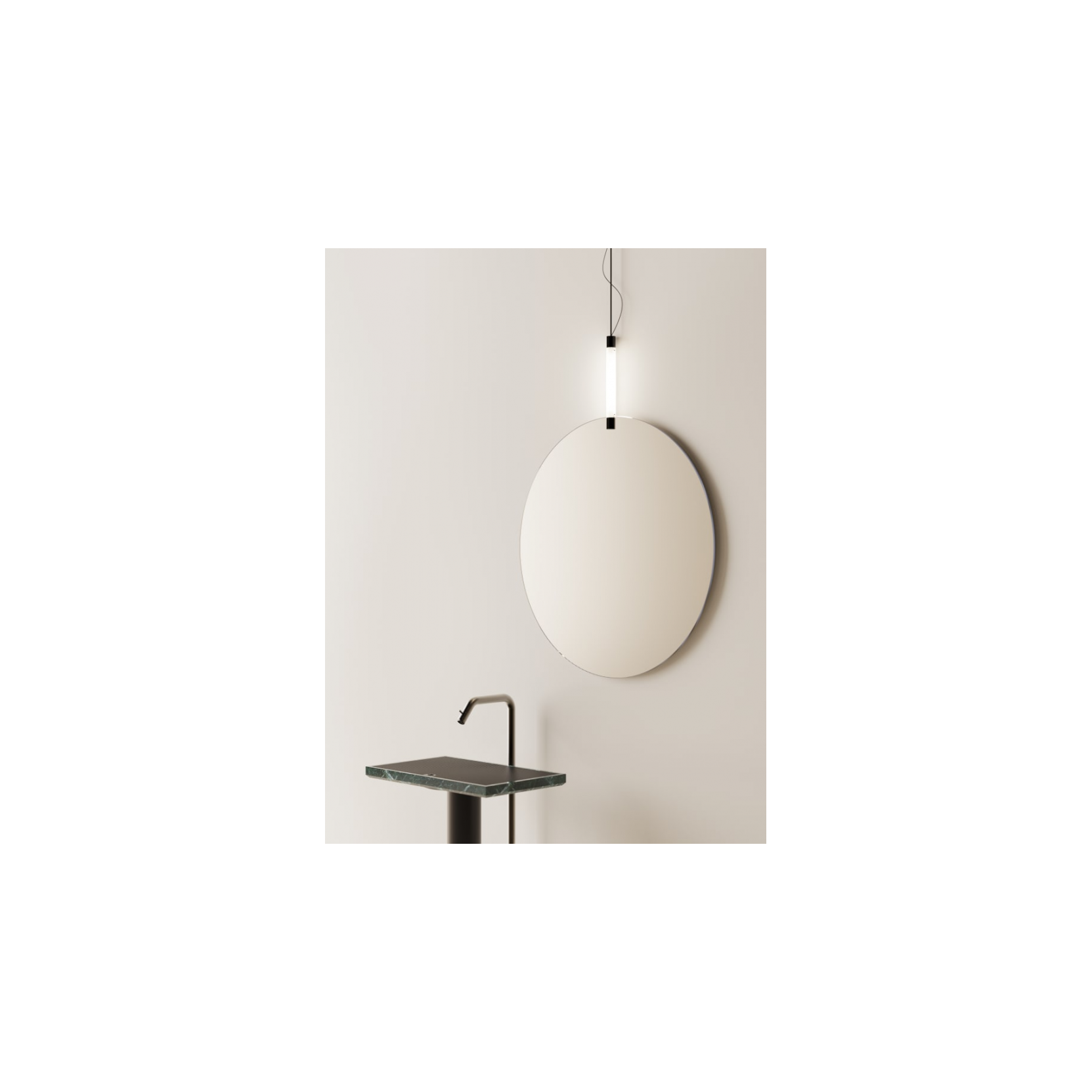Faro con luce è uno specchio tondo sospeso a parete, disponibile in diametro 60 cm e 90 cm, con un elemento centrale in policarbonato satinato e alluminio anodizzato nero che illumina l’intero specchio in modo omogeneo. Lo specchio resta staccato dalla parete grazie a un cavetto in acciaio e un rosone a soffitto che nasconde l’alimentazione, per un impianto minimal e molto ordinato.