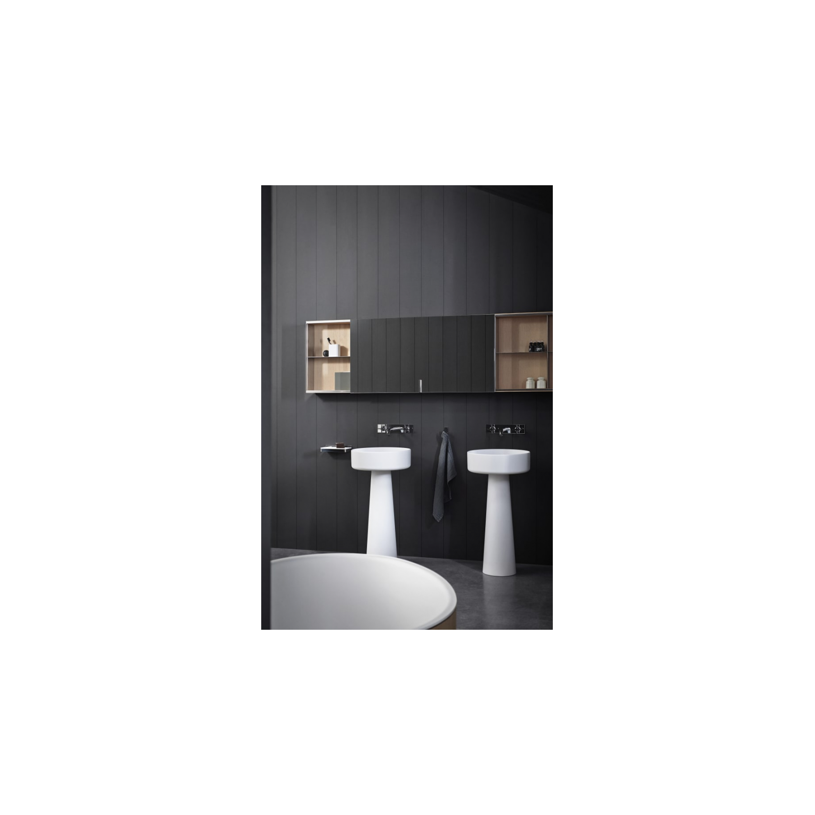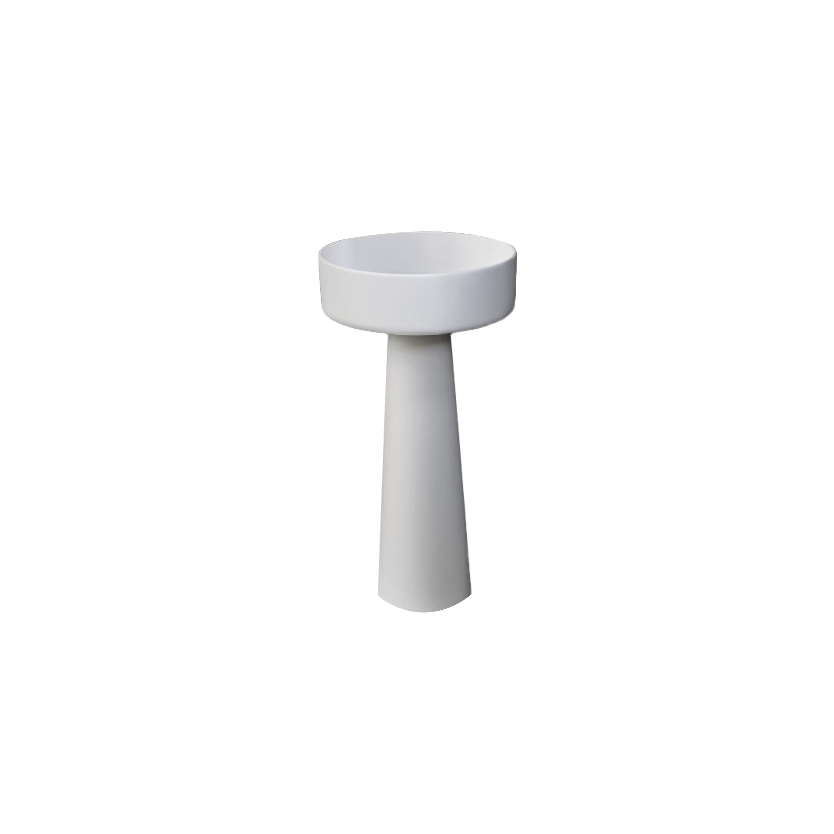 Bjhon 1 a colonna è un lavabo in Cristalplant® biobased, marmo (Bianco Carrara, grigio Carnico, nero Marquina, verde Alpi) o cemento colorato in pasta, con bacino cilindrico e installazione a scarico libero, con rubinetteria a parete. La colonna è in acciaio inox verniciato in nero o bianco, con diversi tipi di scarico (parete, isola, “outdoor”) che permettono di adattare il pezzo a nicchie, controsoffitti o aree esterne, mantenendo sempre la stessa presenza materica e “volumetrica”.