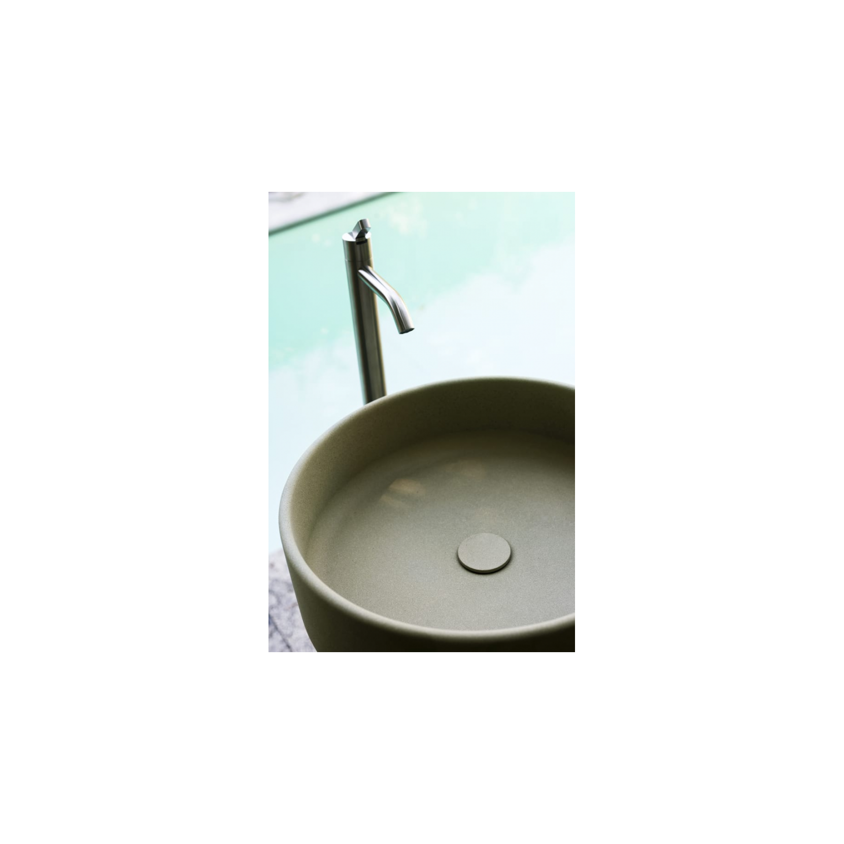 BJHON 1 è un lavabo freestanding progettato da Angelo Mangiarotti per Agape, disponibile in marmo Petit Granit oppure in Cementoskin® nelle varianti pensate per esterno. La colonna tronco‑conica sostiene un bacino circolare e dà al pezzo una presenza scultorea molto forte, adatta a bagni outdoor, terrazzi e spazi wellness.