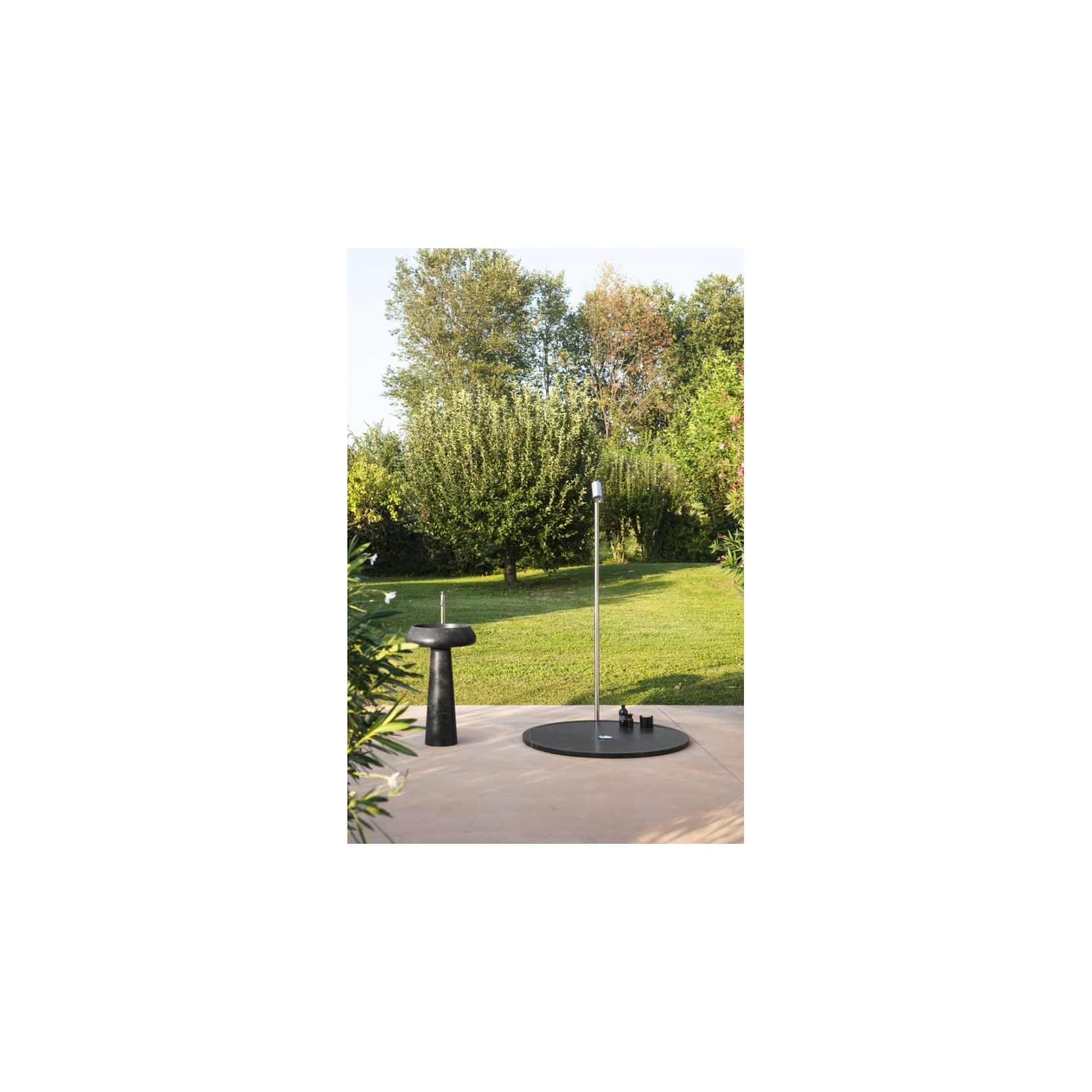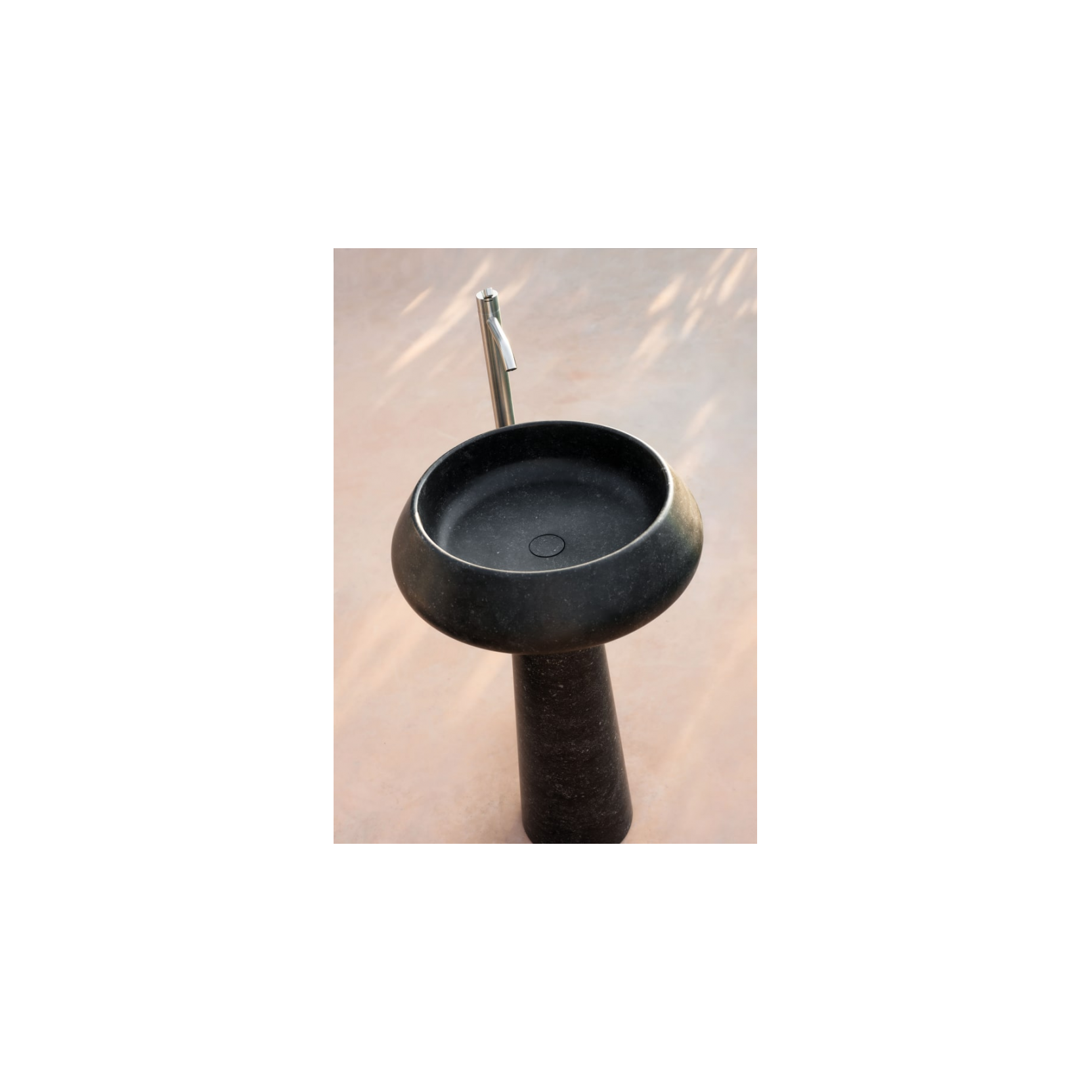 Dal punto di vista tecnico, il lavabo a colonna Bjhon 2 Outdoor ha un diametro di circa 54,5 cm e un’altezza di 90 cm, con bacino cilindrico senza foro per rubinetto e installazione a scarico libero, predisposto per scarico a pavimento con l’uso del sifone MET0475 obbligatorio. La versione outdoor in Petit Granit è pensata per l’uso in esterno, con una struttura che integra lo scarico nella colonna, permettendo un montaggio a isola o contro una parete con apertura posteriore per i collegamenti idrici quando necessario. Il lavabo è fornito con kit di fissaggio e piletta MET0563 coordinata alla finitura del materiale, in grado di gestire l’acqua in modo ordinato e di convivere con esposizione a sole, gelo e agenti atmosferici, grazie alla robustezza e alle caratteristiche del marmo scelto. Bjhon 2 nasce da un’idea del 1970 reinterpretata per il contemporaneo, dove il lavabo diventa un oggetto di architettura più che un semplice sanitario, ideale per residenze di lusso, hotel e progetti wellness che vogliono dialogare con l’esterno.