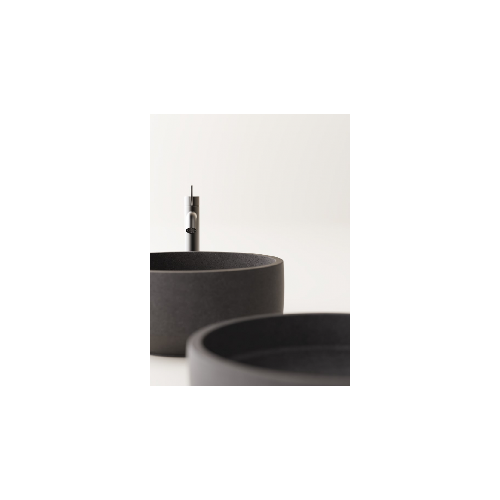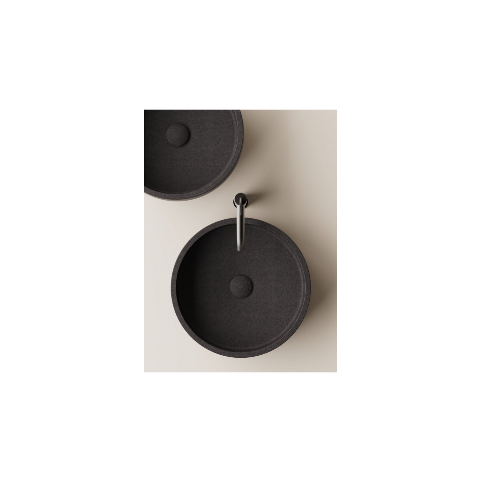 Cenote Lava è un lavabo d’appoggio firmato da Patricia Urquiola per Agape, pensato come un oggetto scultoreo al centro del bagno. Il bacino tondo in pietra lavica ricotta, disponibile in due dimensioni, si presenta senza foro per rubinetto e a scarico libero, con piletta inclusa nella stessa finitura del materiale. Ogni pezzo è unico, lavorato artigianalmente da un unico blocco di pietra lavica, e porta un’atmosfera materica, rustica e sensoriale in bagni contemporanei, SPA e spazi contract che giocano sul contrasto tra naturalità e design.